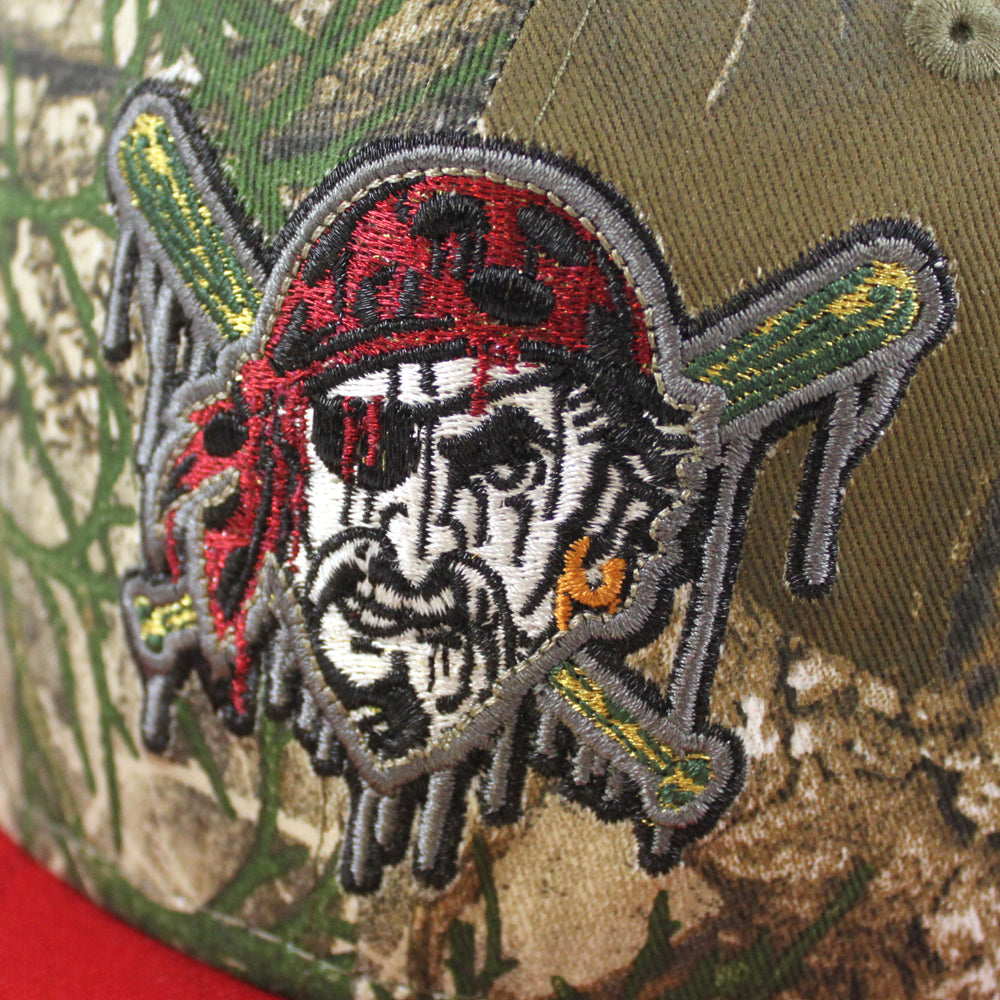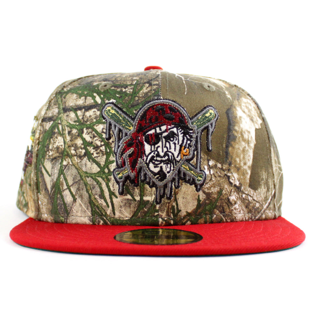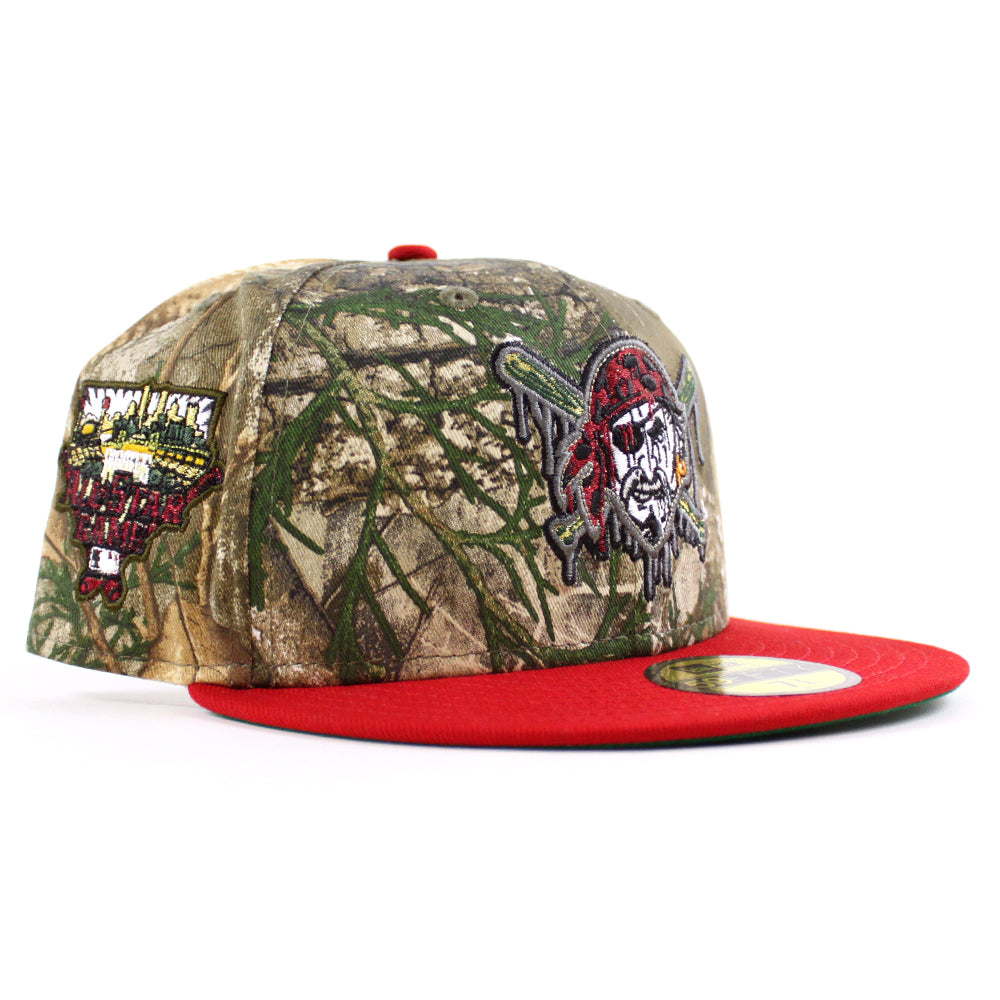 Pittsburgh Pirates Drip Logo 2006 All Star Game 59Fifty New Era Fitted Hats in RealTree Camo, Scarlet Red and Green Under Brim.