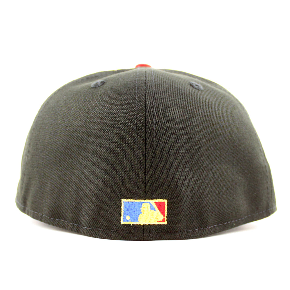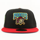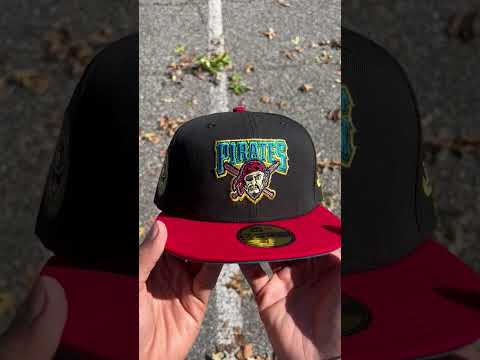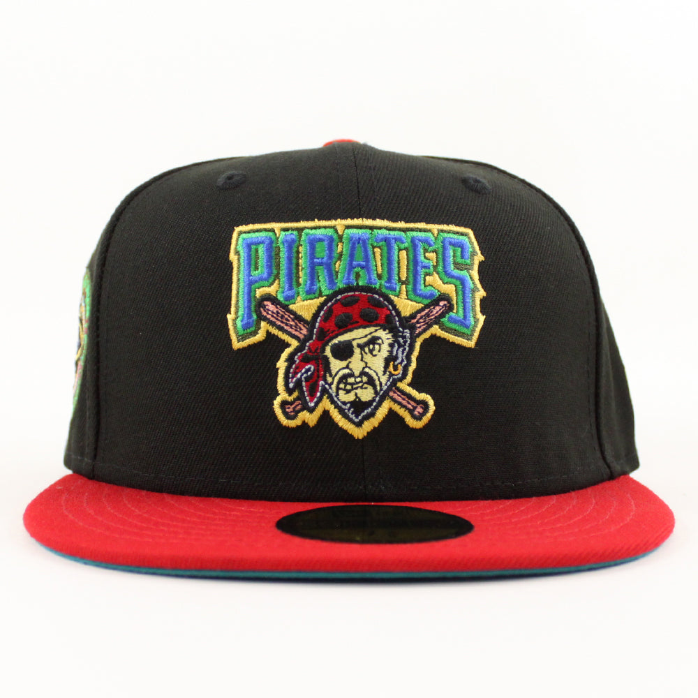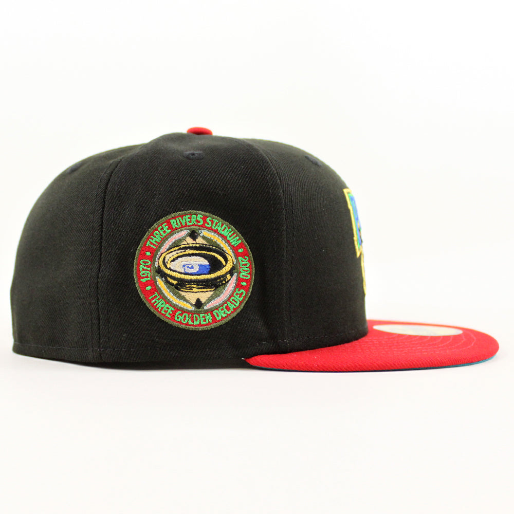 Pittsburgh Pirates Three Rivers Stadium 59Fifty New Era Fitted Cap in Black, Scarlet and TitleWave Under Brim.