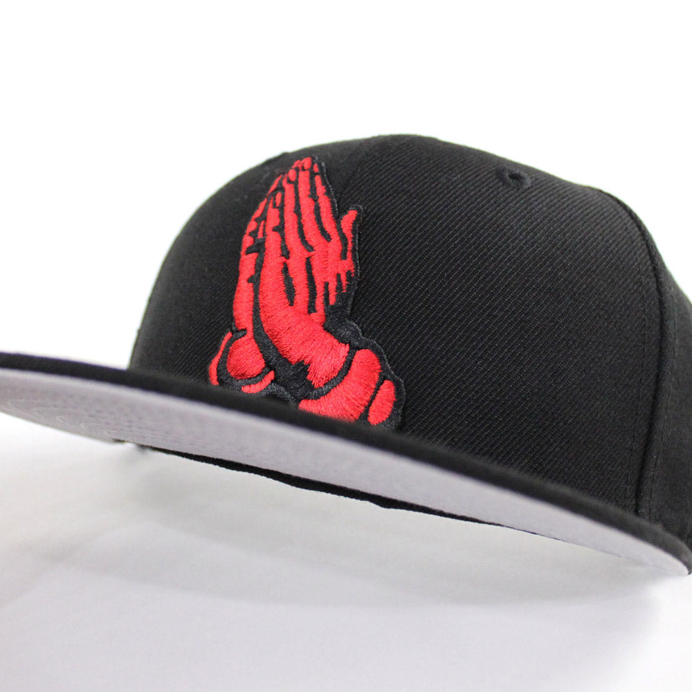 Long time since we made Praying Hands New Era Fitted Cap…. This Praying Hands New Era 59Fifty Fitted Hat is for those who believe in a higher power! Pray for the best pray for the weak just don't become the prey! Praying Hands in Black, Red & Gray Under Brim. Now available online & in-store!