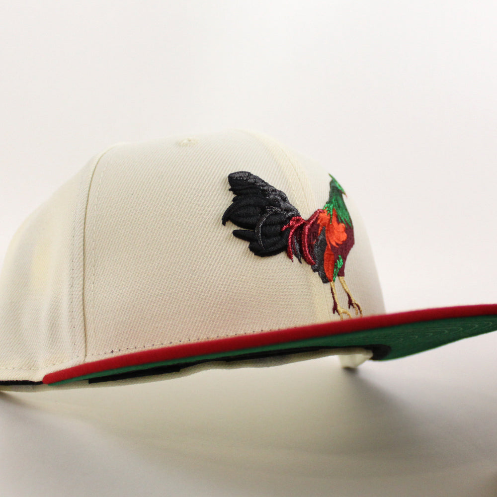 ROOSTER New Era 59Fifty Fitted Cap in Chrome White, Scarlet Red and Kelly Green Under Brim.