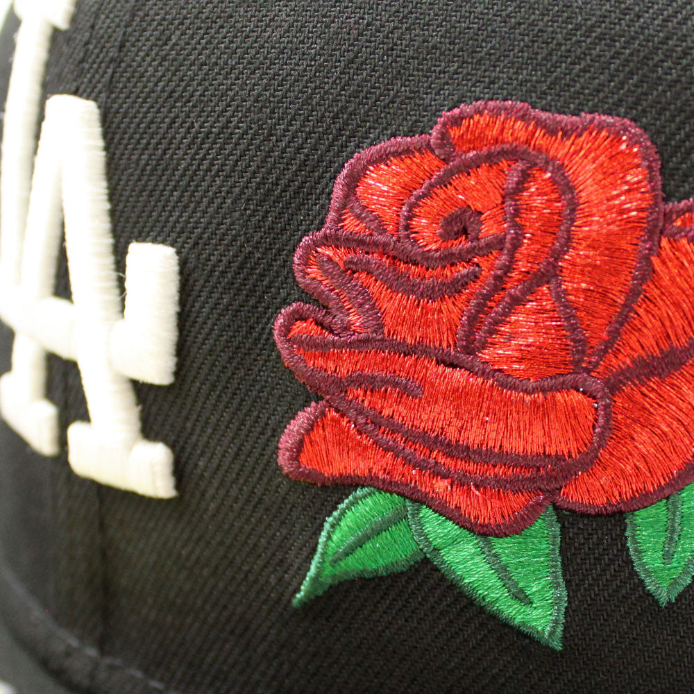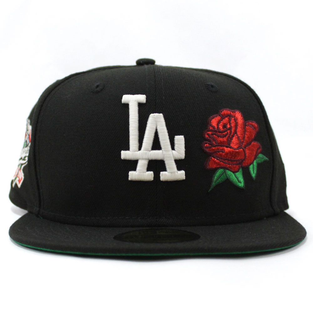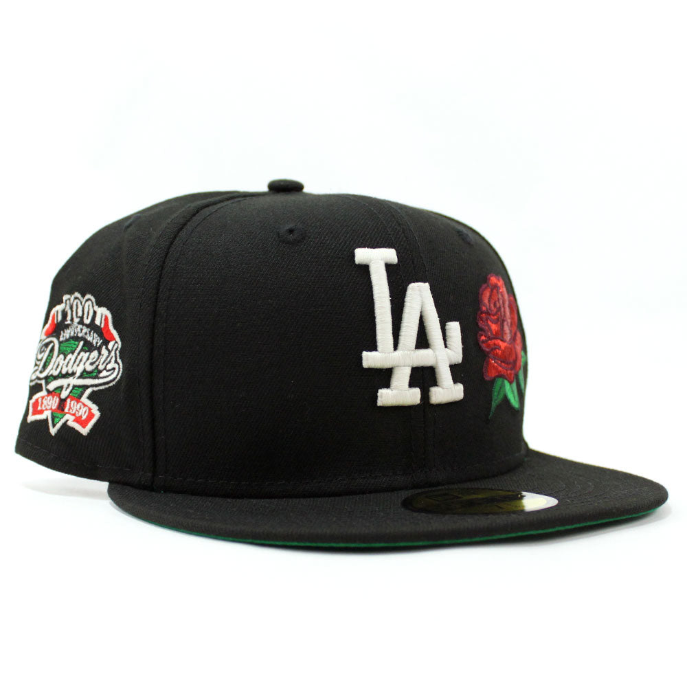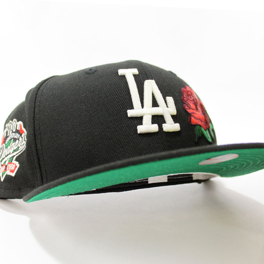 Los Angeles Dodgers 100 Anniversary New Era 59Fifty Fitted Hat in Rose Black with Green Under Brim.