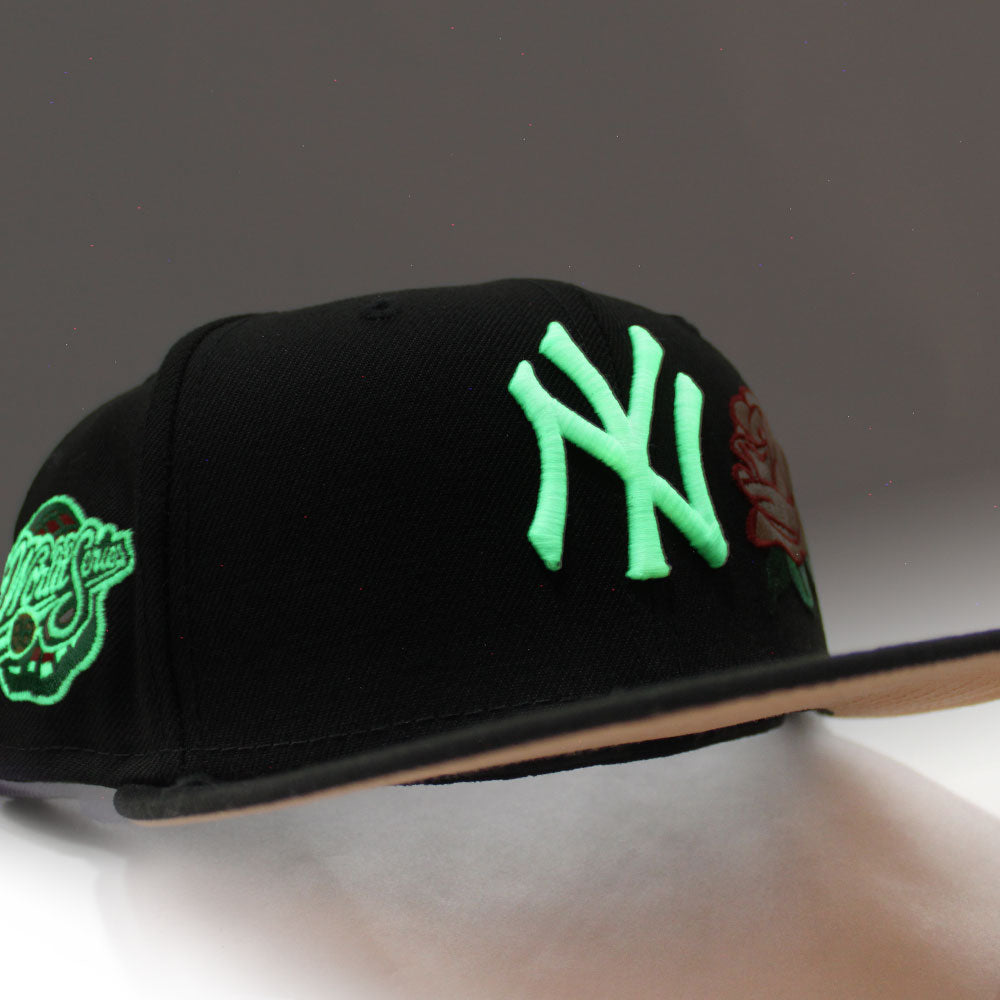 Rose New York Yankees 1998 World Series New Era 59Fifty Fitted Hat (Glow in the Dark Black Peach Under Brim)