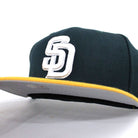 This San Diego Padres New Era 59Fifty fitted hat is done in the Oakland Athletics team color way. The Crown is hunter green with a yellow brim. THe under brim is gray and the logo is white. A's COLORS Way