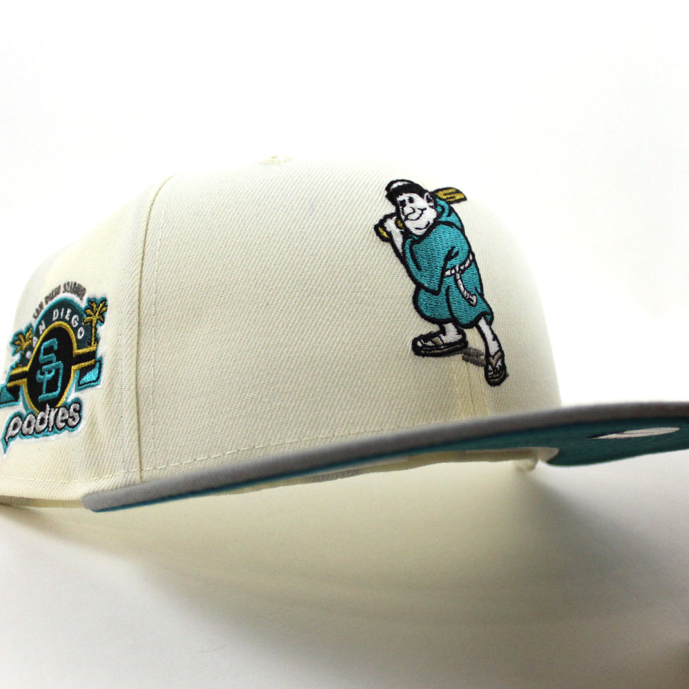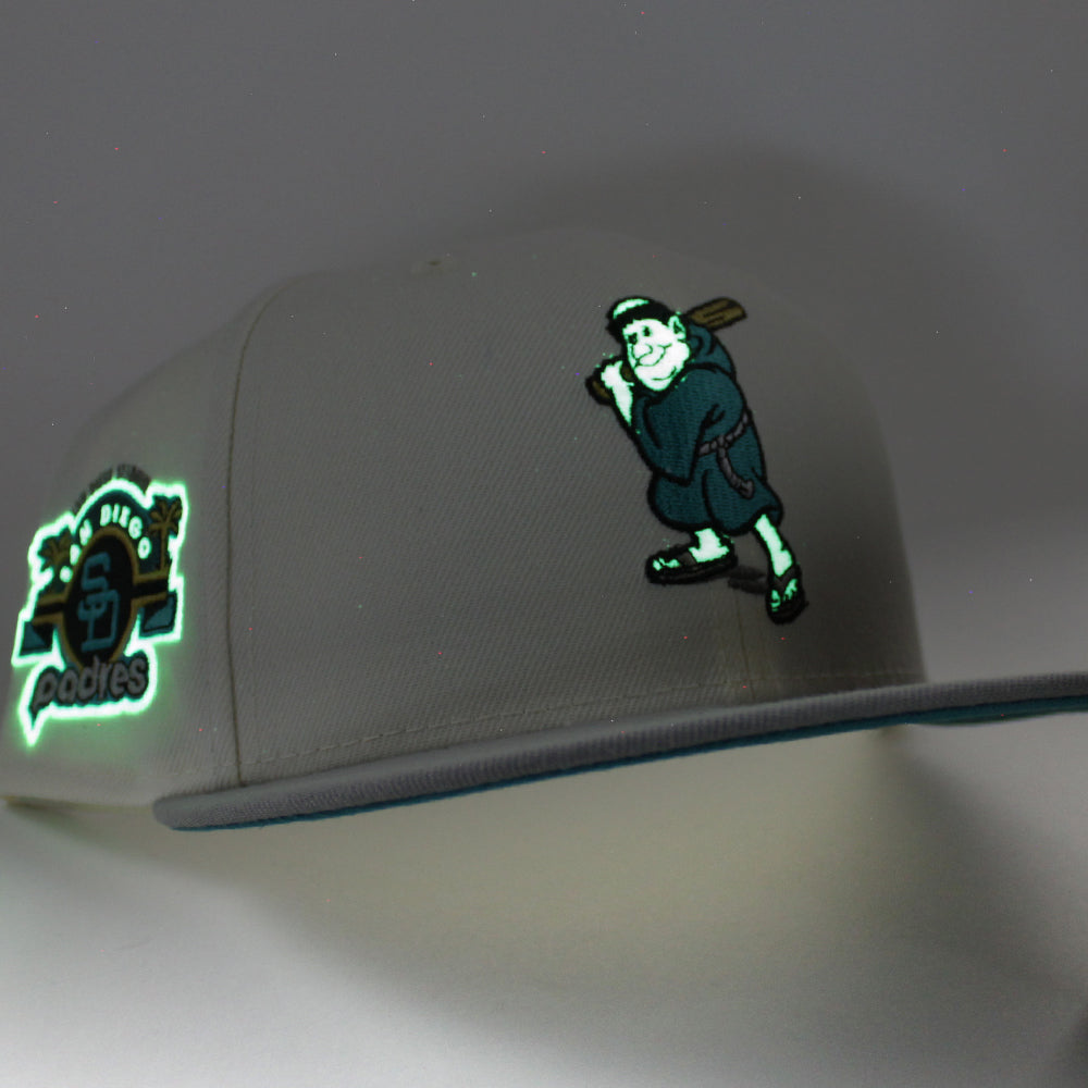 San Diego Padres STADIUM New Era 59Fifty Fitted Hat (Glow in the Dark Chrome White Misty Morning Aqua Under Brim)