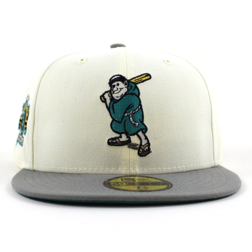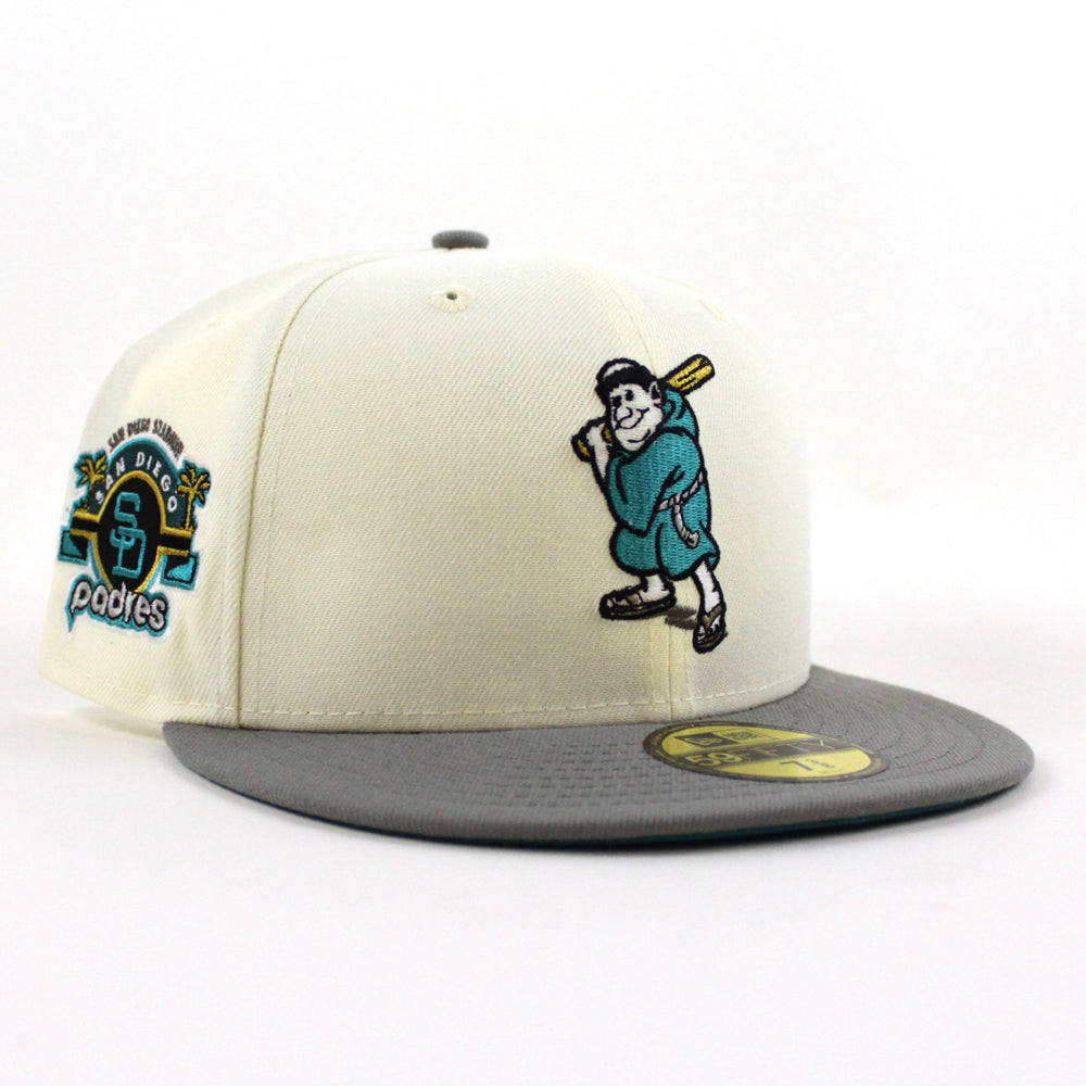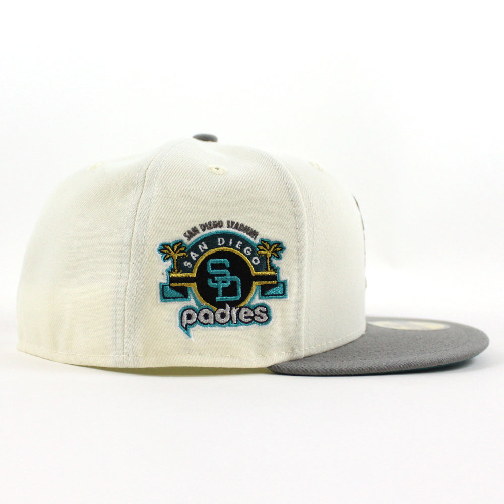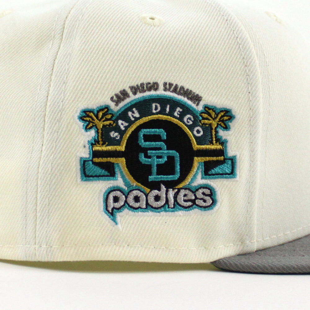 San Diego Padres Stadium New Era 59Fifty Fitted Cap in Chrome White, Misty Morning and Aqua Under Brim.