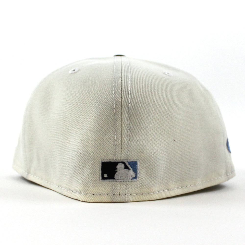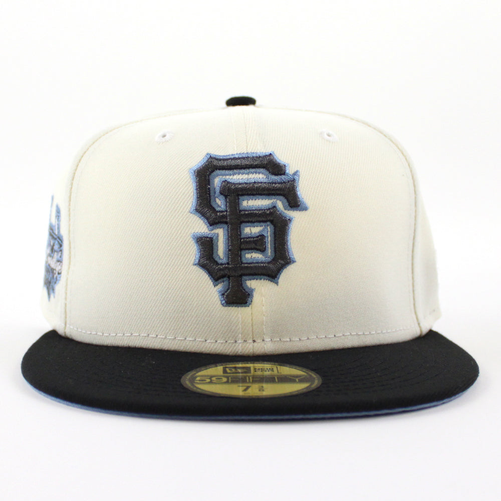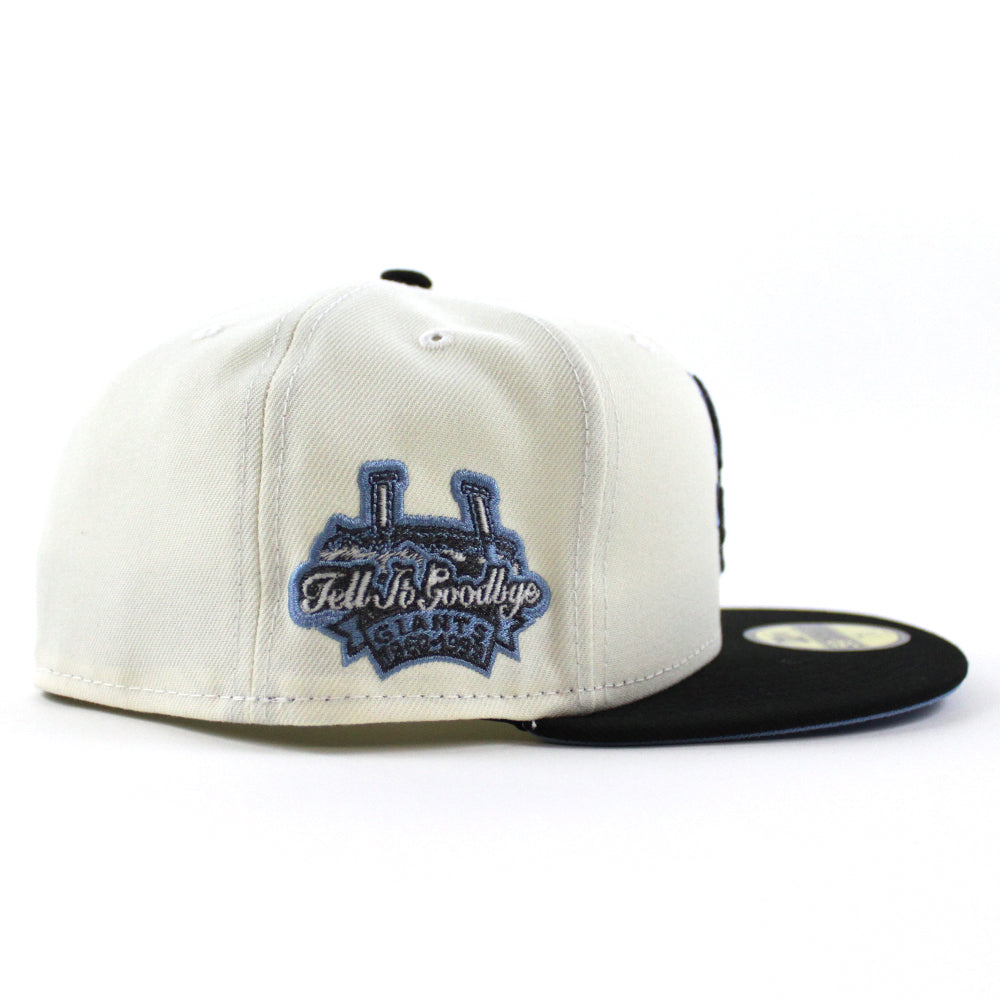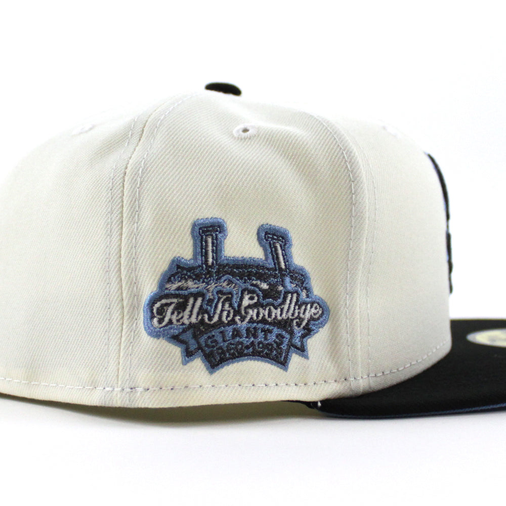 San Francisco Giants 1960 99 TELL IT GOODBYE New Era 59Fifty Fitted Hat in Chrome White (Cream) with Sky Blue Under Brim.