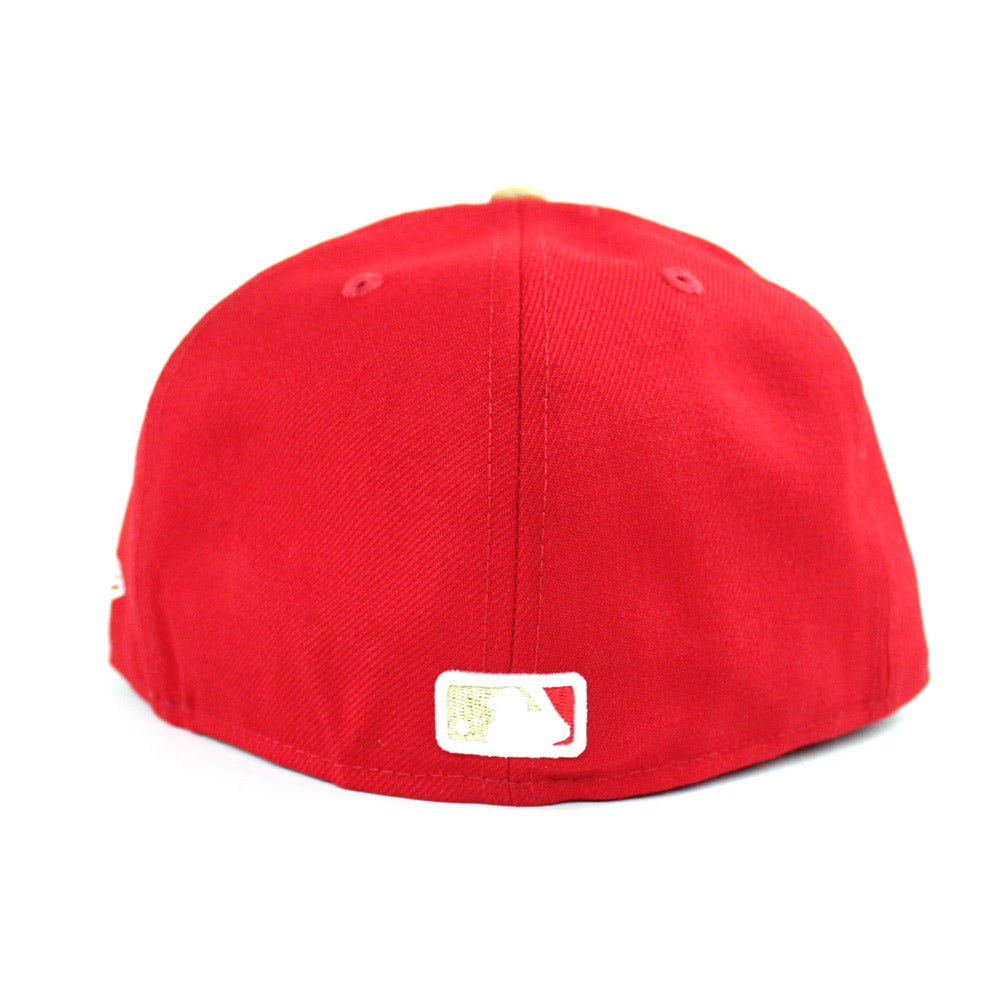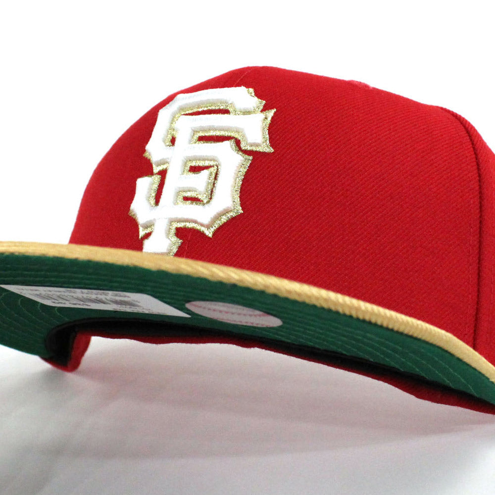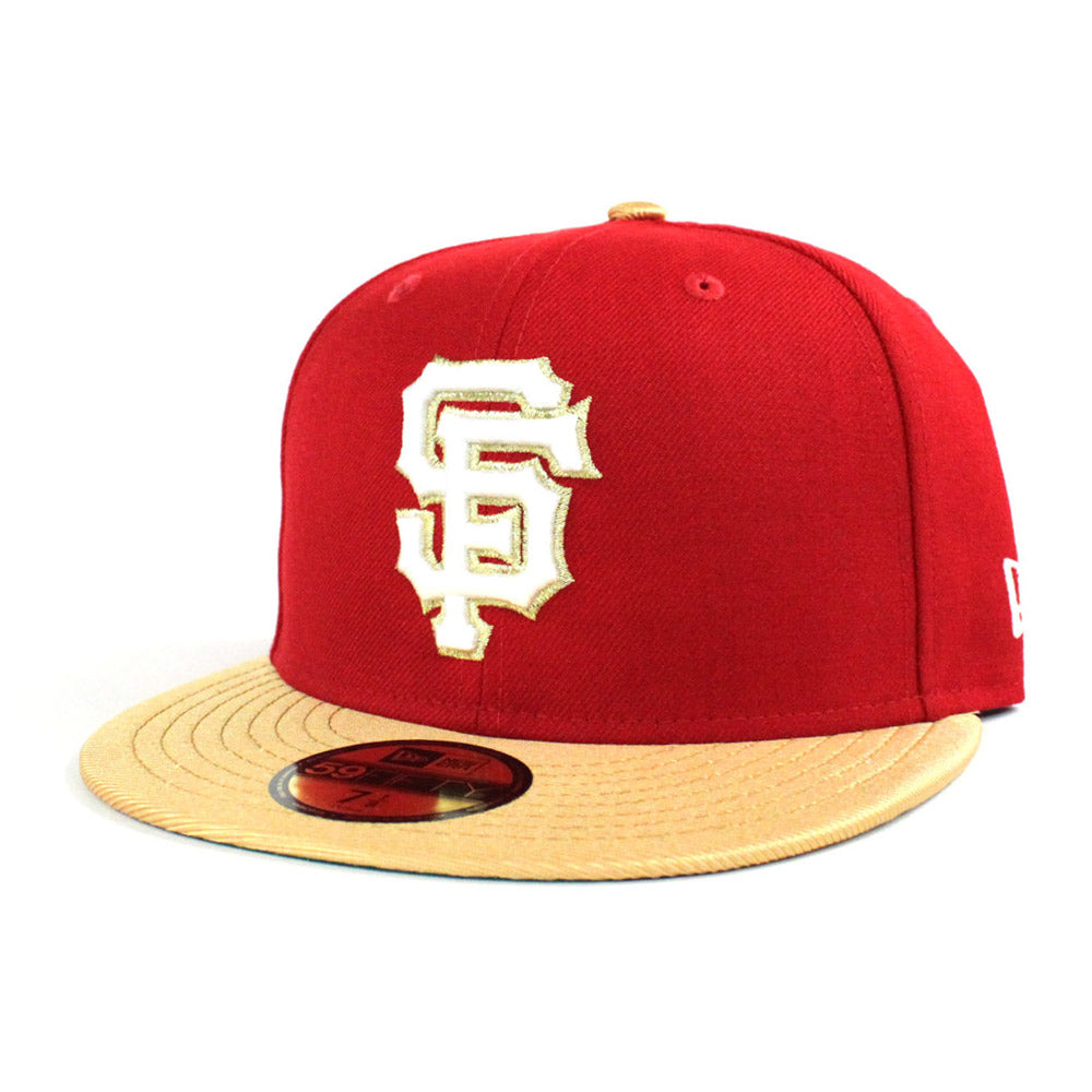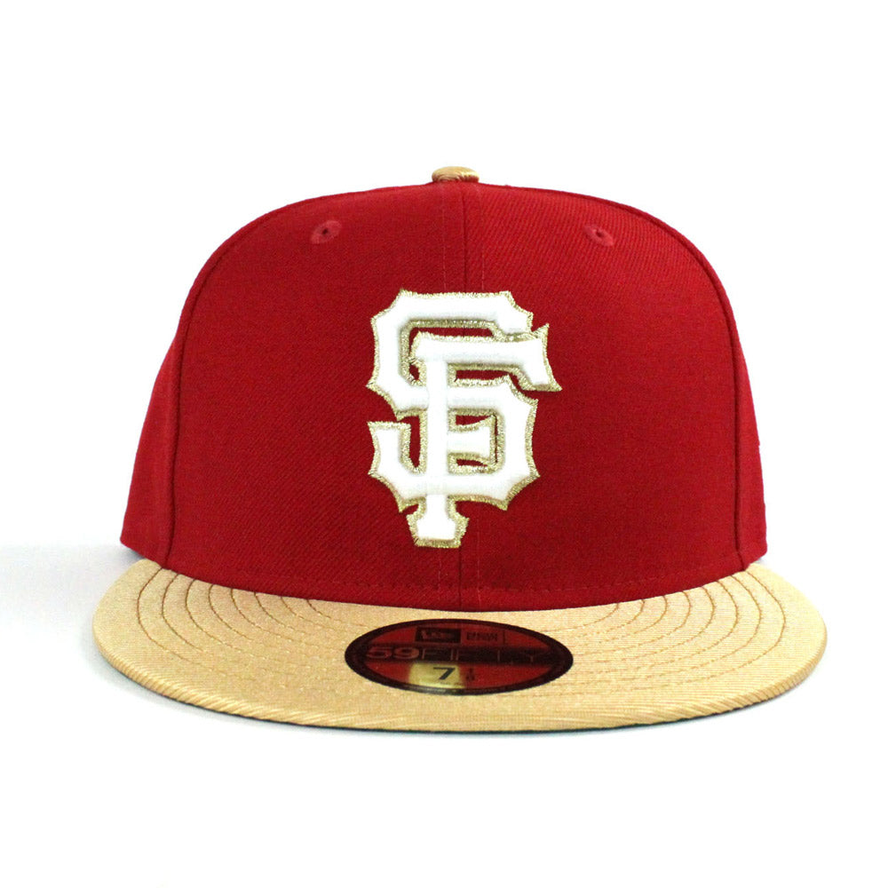 Iconic San Francisco Giants New Era fitted hat done up in Red and M.Gold with a Gray under brim. SF 49ers color way.
