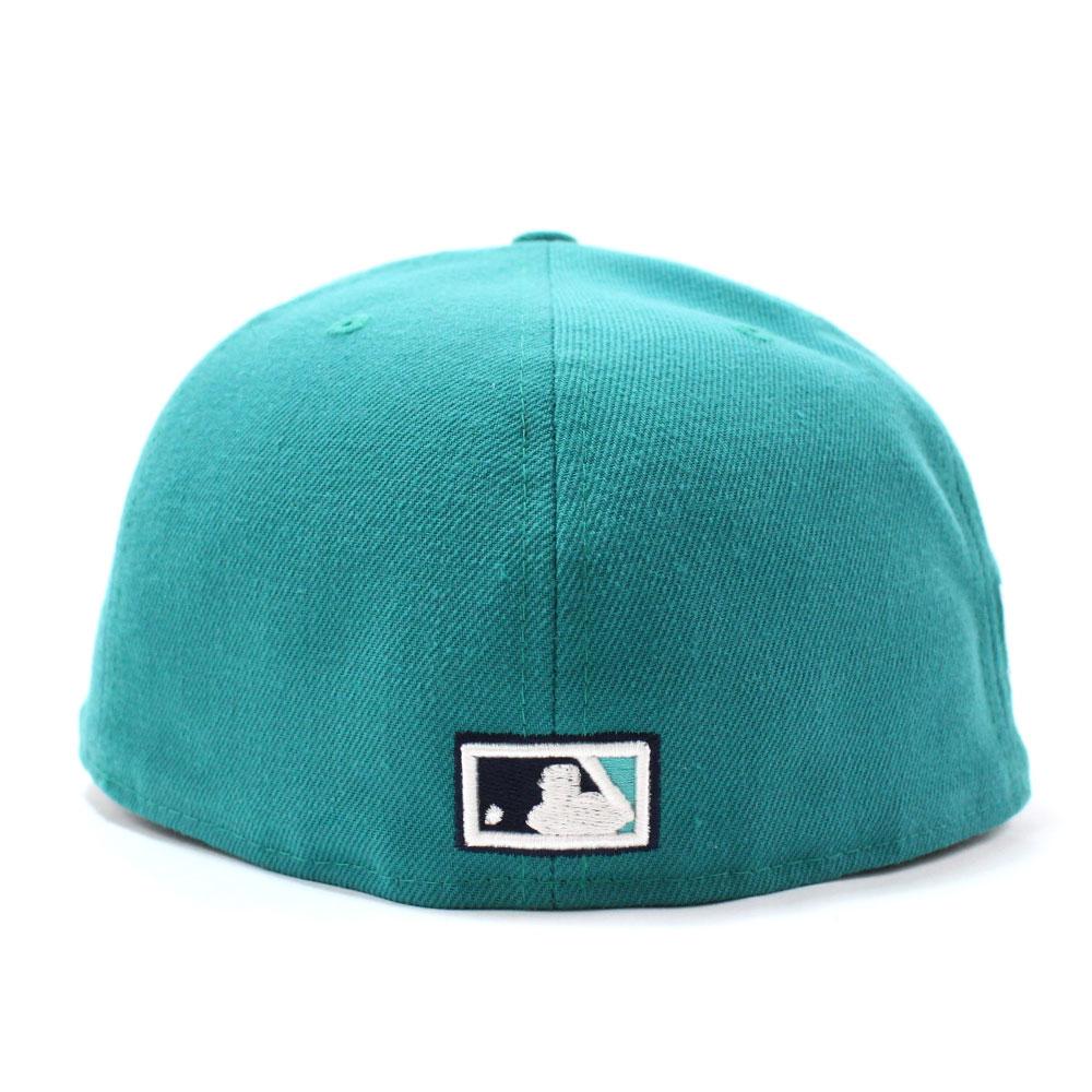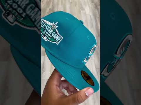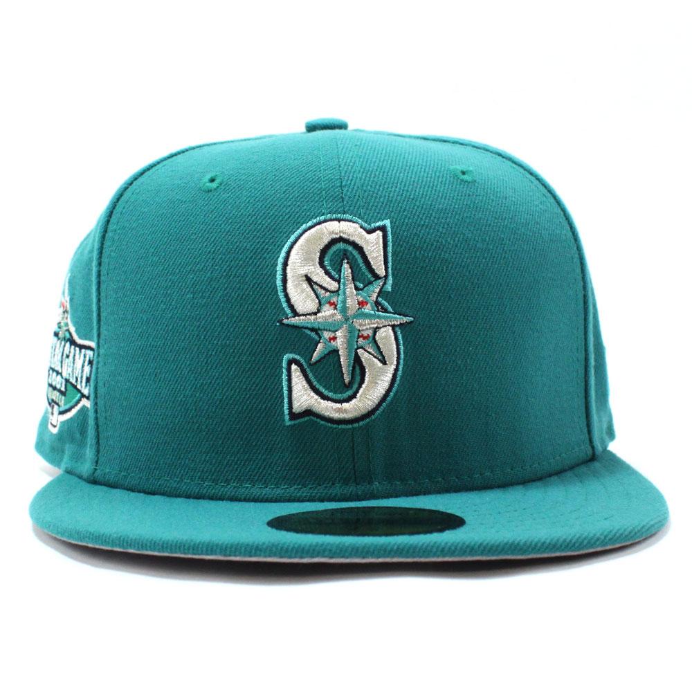 Restock: Seattle Mariners 2001 All Star Game New Era 59Fifty Fitted Hat is Aqua with Gray Under Brim.