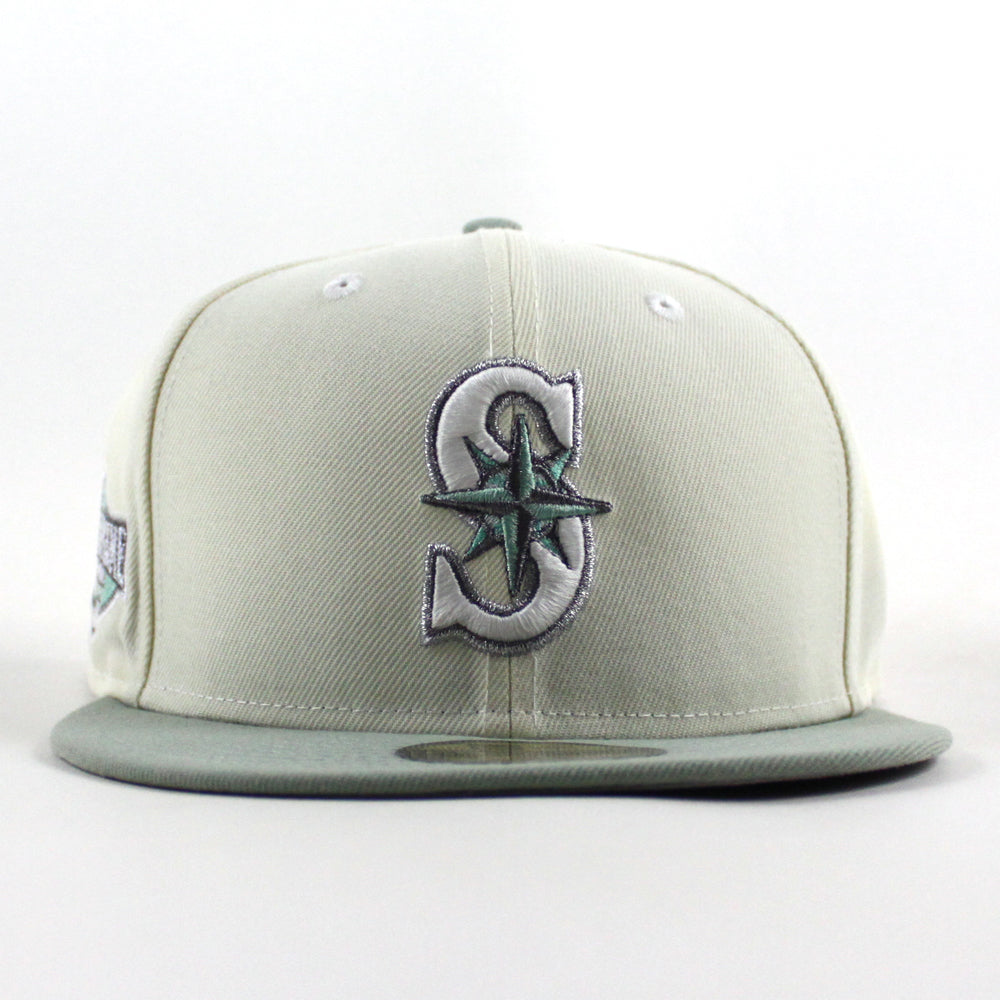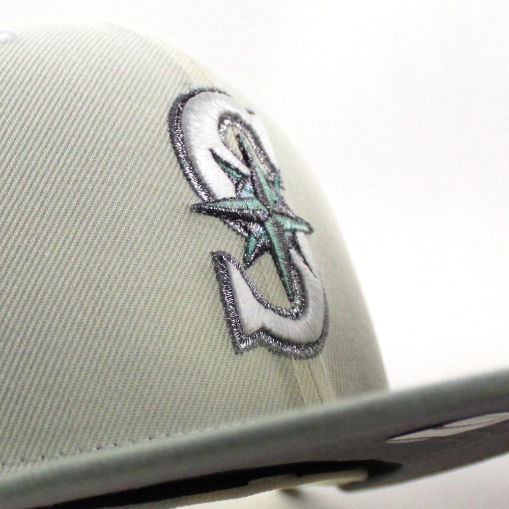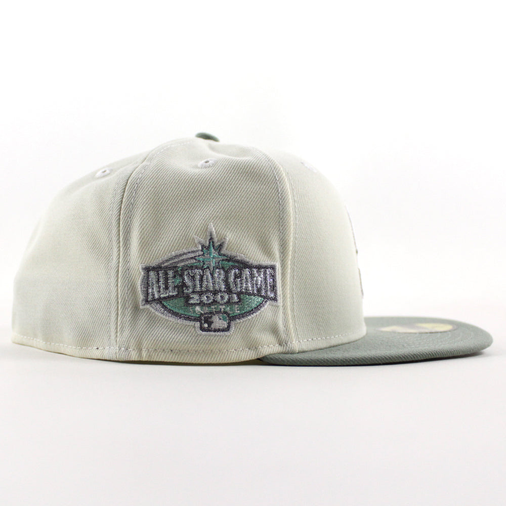 Seattle Mariners 2001 All Star Game New Era 59Fifty Fitted Hat in Chrome White, Sea Glass and Gray Under Brim.