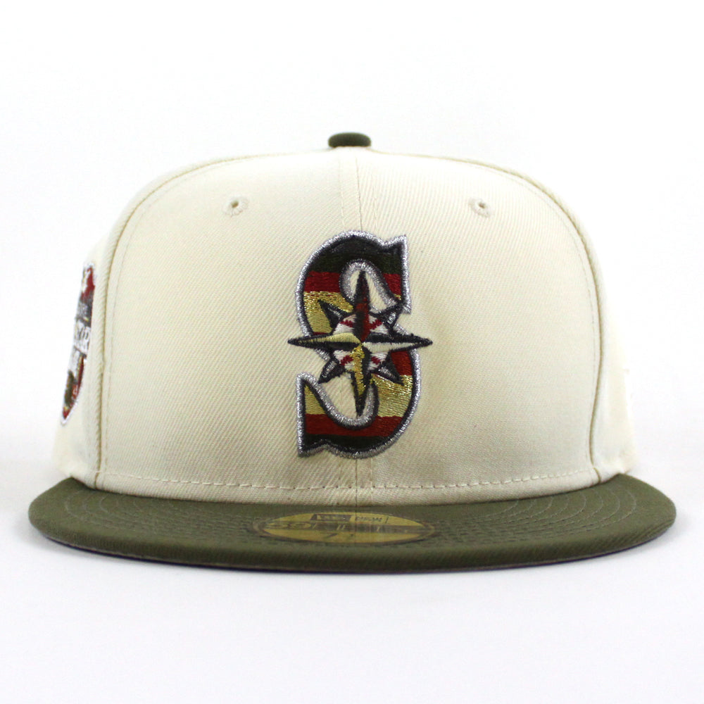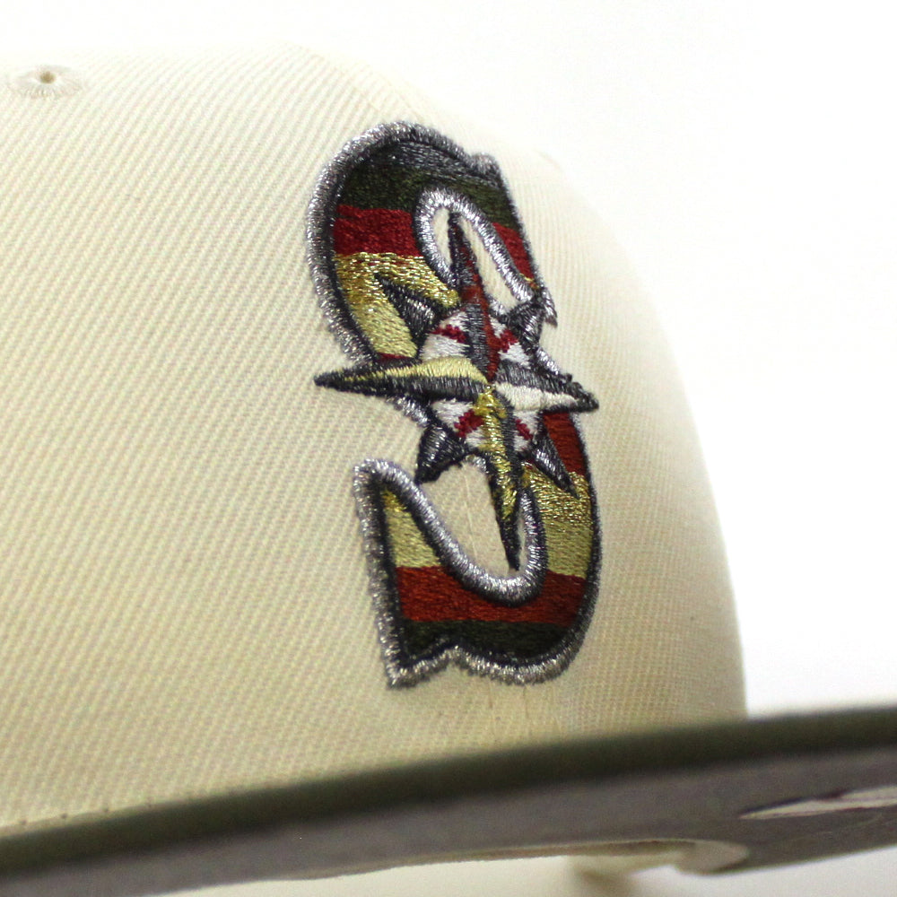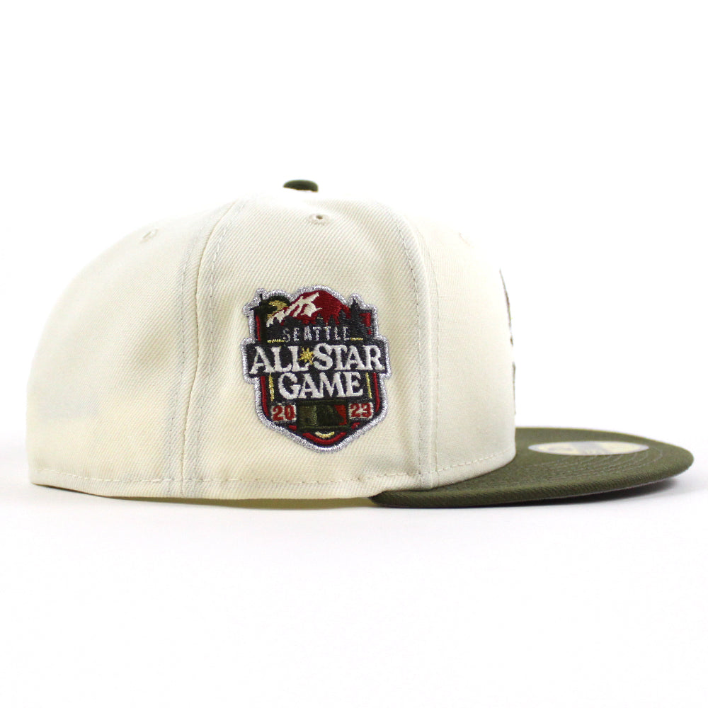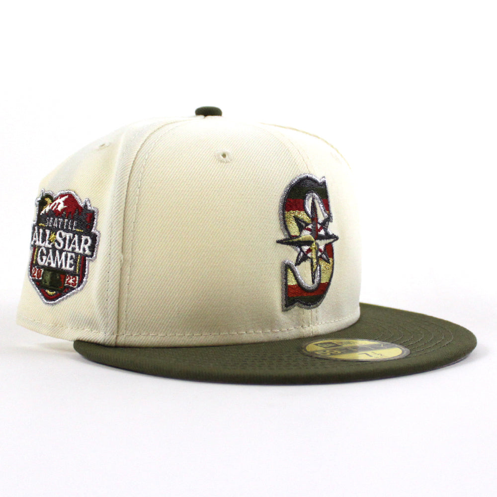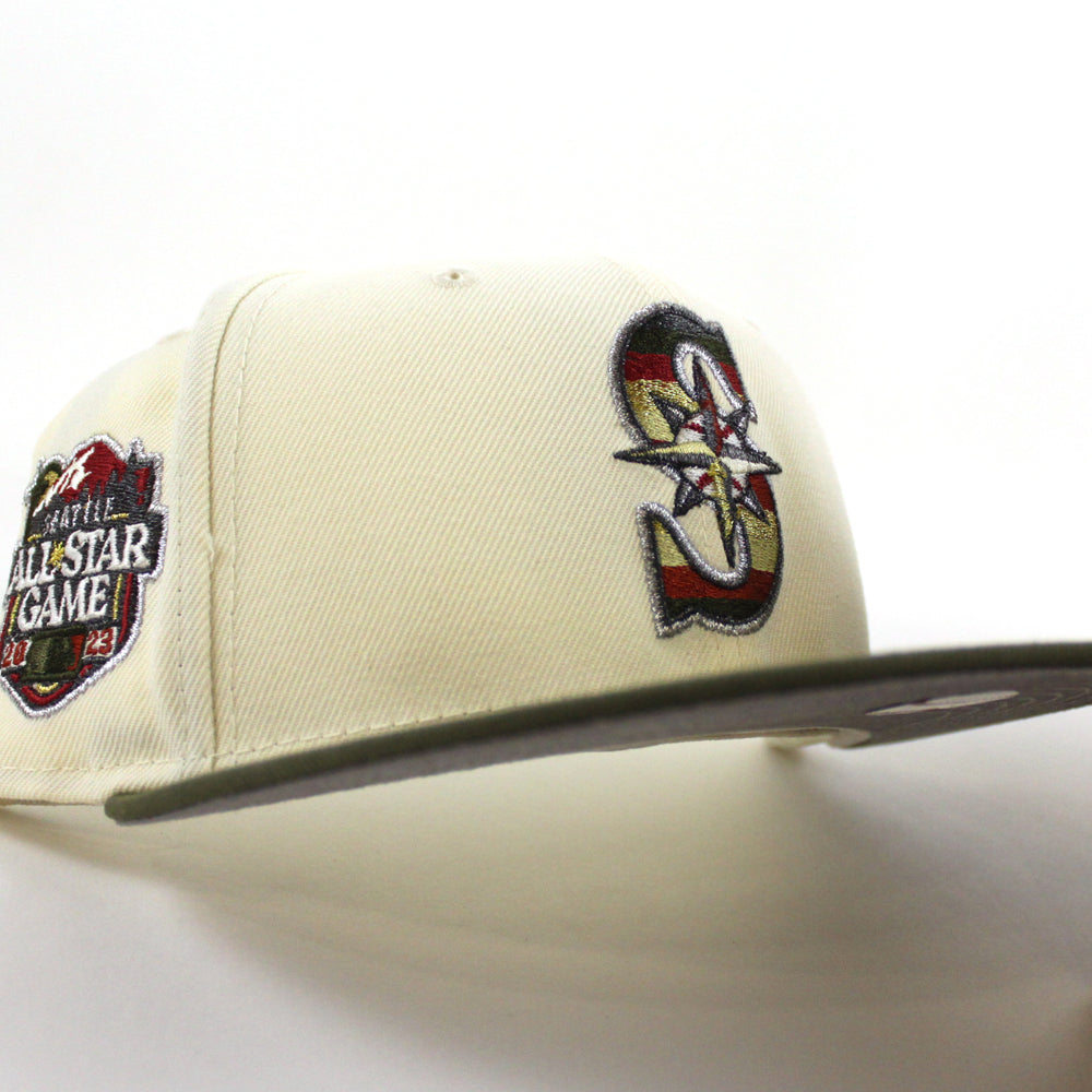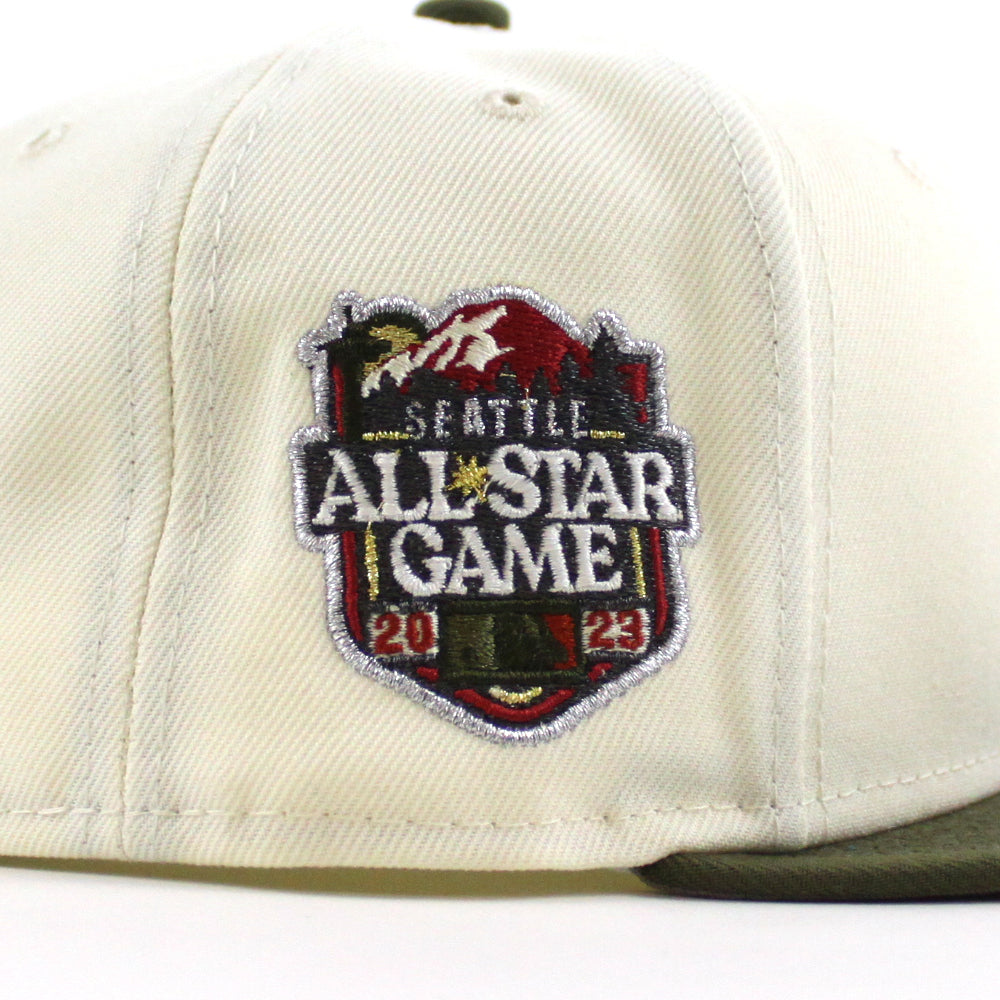 Seattle Mariners 2023 All Star Game New Era 59Fifty Fitted Hat in Chrome White, Olive and Gray Under Brim.