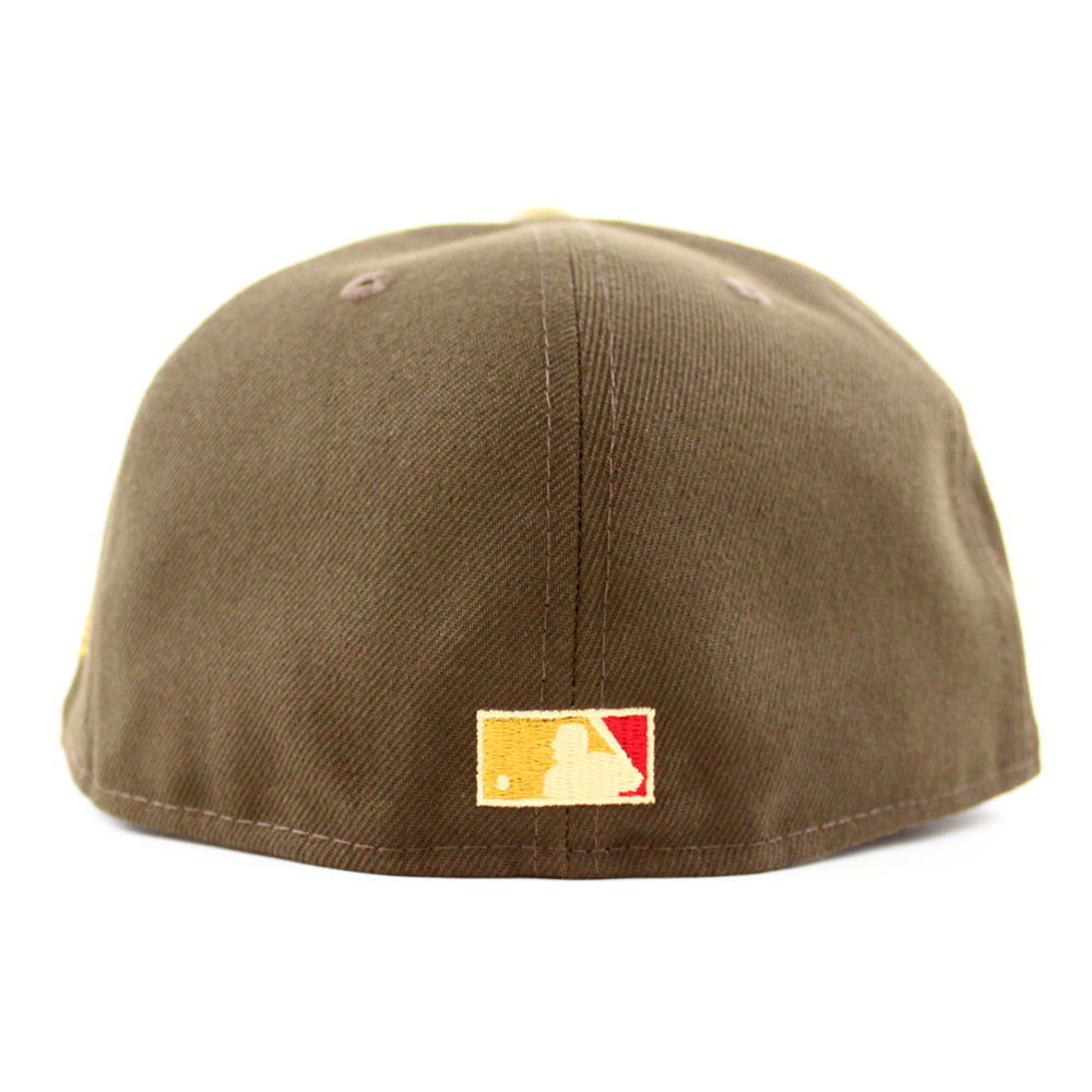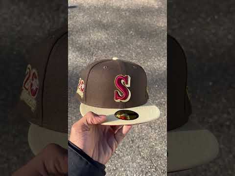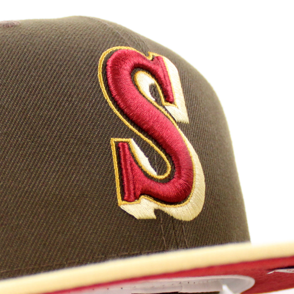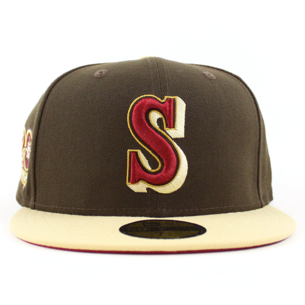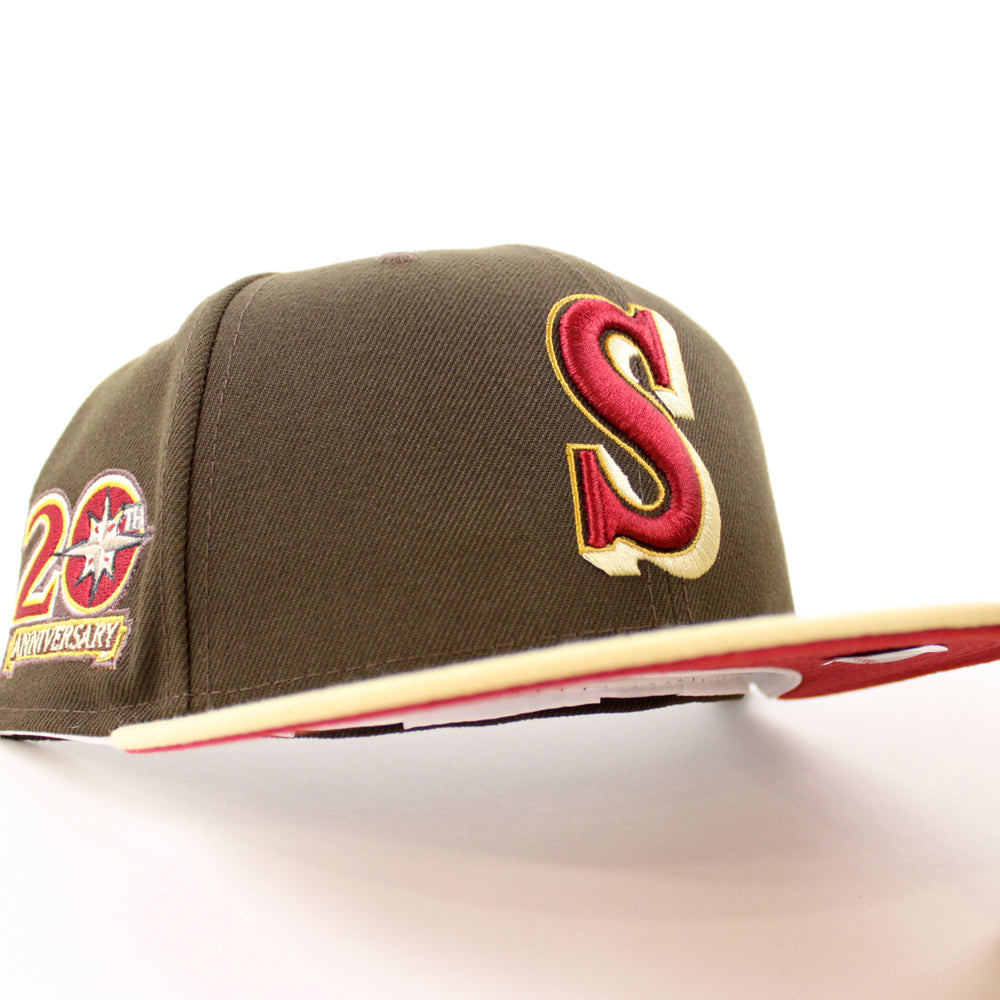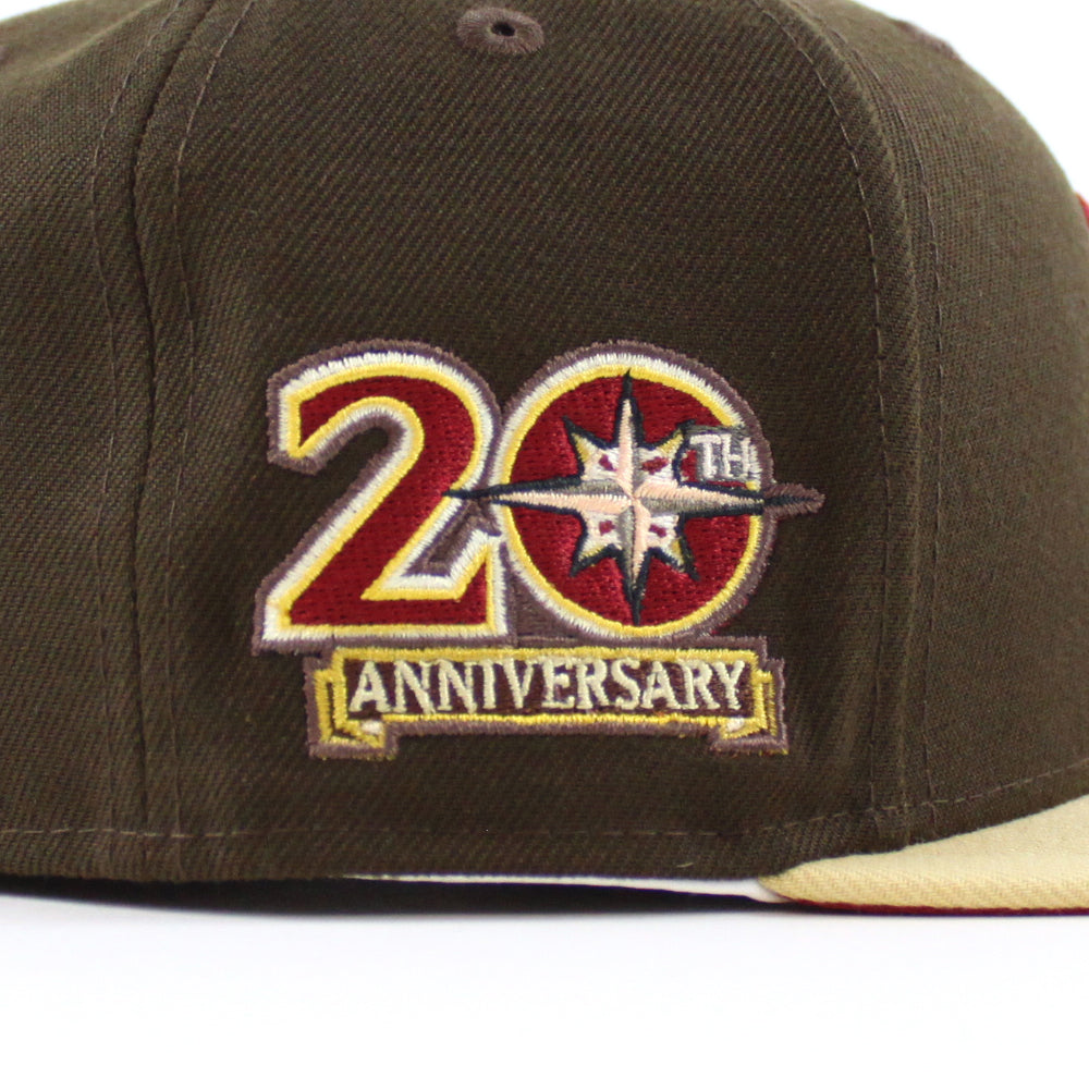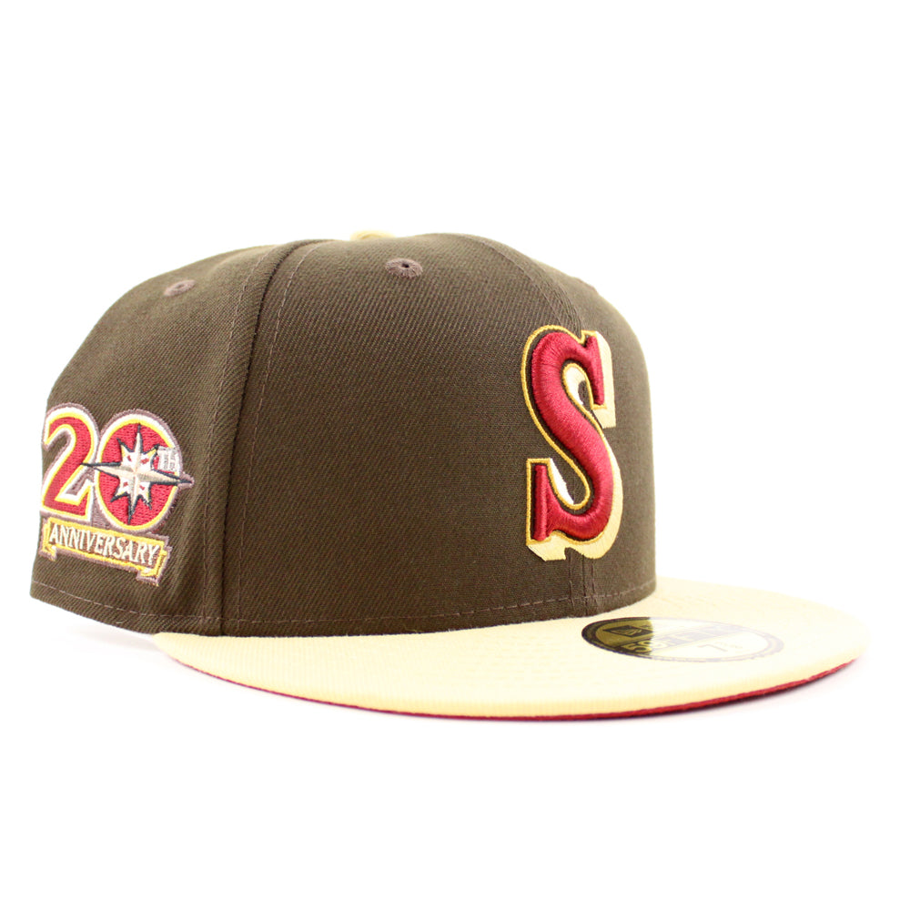 Seattle Mariners 20TH Anniversary New Era 59Fifty Fitted Hat in Walnut, Vegas Gold and Pinot Red Under Brim.