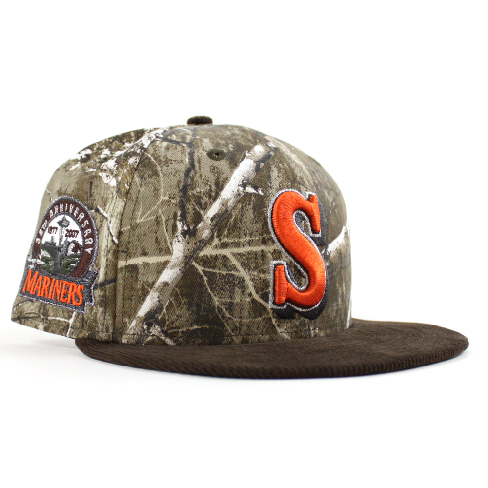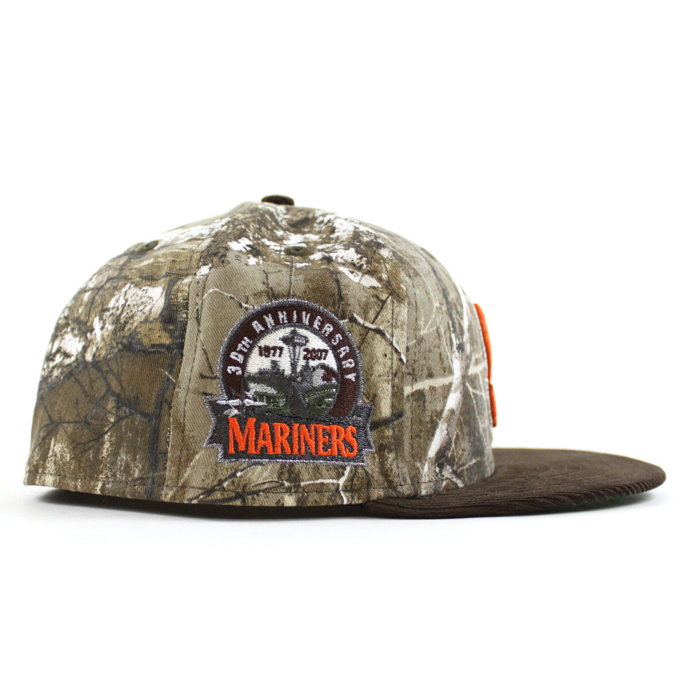 Seattle Mariners 30TH Anniversary New Era 59Fifty Fitted Hat in RealTree Camo, Brown Corduroy and Green Under Brim.