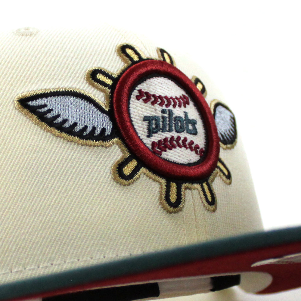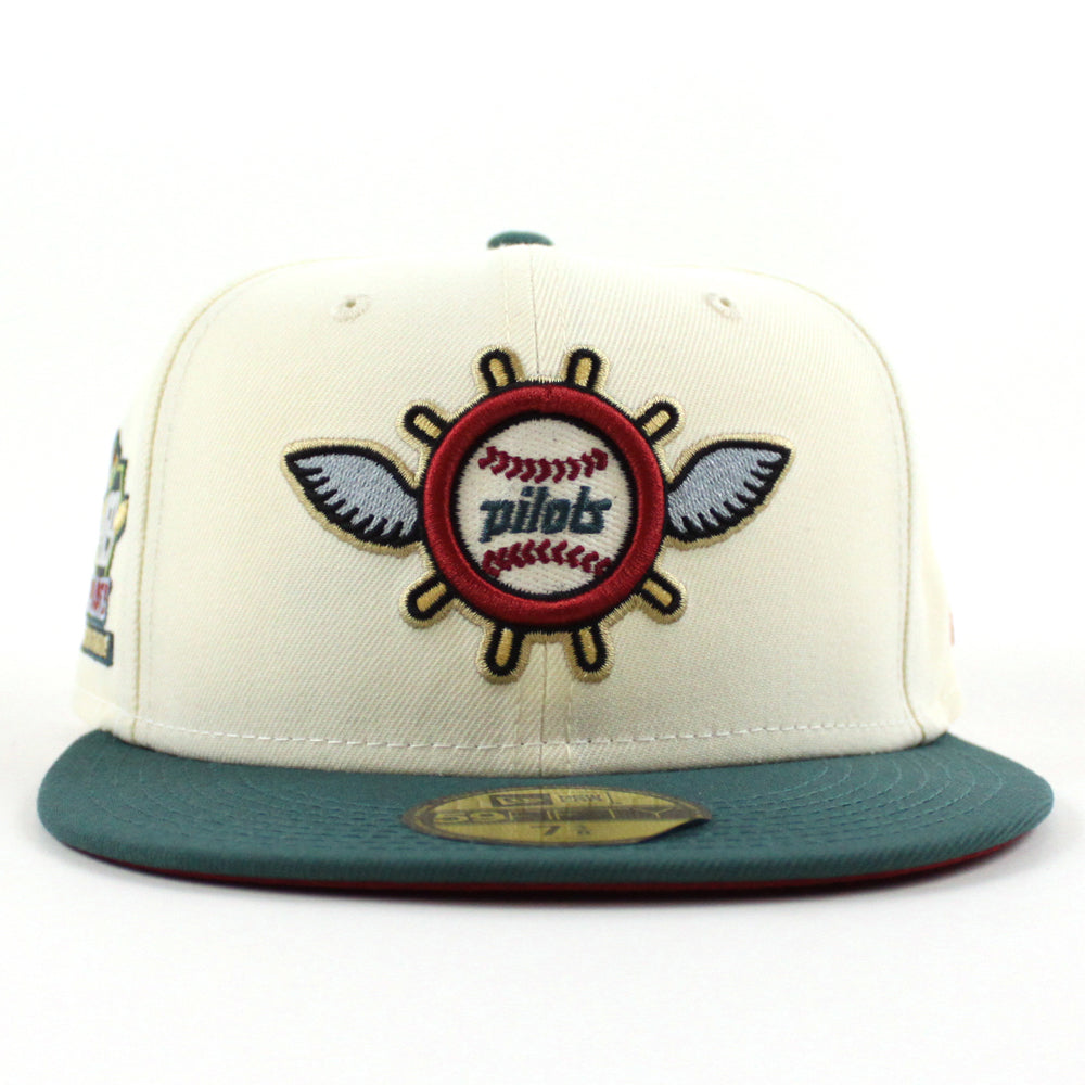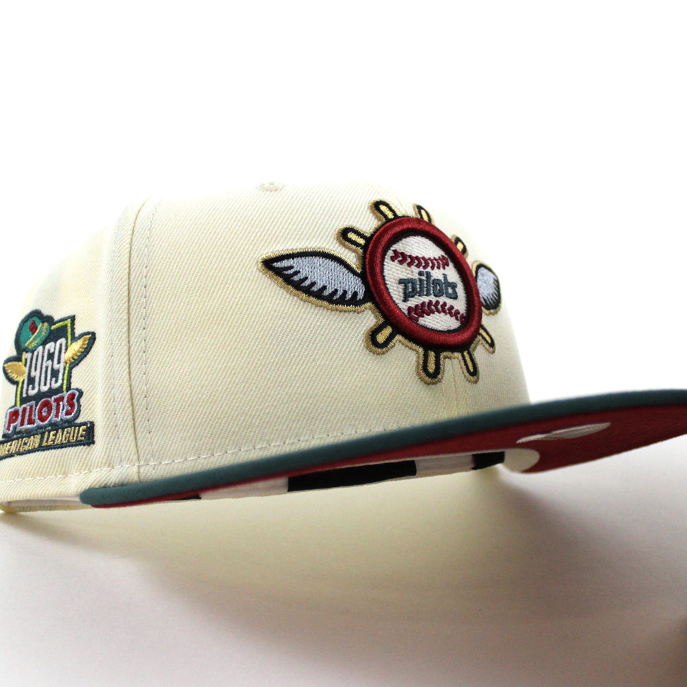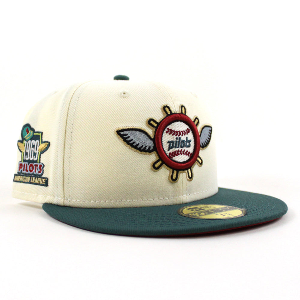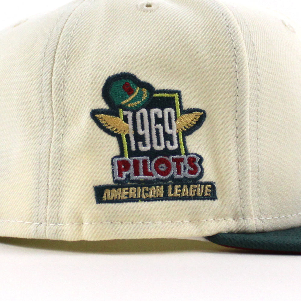 Seattle Pilots 1969 Pilots New Era Fitted 59Fifty Hat in Chrome White, Pine Needle Green and Pinot Red Under Brim.