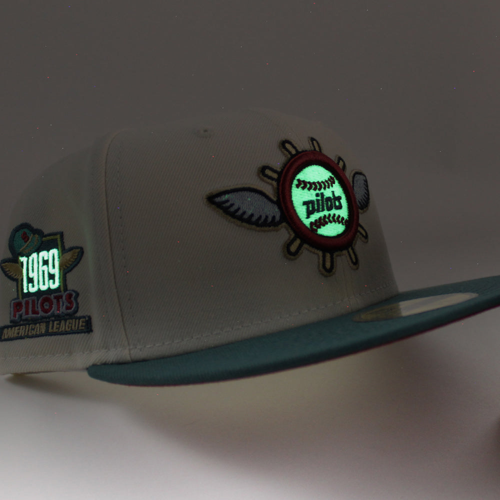 Seattle Pilots 1969 Pilots New Era Fitted 59Fifty Hat (Glow in the Dark CHROME WHITE PINE NEEDLE GREEN PINOT RED Under brim)