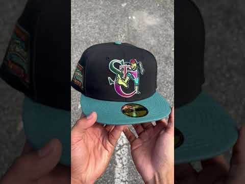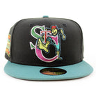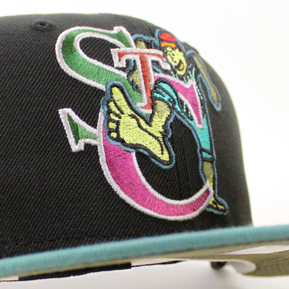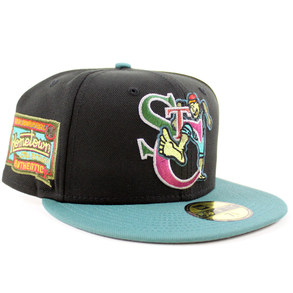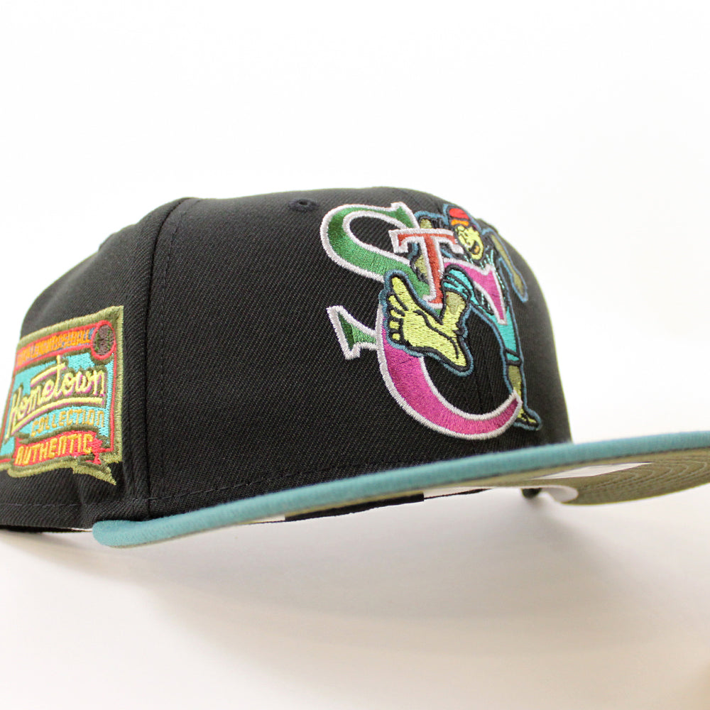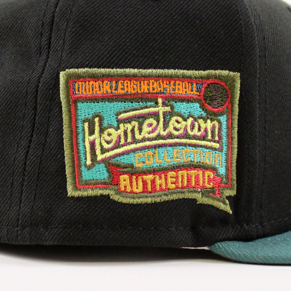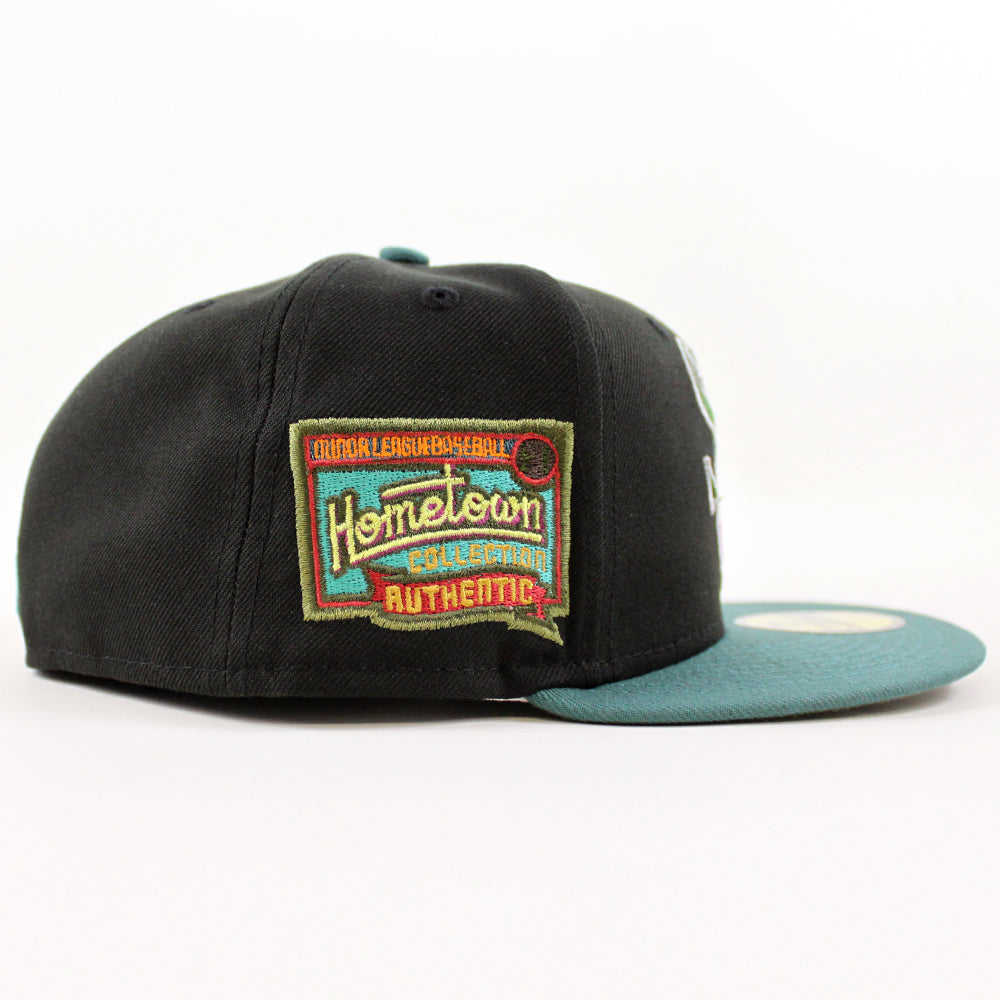 St. Catharines Stompers Hometown Collection New Era 59Fifty Fitted Cap in Black, Pine Needle Green and New Olive Under Brim.