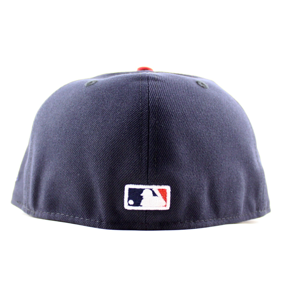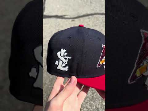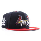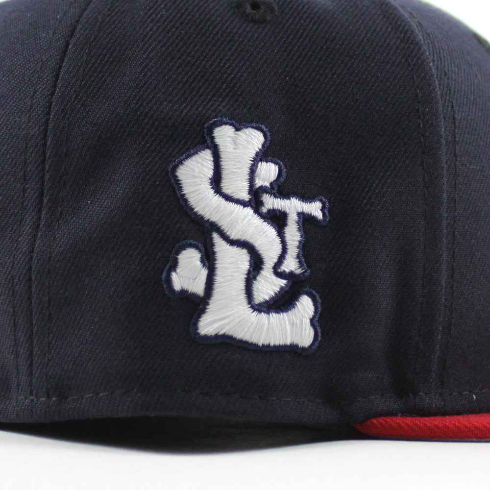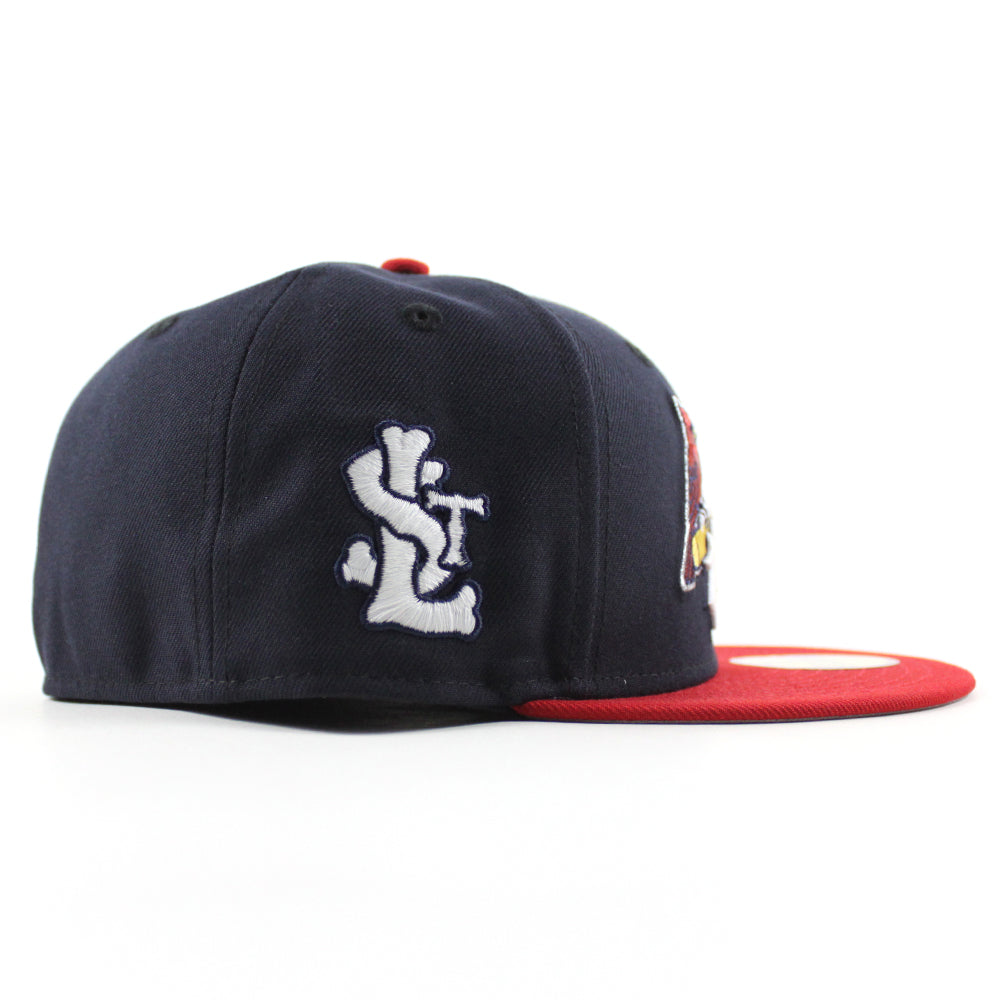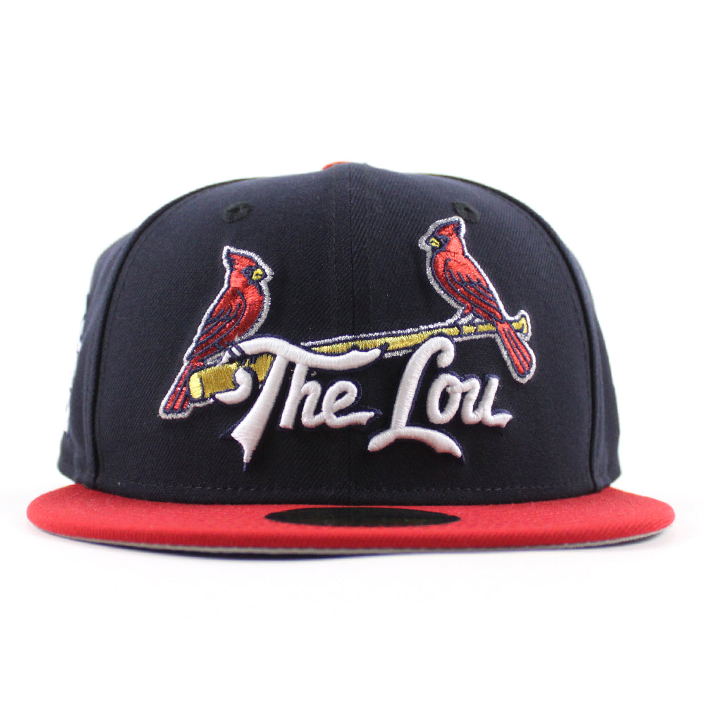 St. Louis Cardinals The Lou STL Patch New Era 59Fifty Fitted Hat in Navy, Scarlet Red and Gray Under Brim.