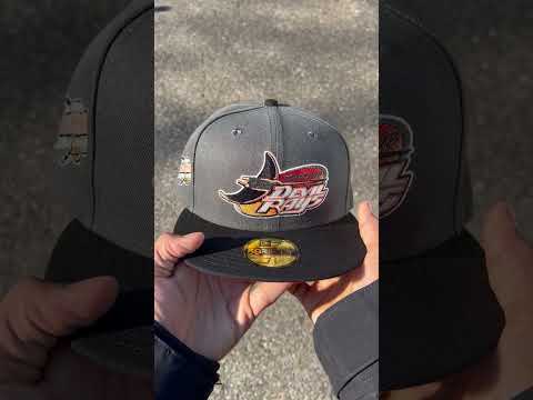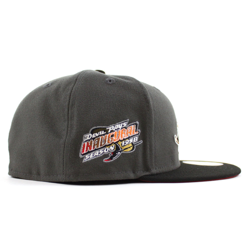 Tampa Bay Devil Rays Inaugural Season 1998 New Era 59Fifty Fitted Cap in Pewter, Black and Pinot Under Brim.