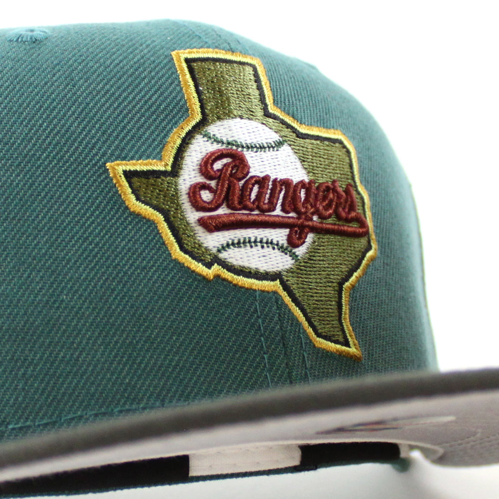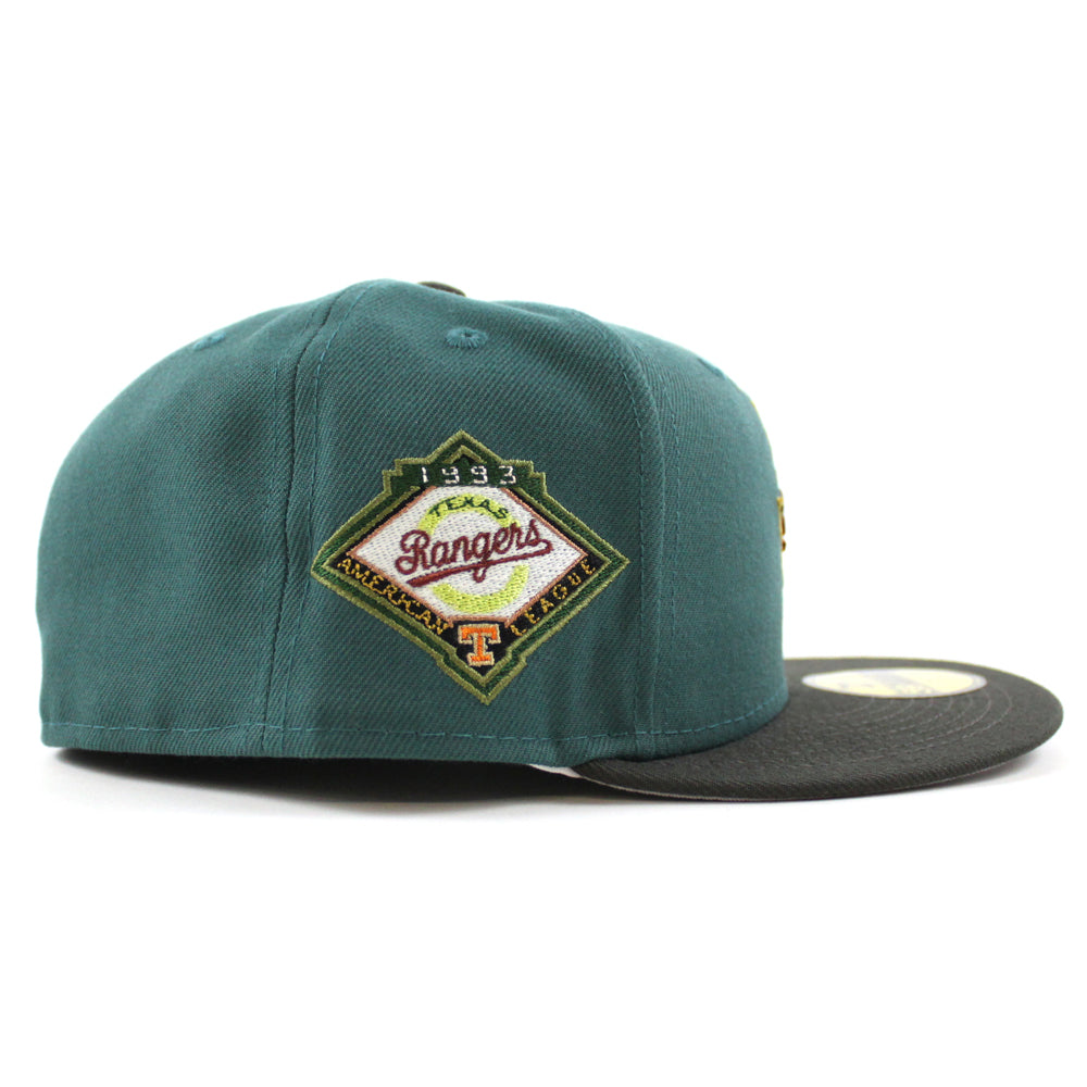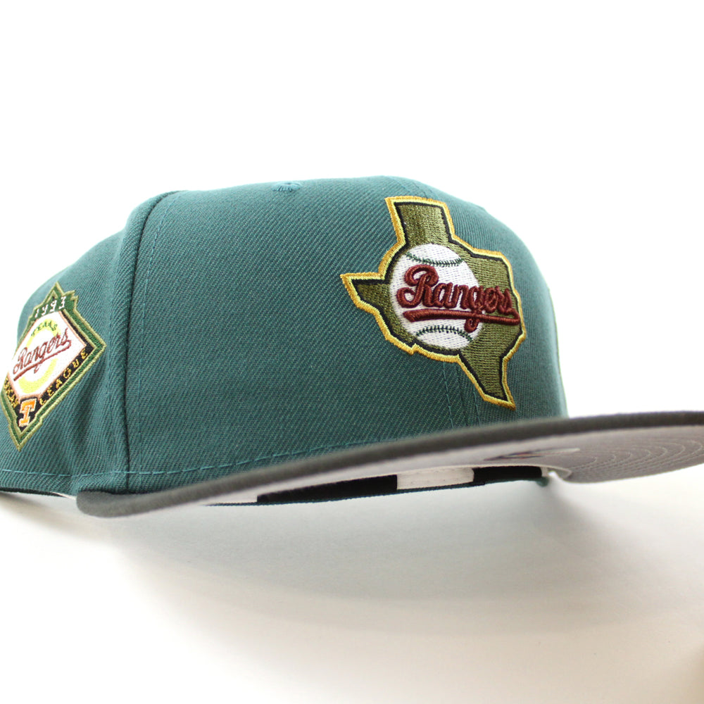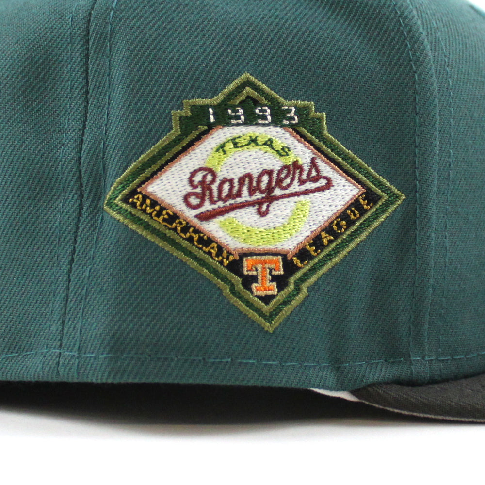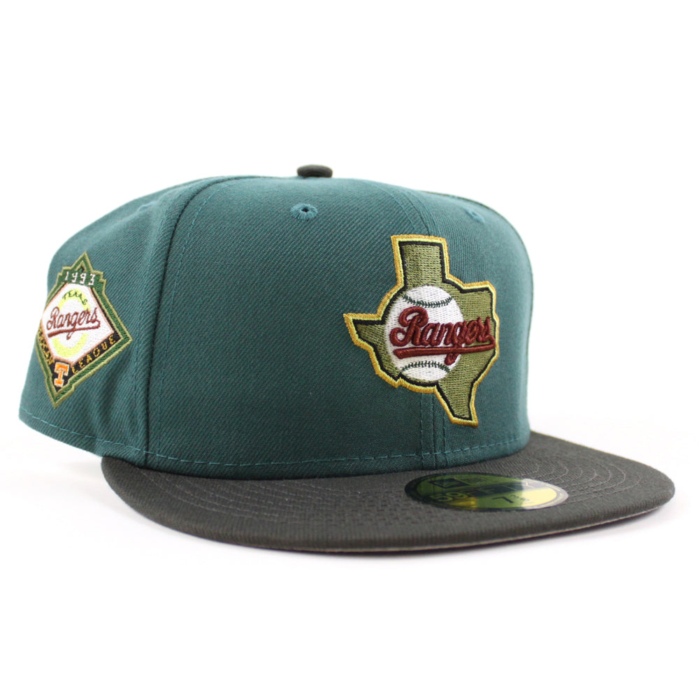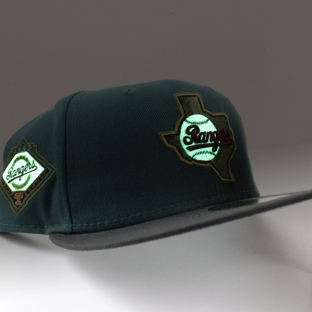 Texas Rangers 1993 American League New Era 59Fifty Fitted Hat (GITD PINE NEEDLE GREEN DARK PEWTER GRAY Under Brim)
