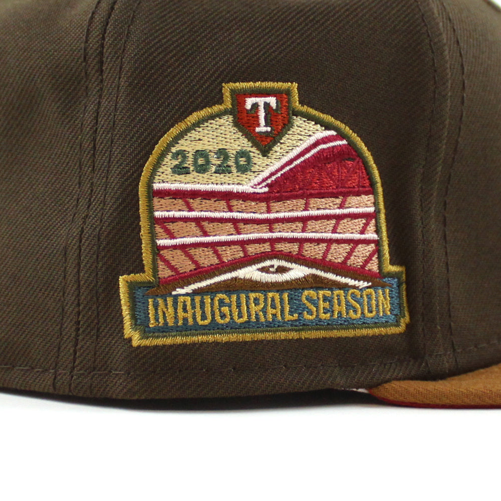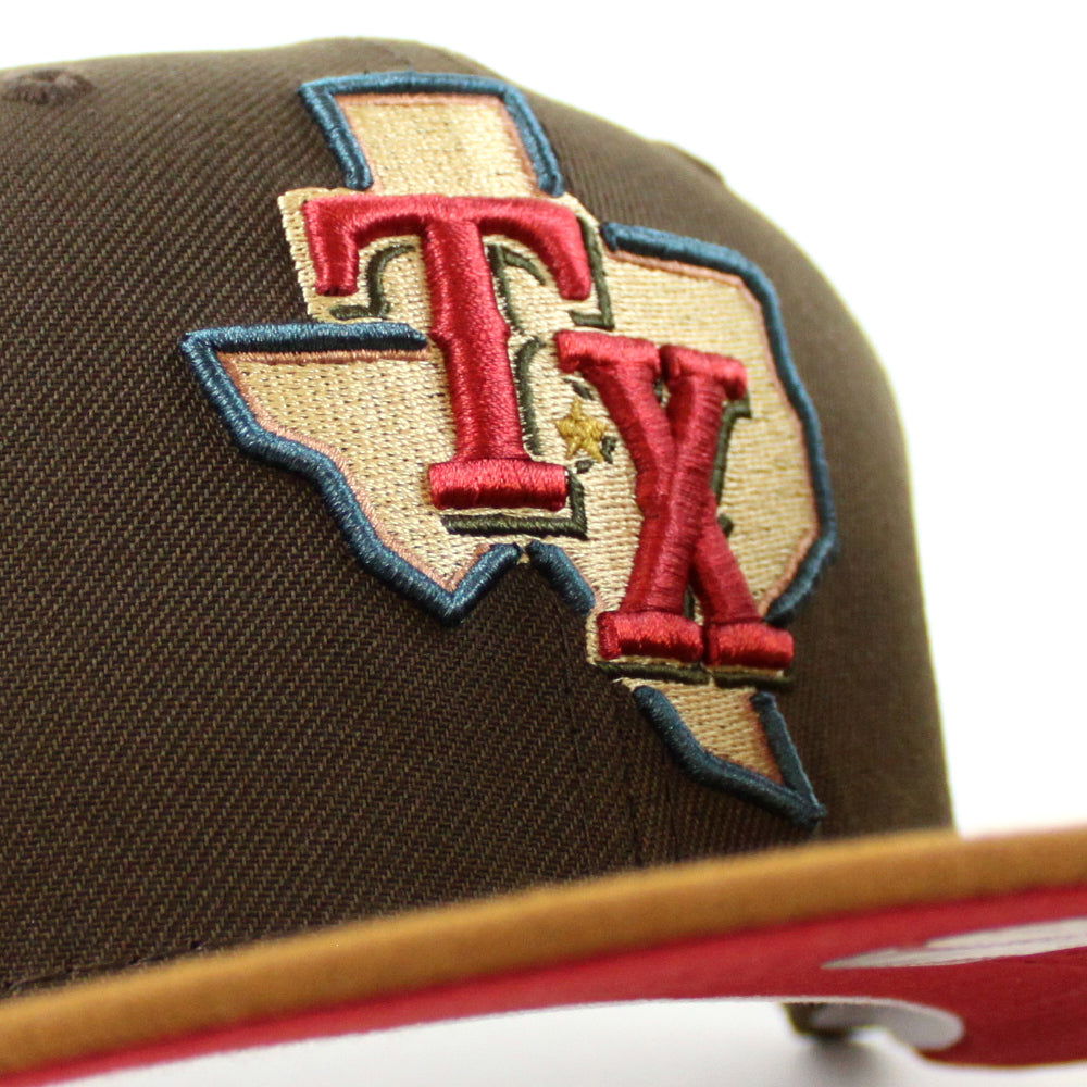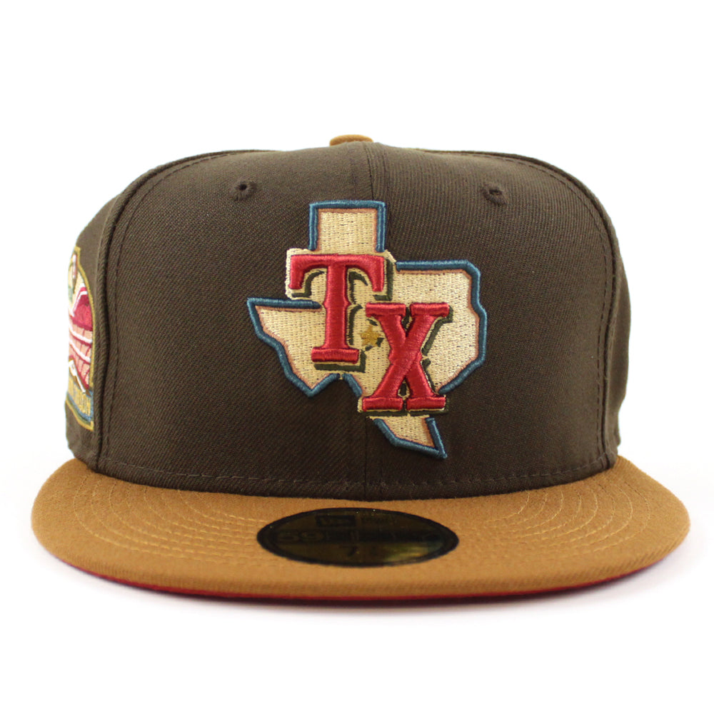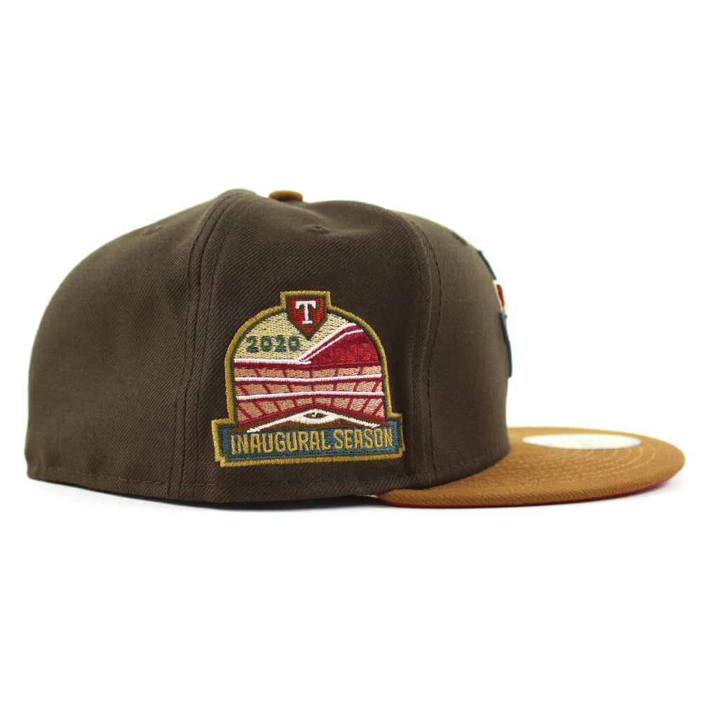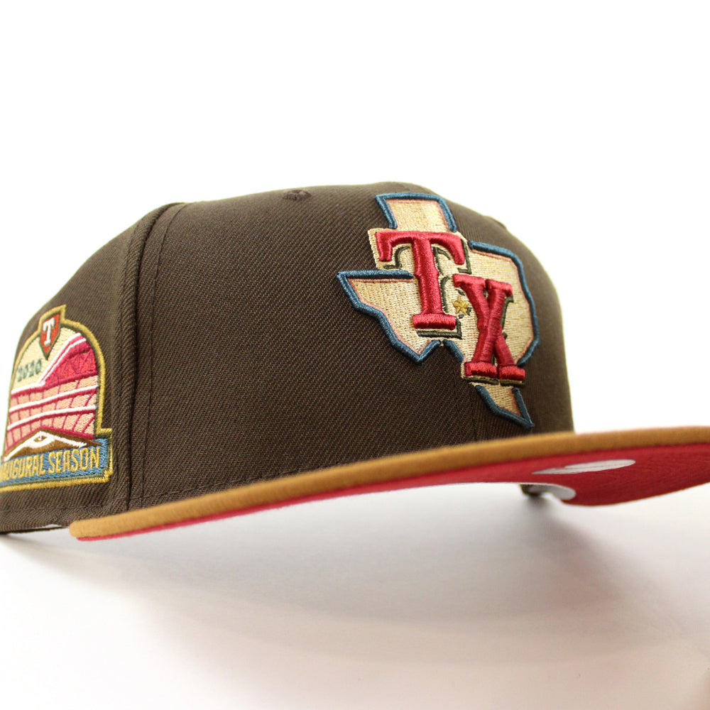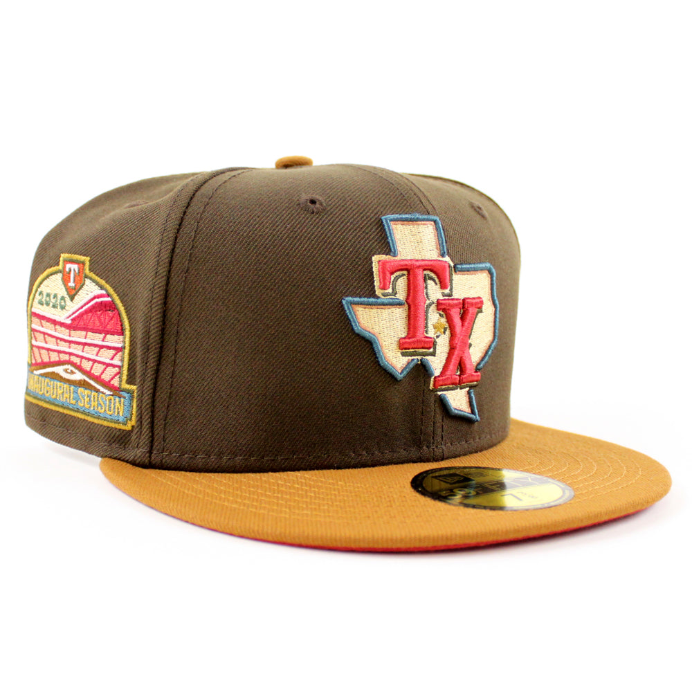 Texas Rangers 2020 Inaugural Season New Era 59Fifty Fitted Cap in Brown, PEANUT and Pinot Red under brim.