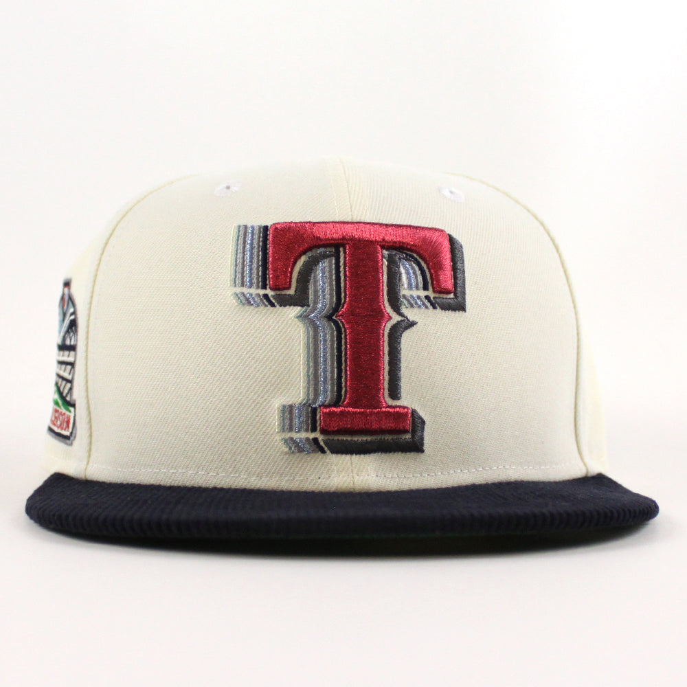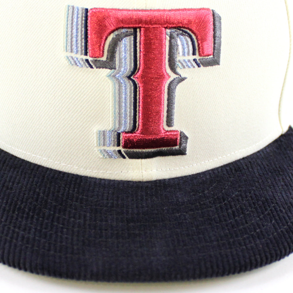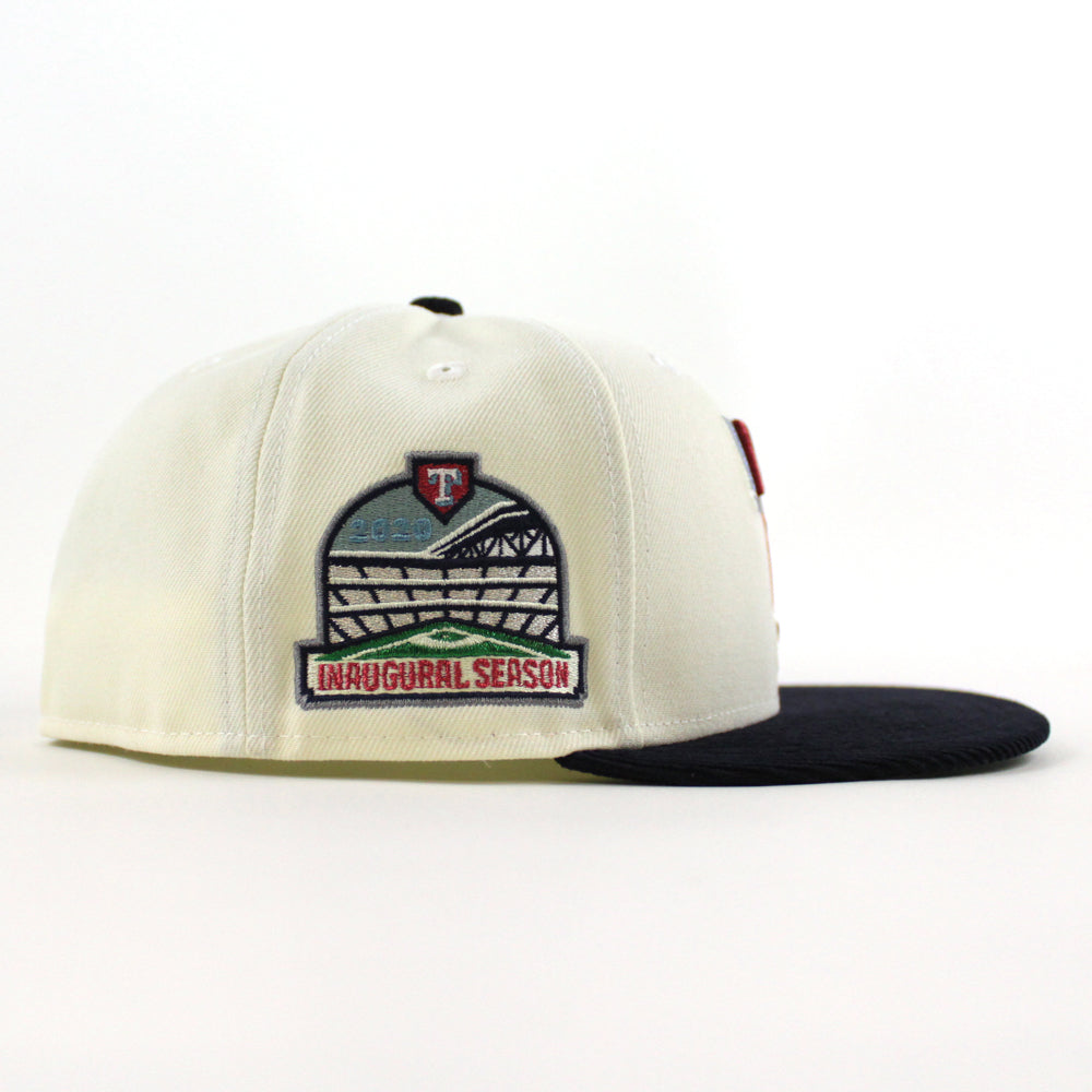 Texas Rangers 2020 Inaugural Season New Era 59Fifty Fitted Hat in Chrome White, Corduroy Navy and Green Under Brim.