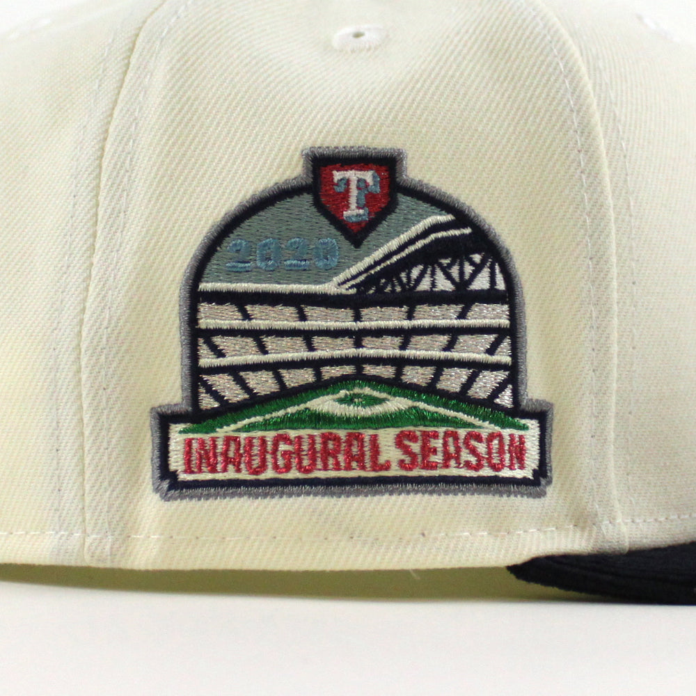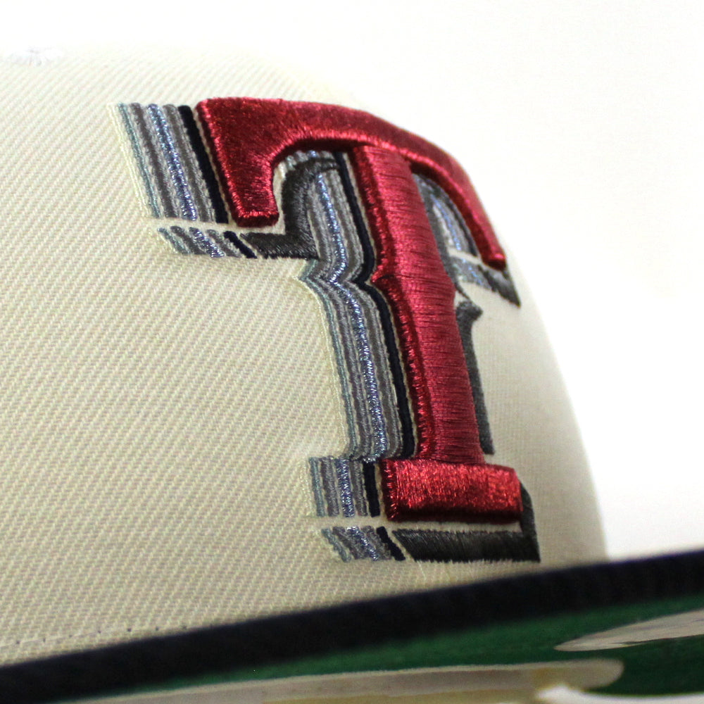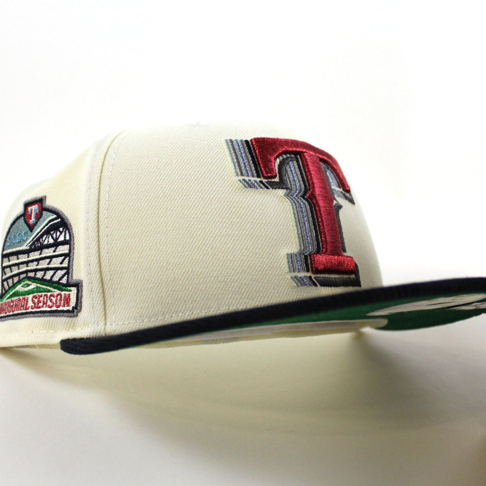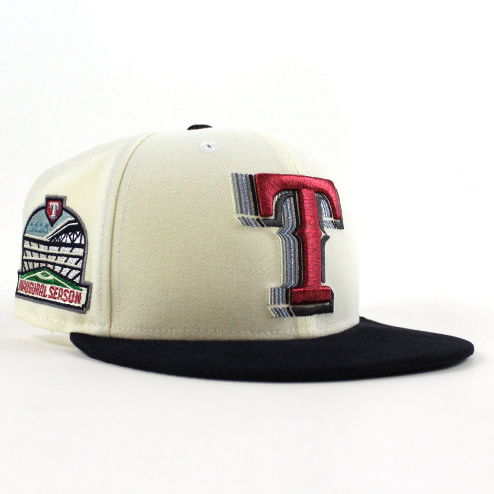 Texas Rangers 2020 Inaugural Season New Era 59Fifty Fitted Hat in Chrome White, Corduroy Navy and Green Under Brim.