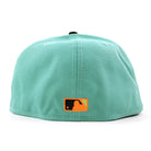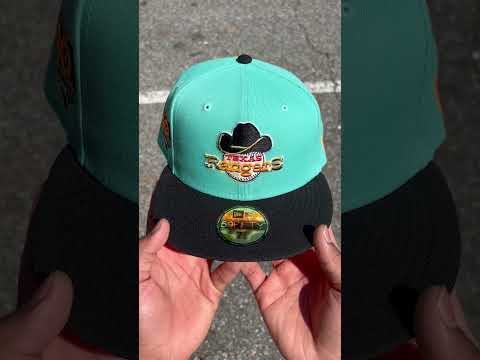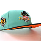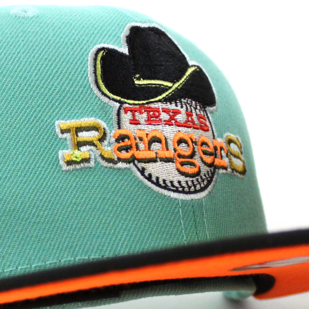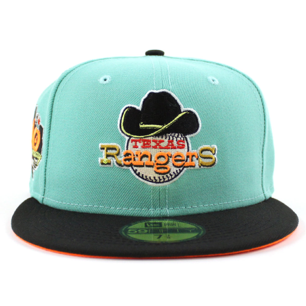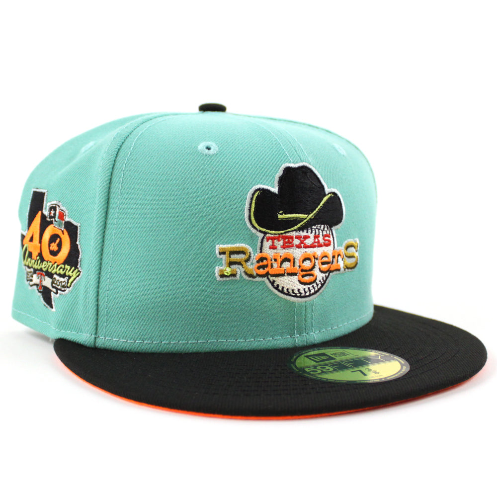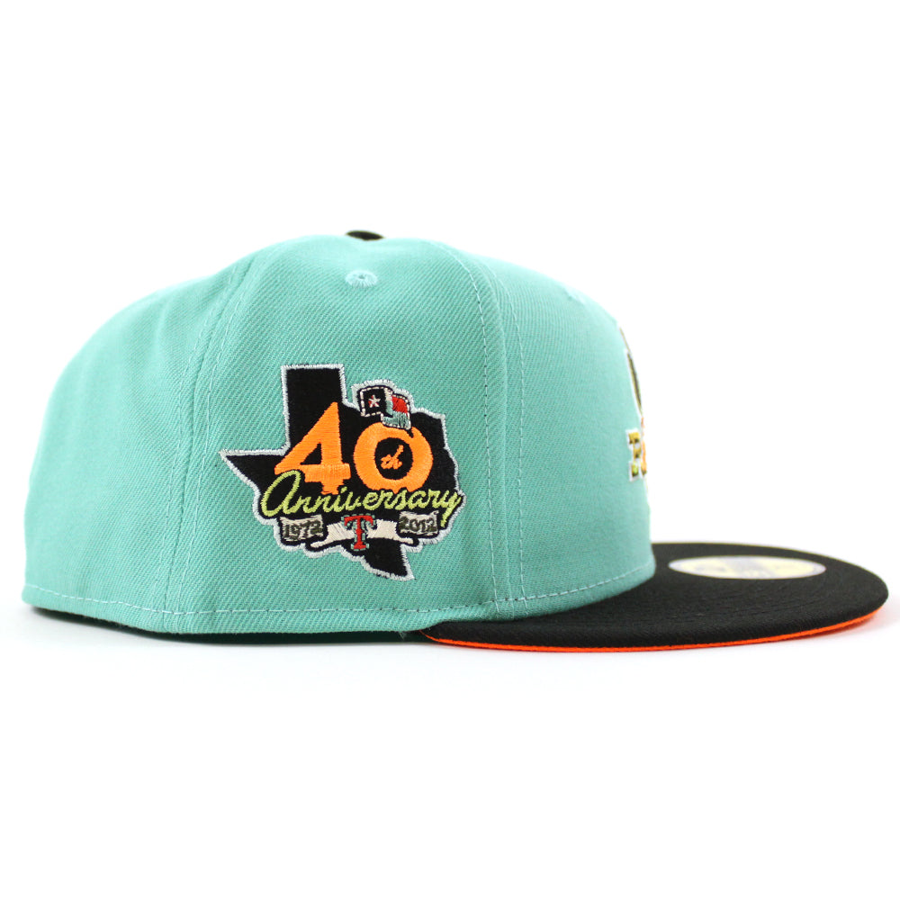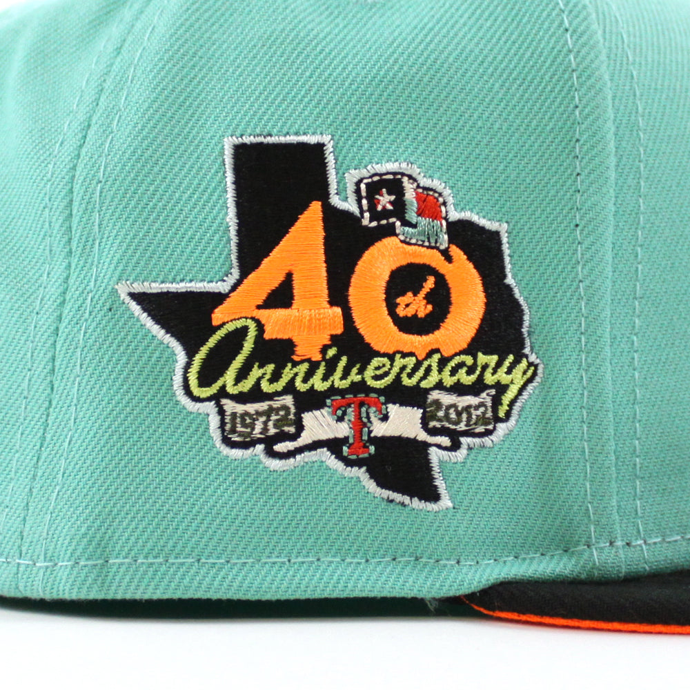 Texas Rangers 40th Anniversary New Era 59Fifty Fitted Cap in Clear Mint, Black Hunter and Flame Orange under brim.