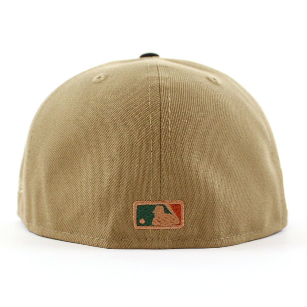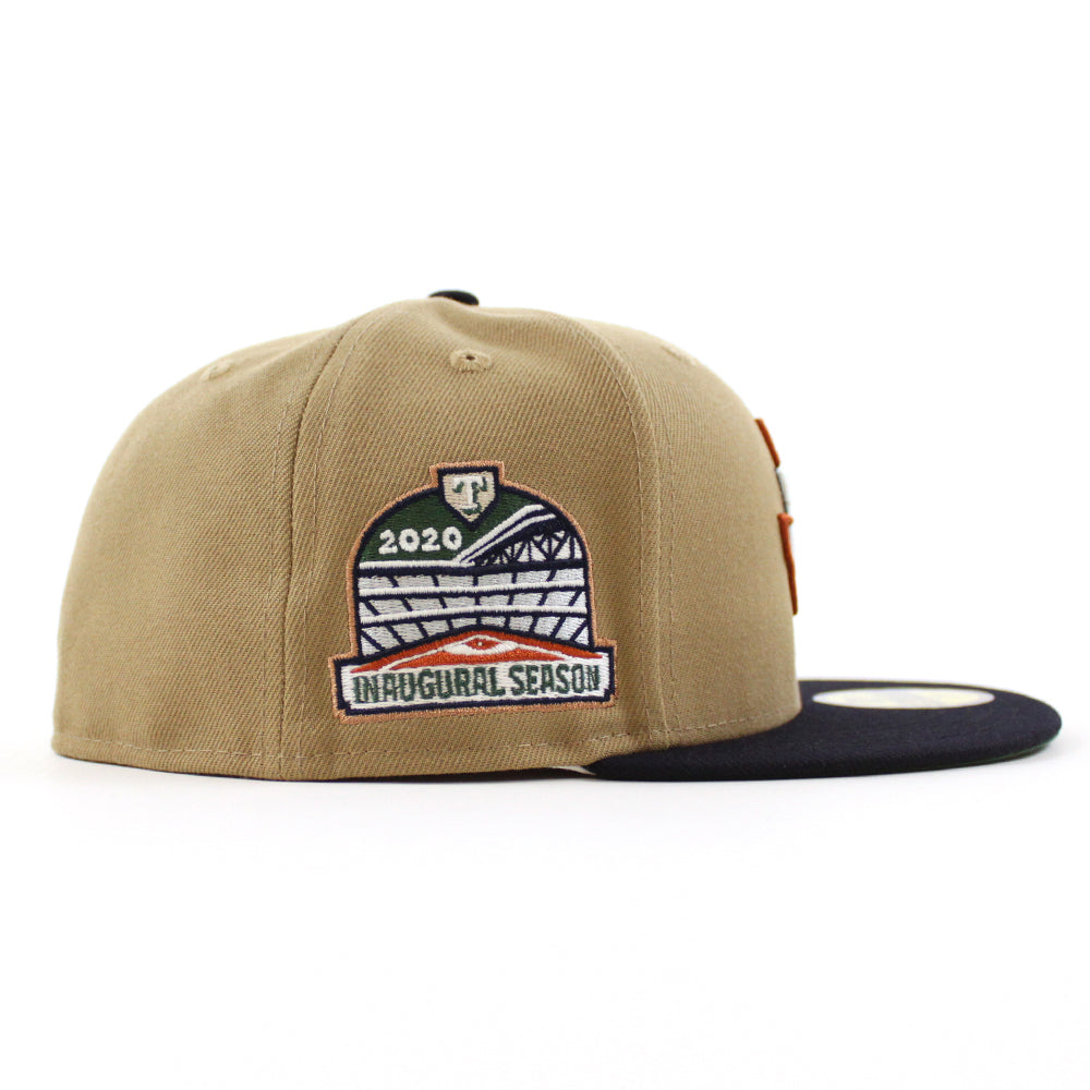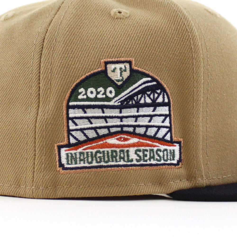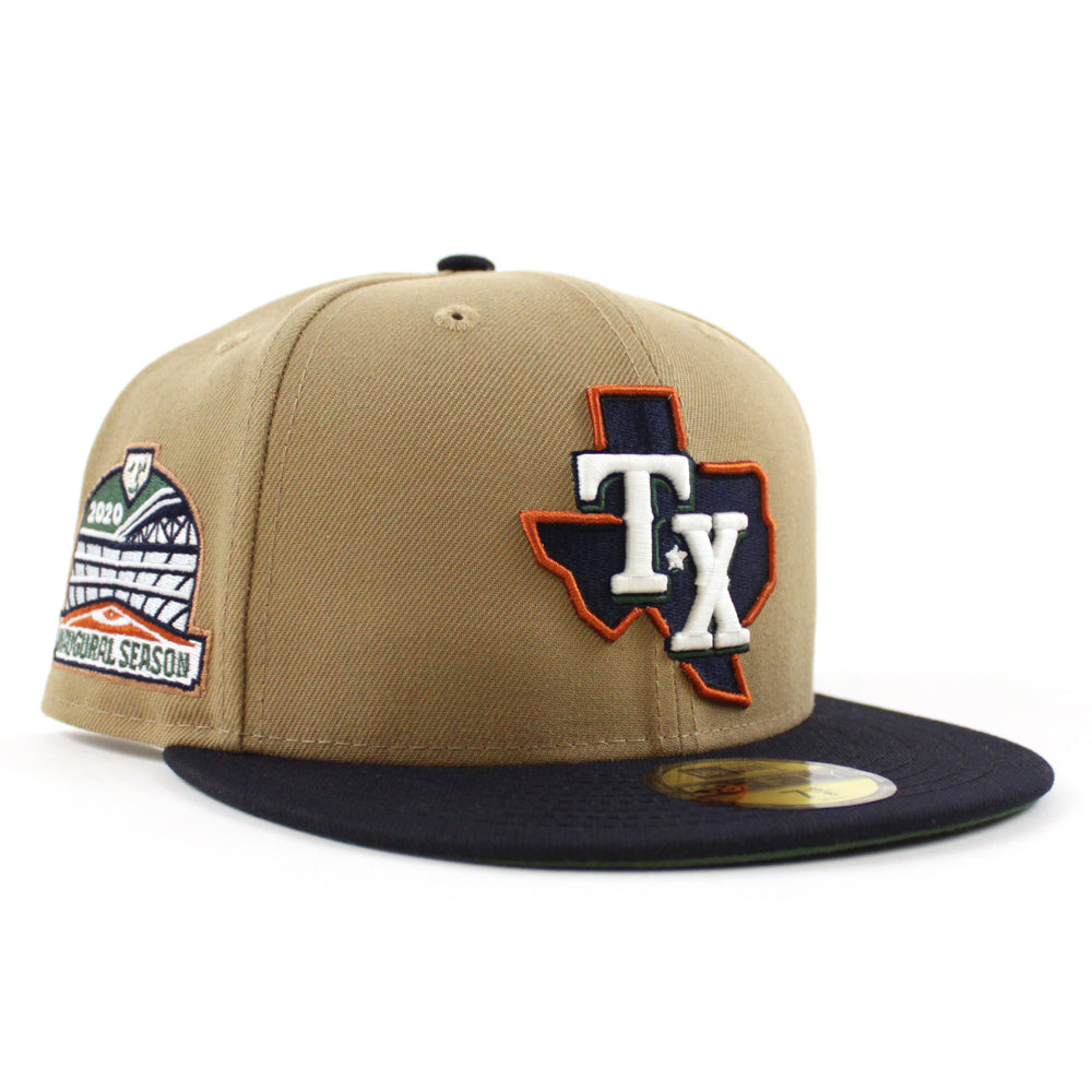 Texas Rangers Inaugural Season New Era 59Fifty Fitted Hat in Khaki, Navy and Green under brim.