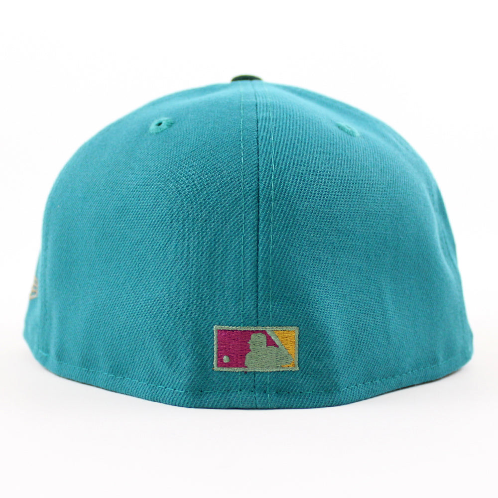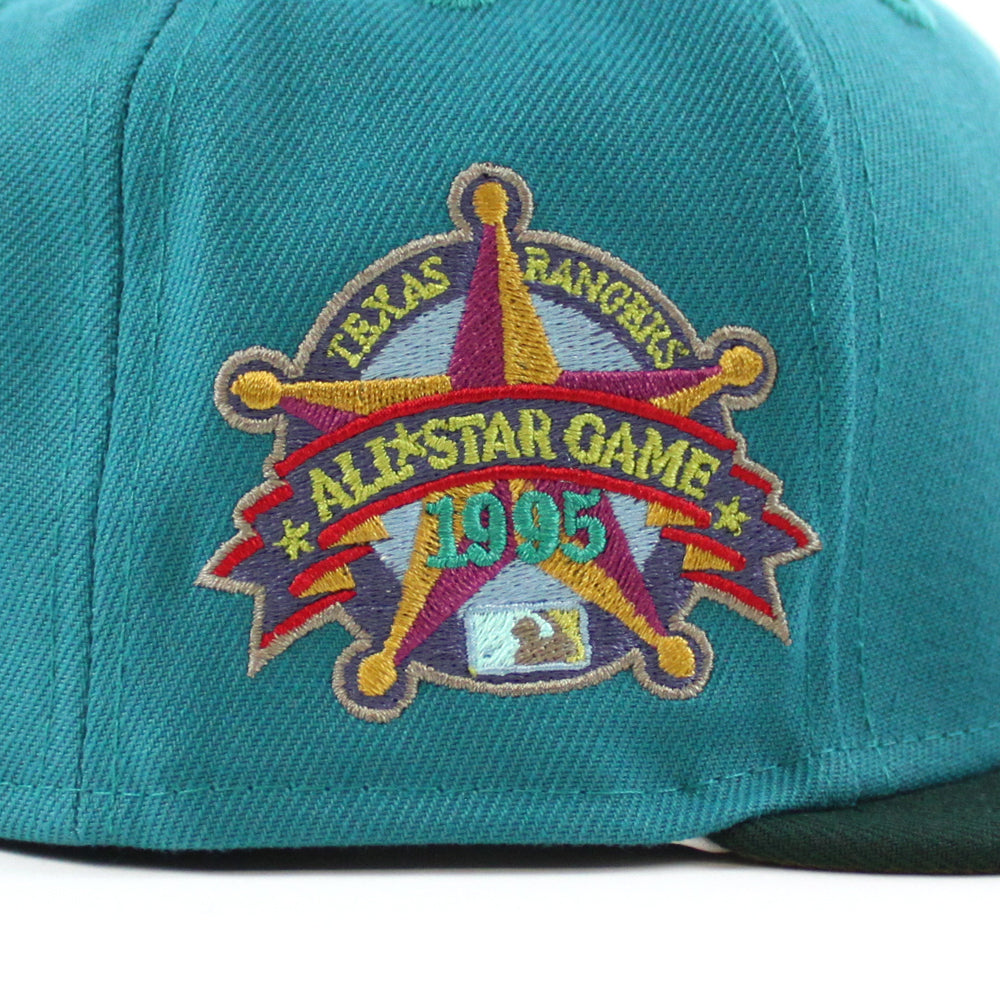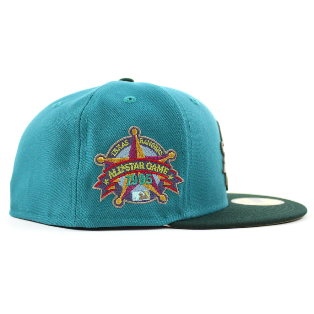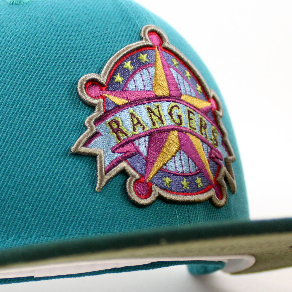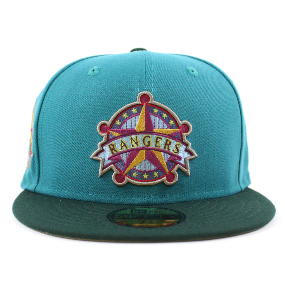 Texas Rangers Rangers Badge Era 59Fifty Fitted Hat in Aqua, Dark Green and Green Bark Under Brim.