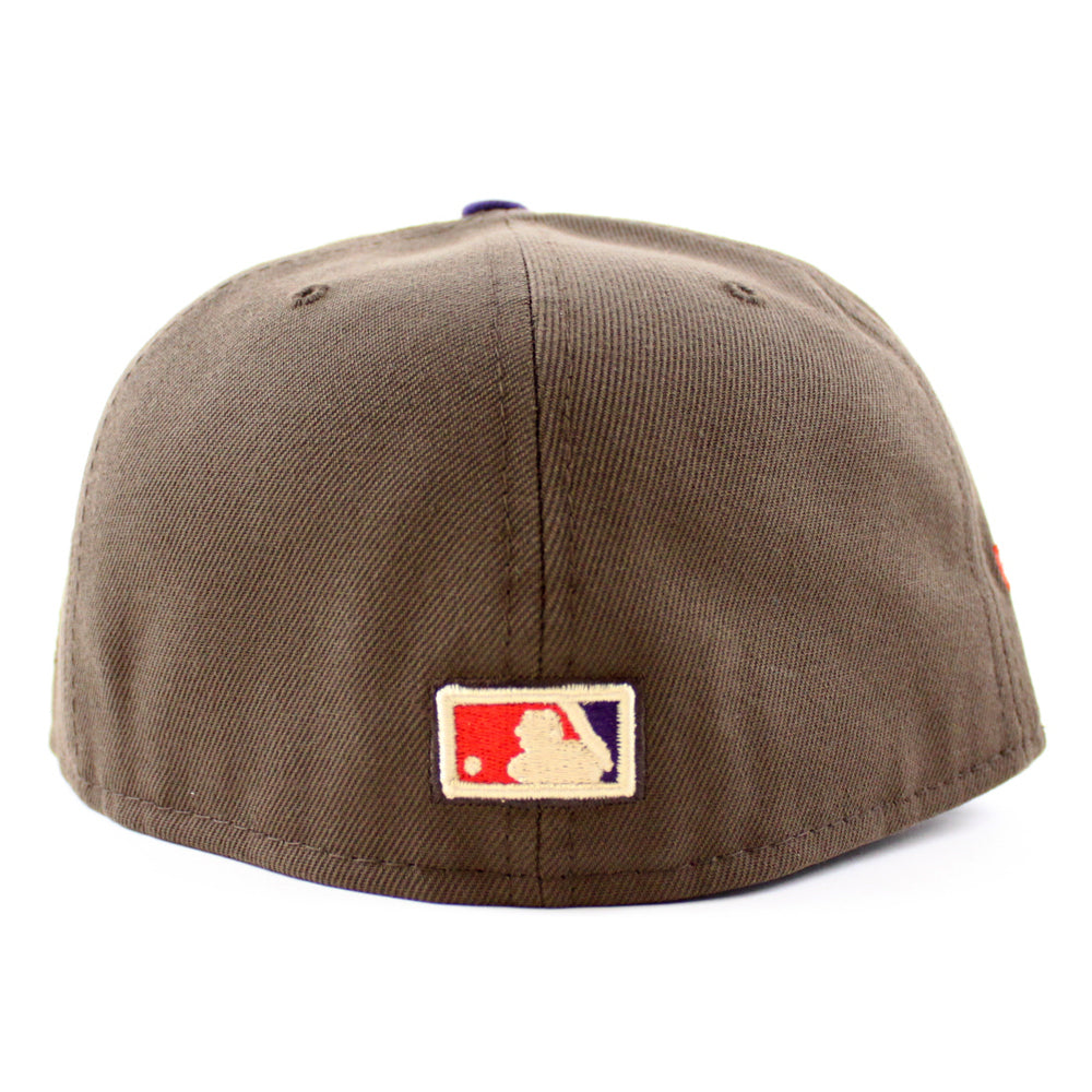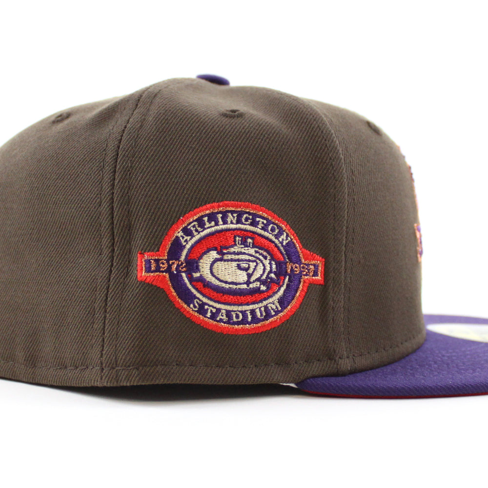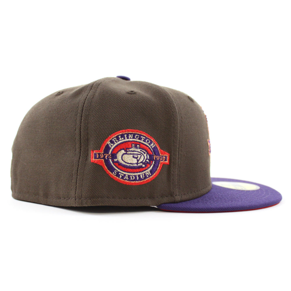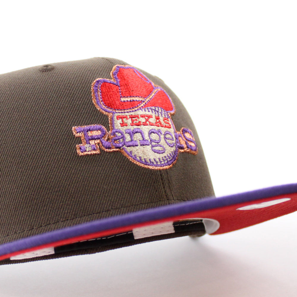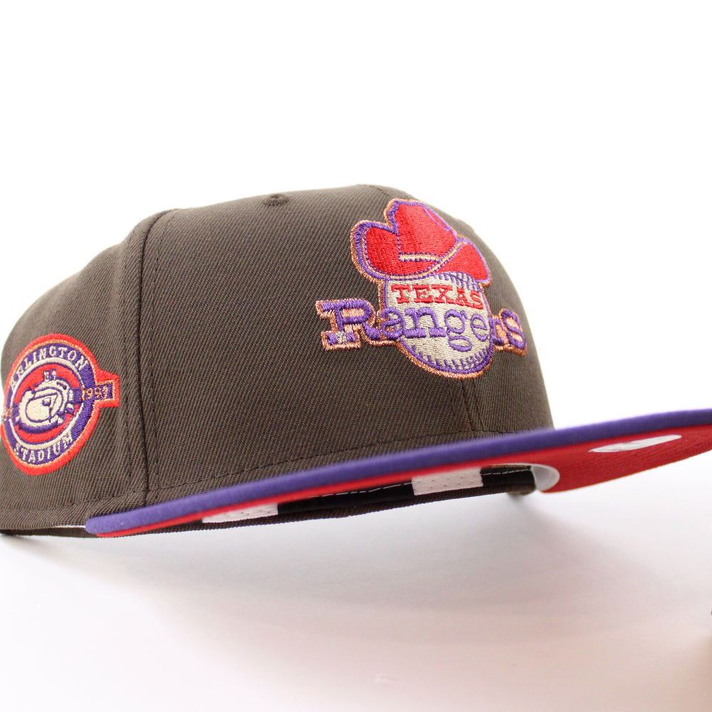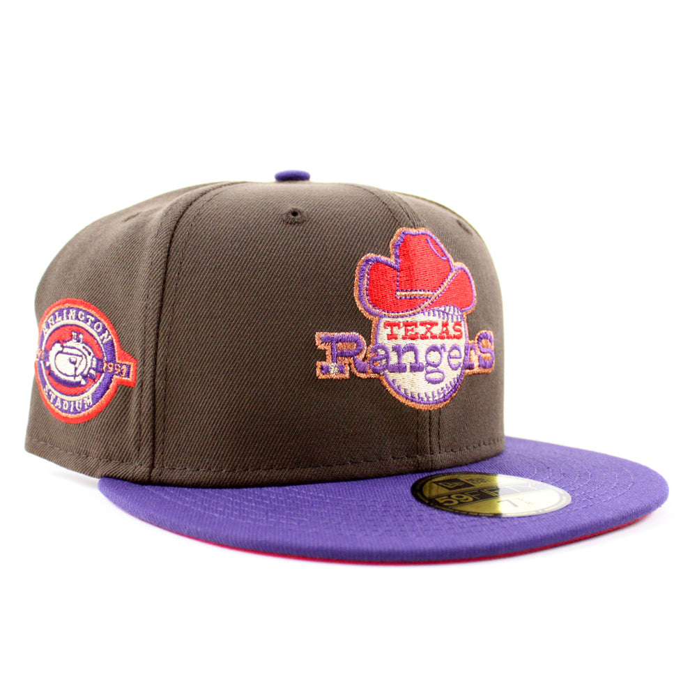 Texas Rangers Stadium patch New Era 59Fifty Fitted Hat in Walnut with Purple Visor and Red under brim.