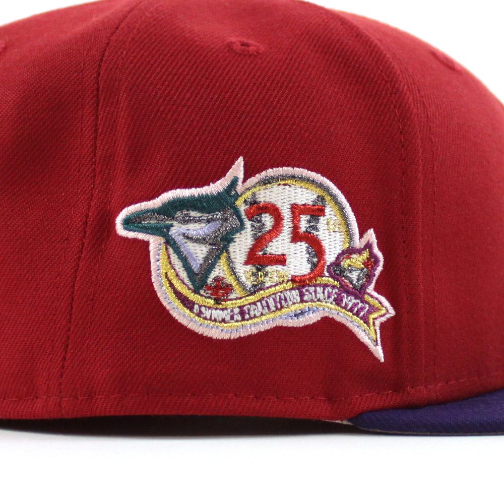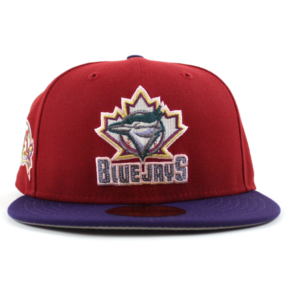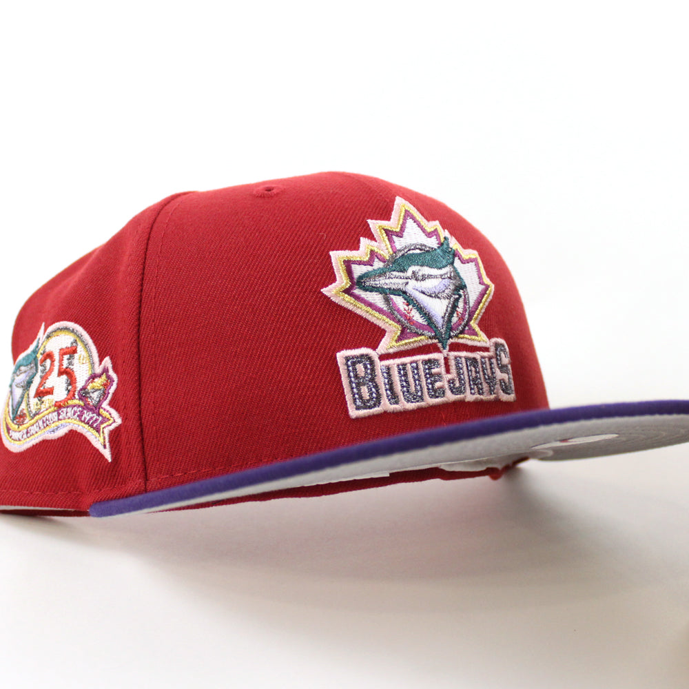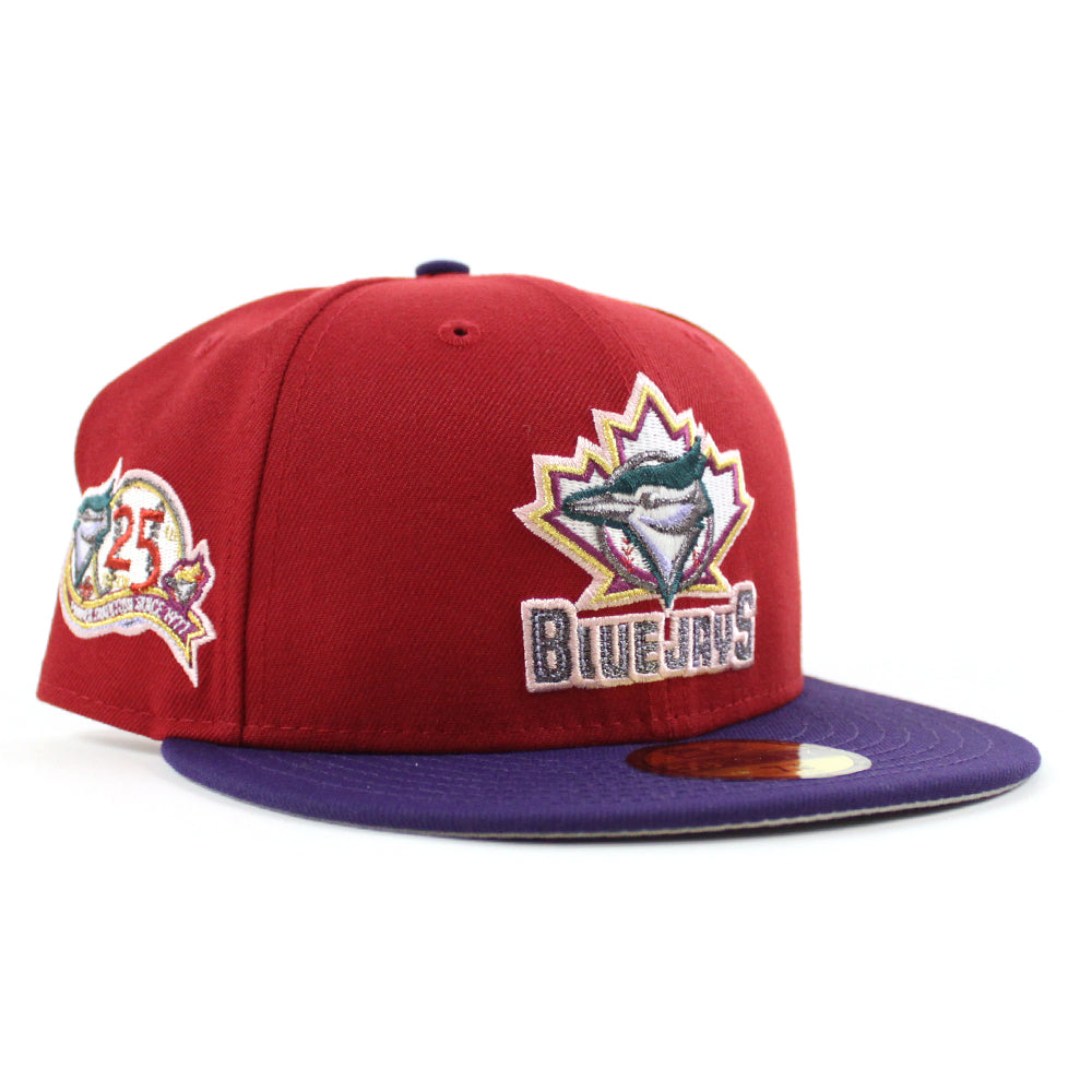 Toronto Blue Jays 25th Anniversary New Era 59Fifty Fitted Cap in Pinot Red, Purple and Gray Under Brim. 24