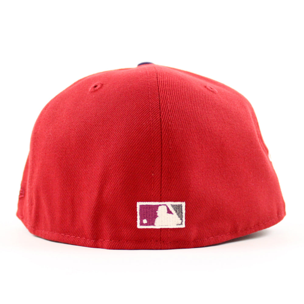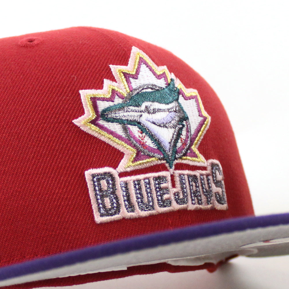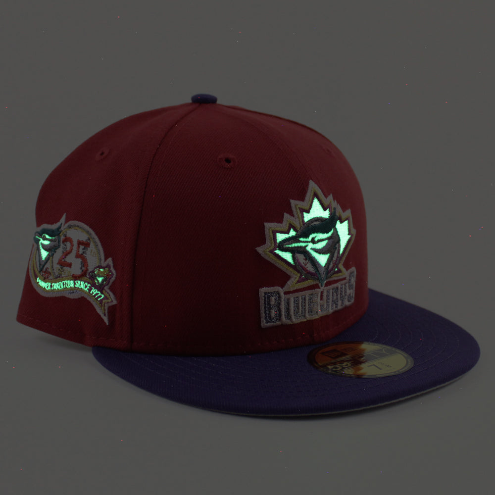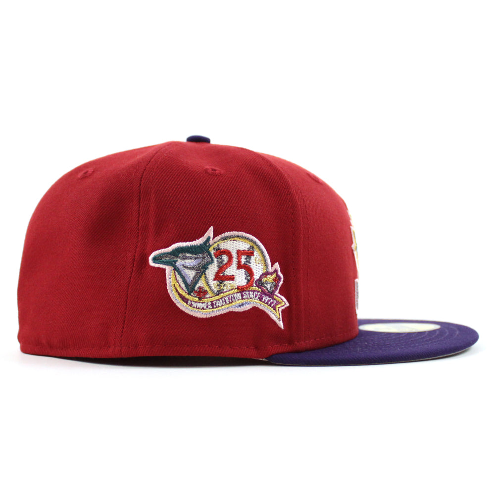 Toronto Blue Jays 25th Anniversary New Era 59Fifty Fitted Cap in Pinot Red, Purple and Gray Under Brim. 24