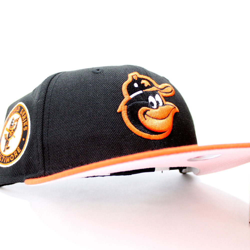 Baltimore Orioles 1966 World Series 59Fifty New Era Fitted Hat in Black, Orange & Pink Under Brim. Logo: Logo: Glow in the Dark