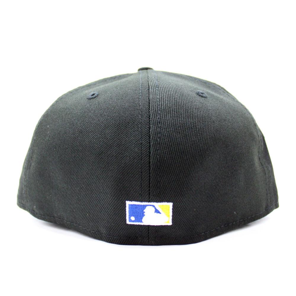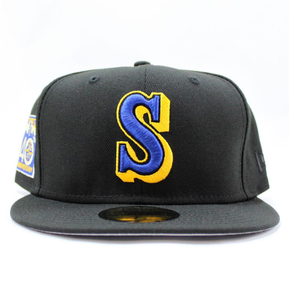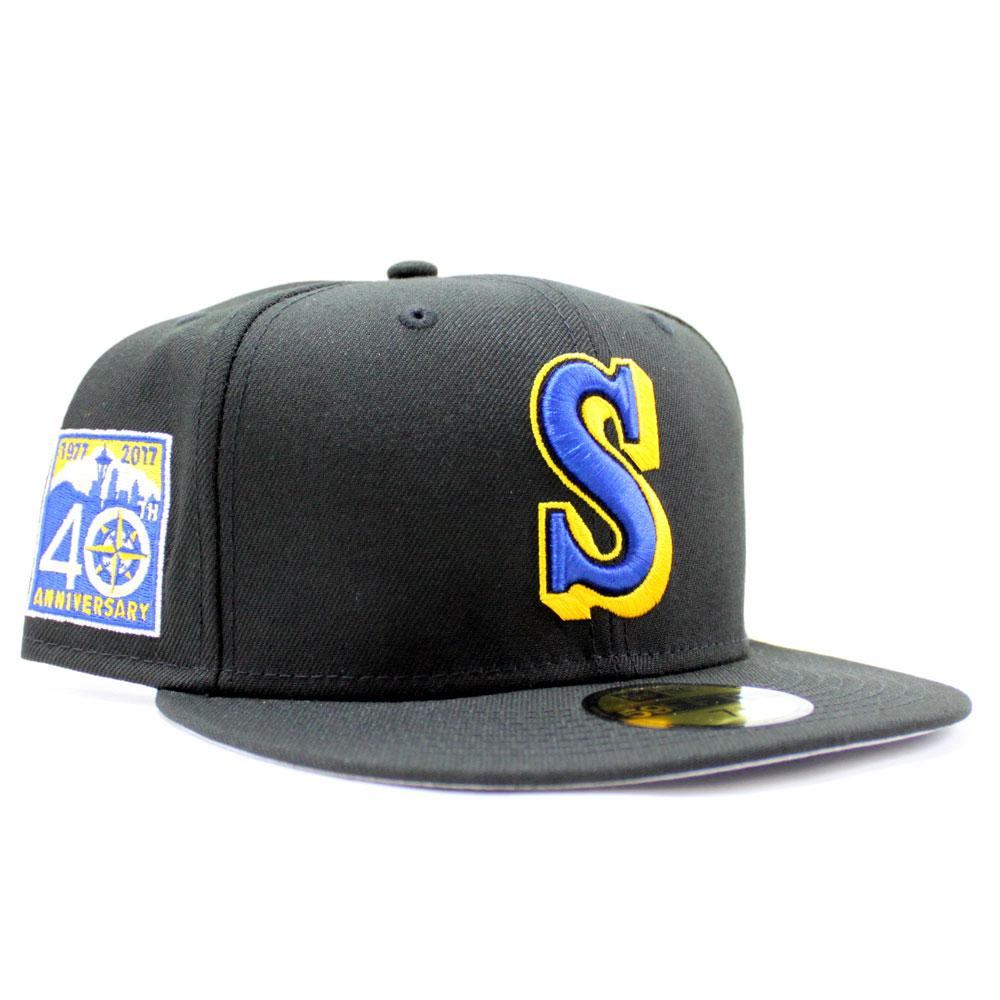 Seattle Mariners 40TH Anniversary New Era 59Fifty Fitted Hat is Black with Blue and Yellow Logo, and Grey Under Brim.