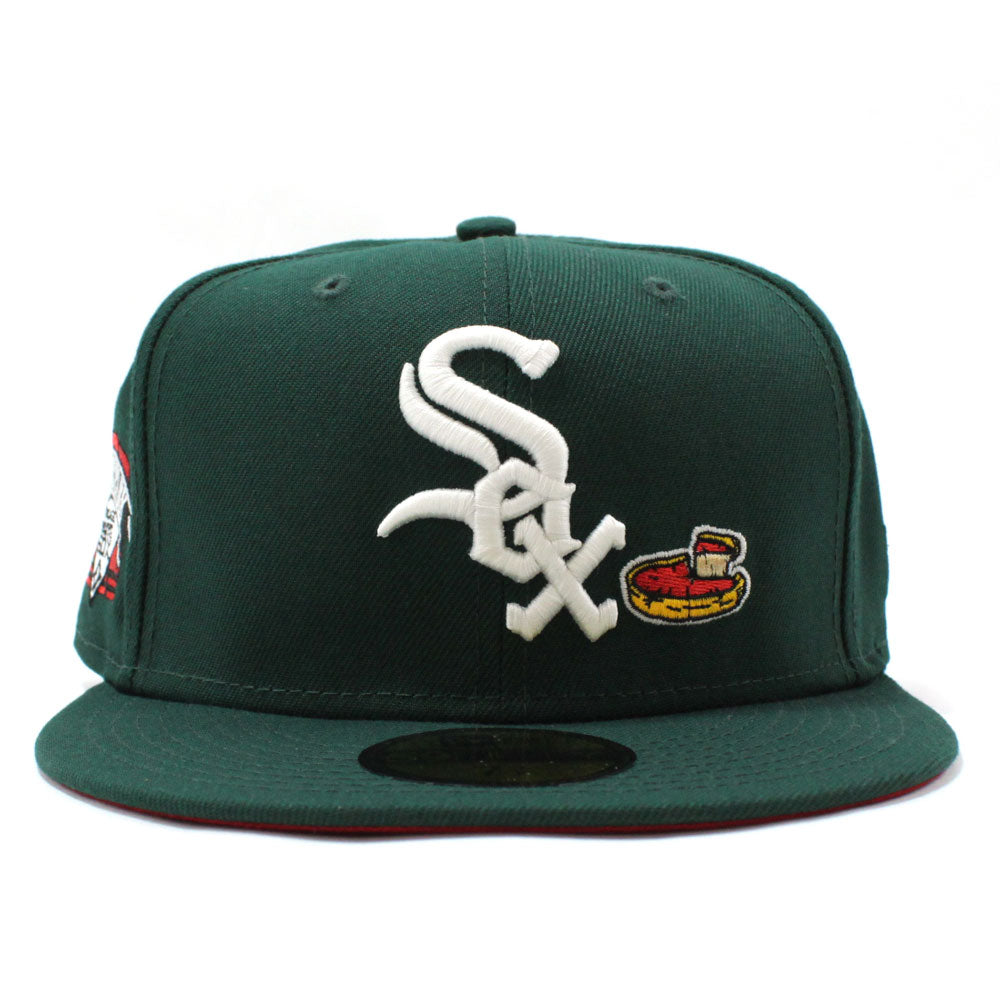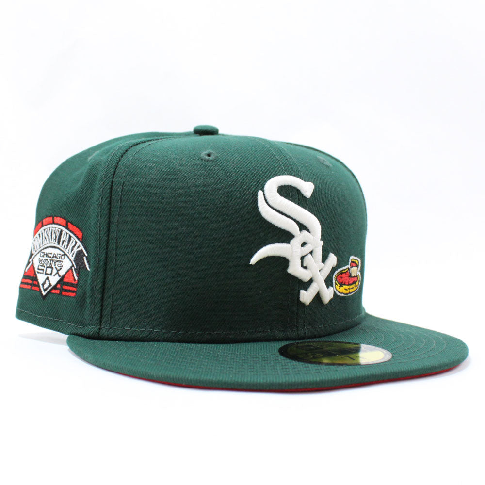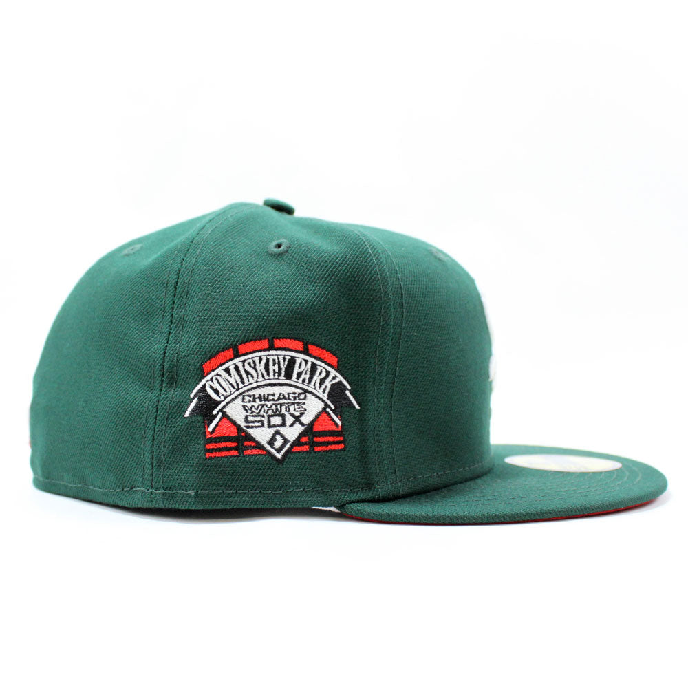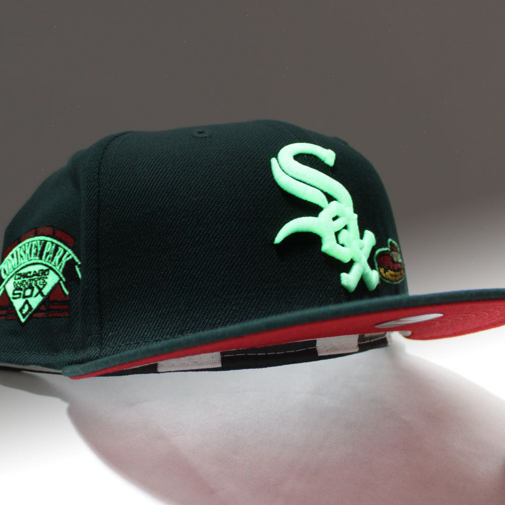 Chicago White Sox Deep Dish Comiskey Park Patch New Era Fitted 59Fifty Cap in Green & Red Under Brim.