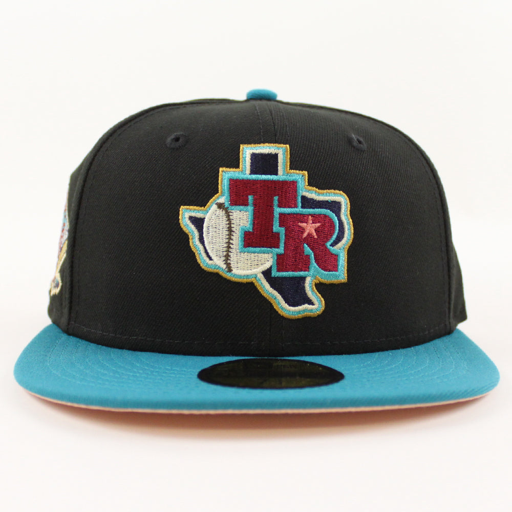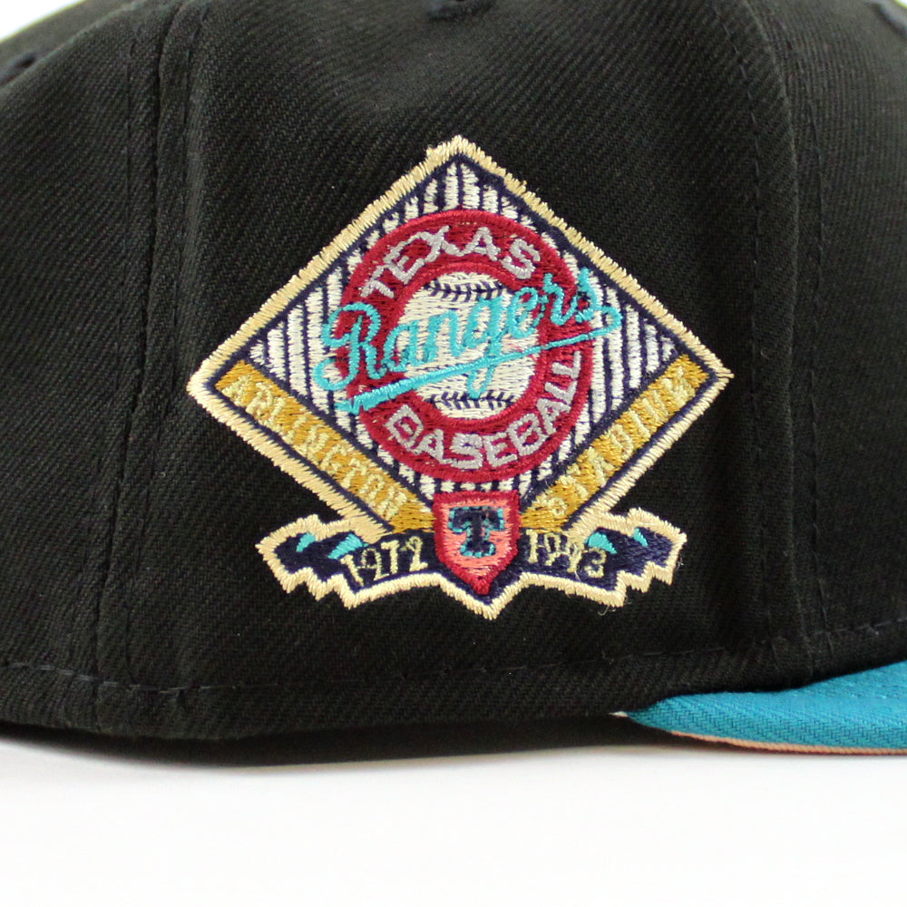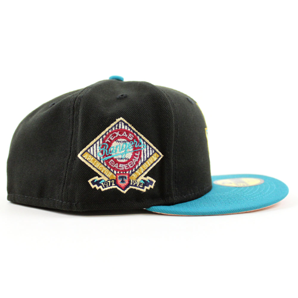 Texas Rangers Arlington Stadium New Era 59Fifty Fitted Cap in Black, Title Wave and Blush Sky under brim.