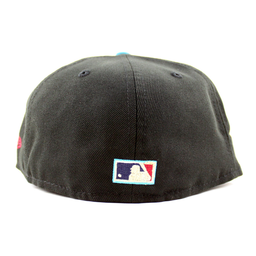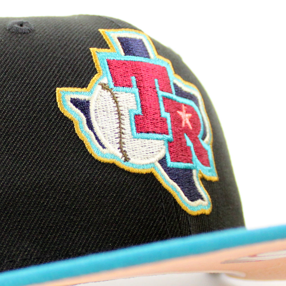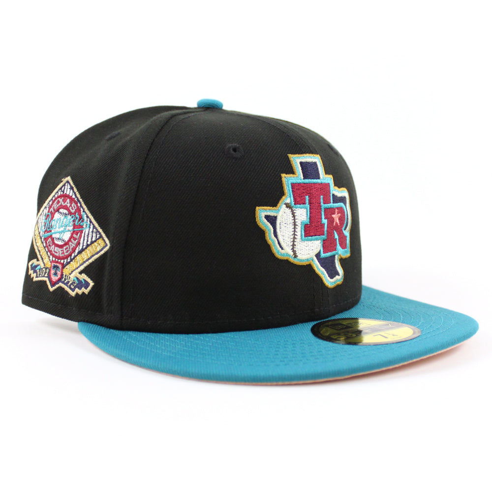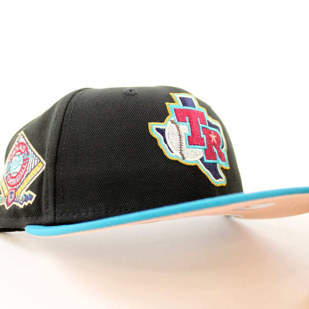 Texas Rangers Arlington Stadium New Era 59Fifty Fitted Cap in Black, Title Wave and Blush Sky under brim.