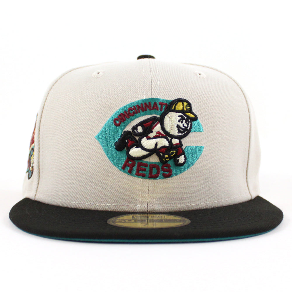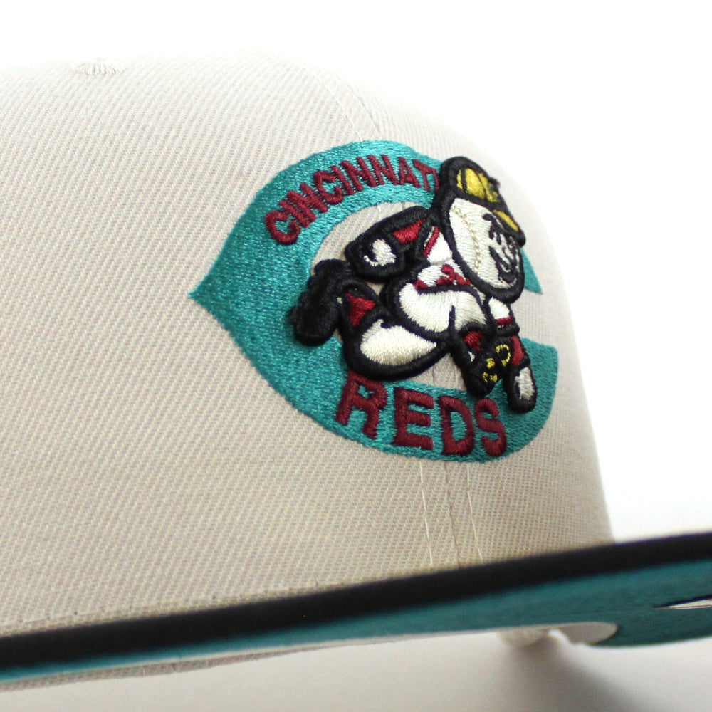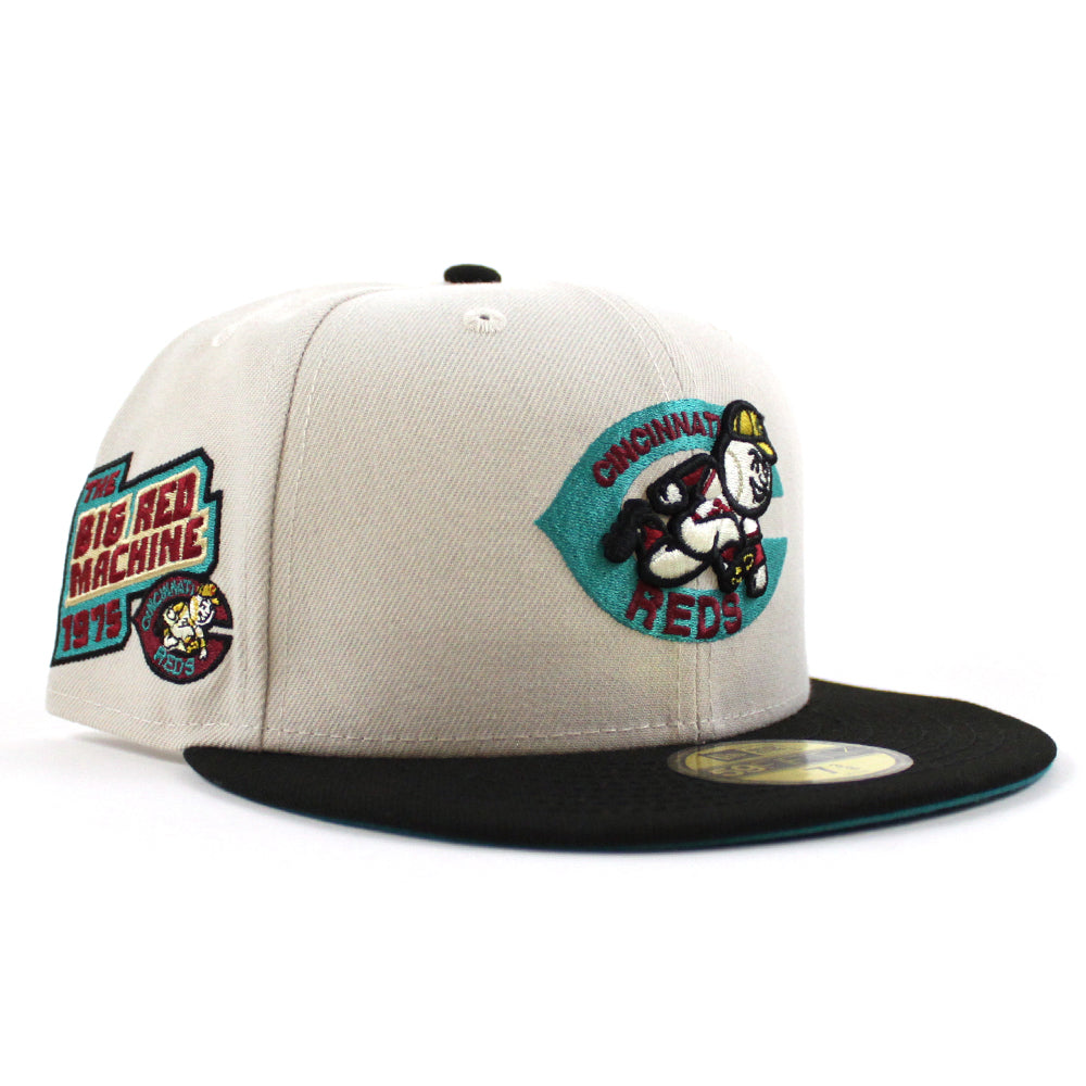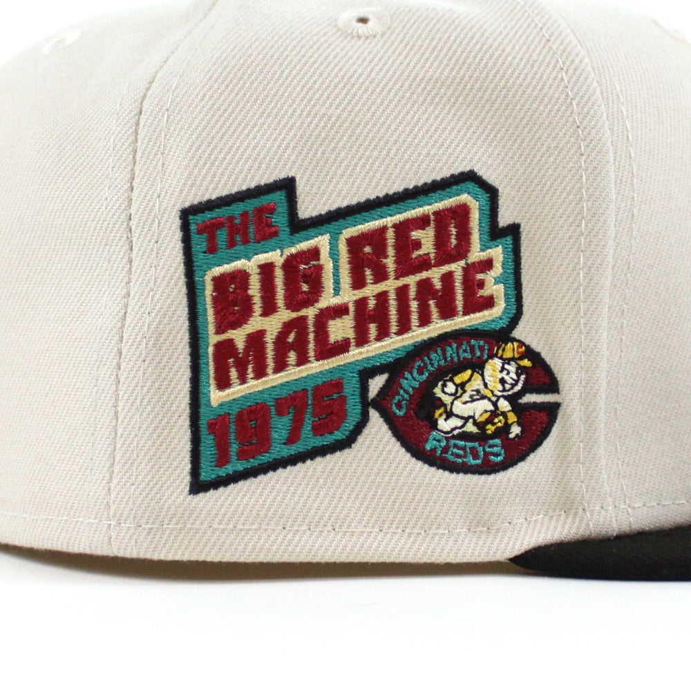 Cincinnati Reds 1975 BIG RED MACHINE New Era 59Fifty Fitted Cap in Stone, Black and Aqua Under Brim.