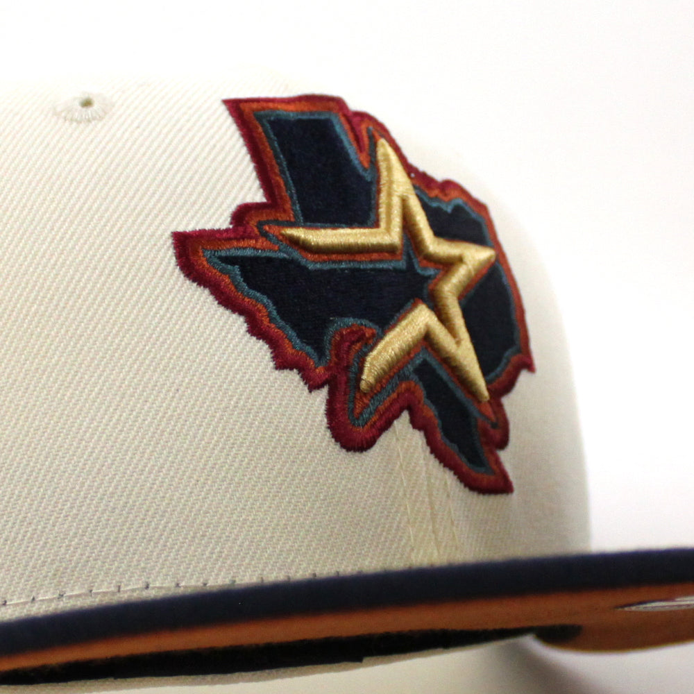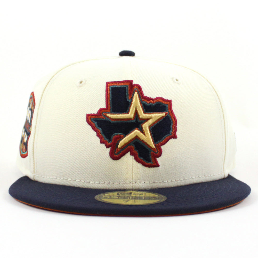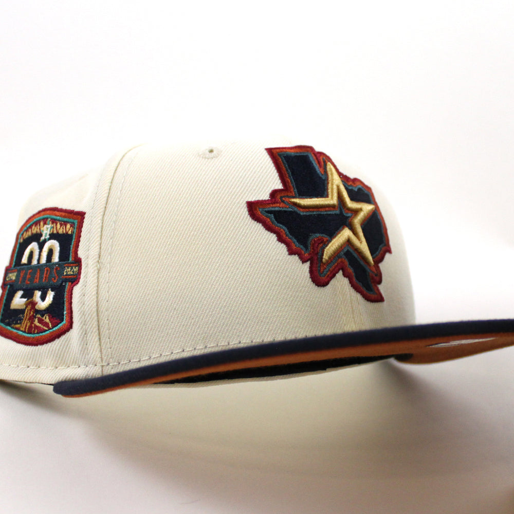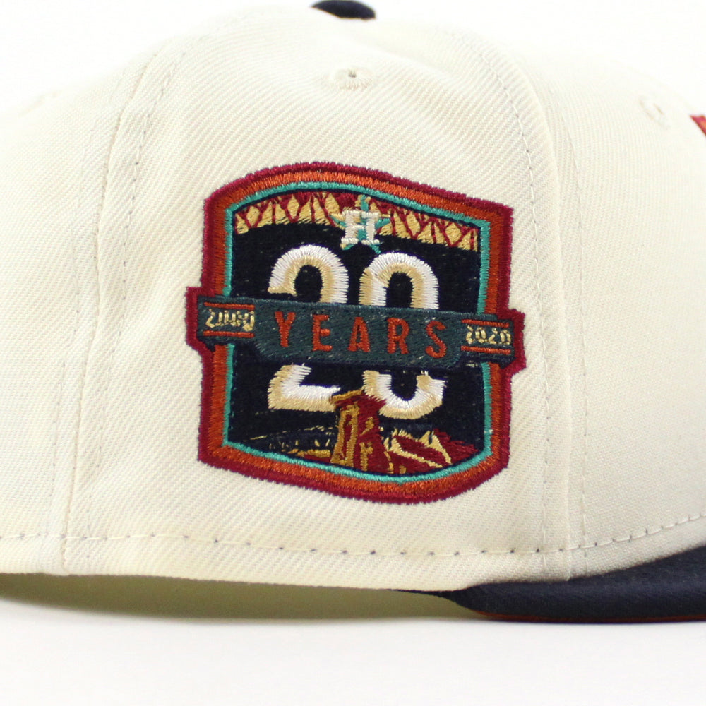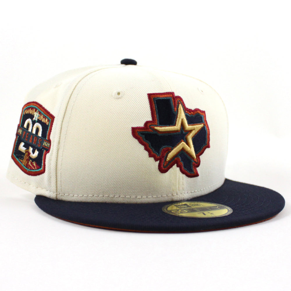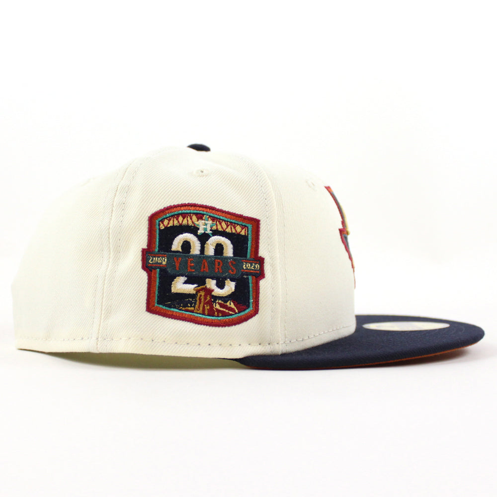 Houston Astros 20 YEARS New Era 59Fifty Fitted Hat in Chrome White, Night Shift Navy and Rust Orange Under Brim.
