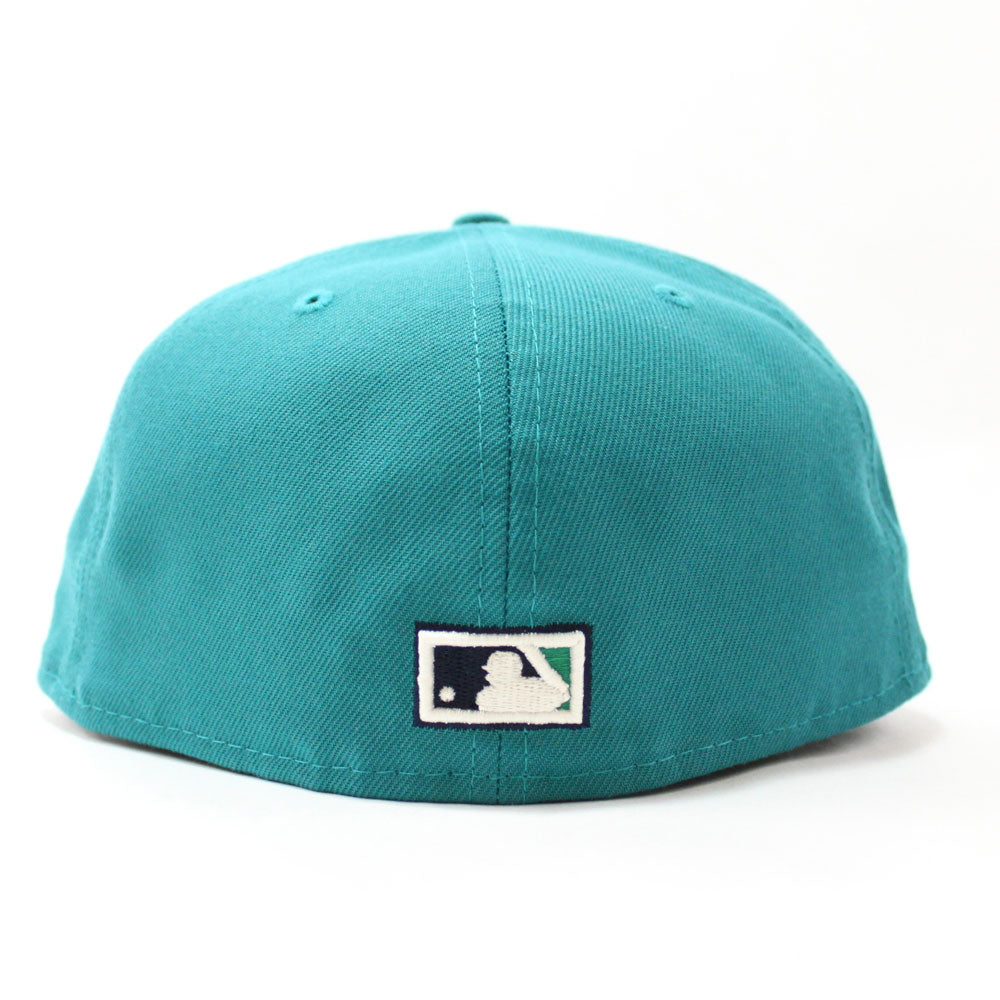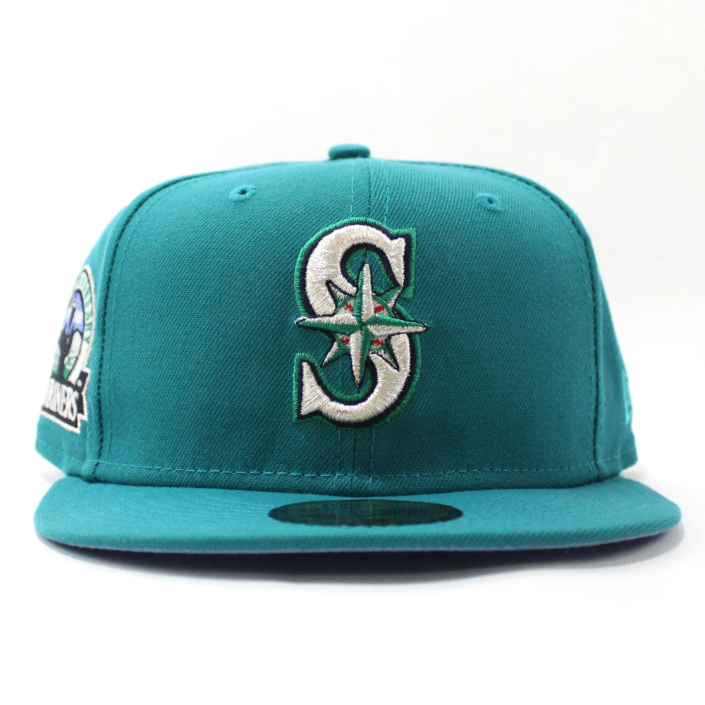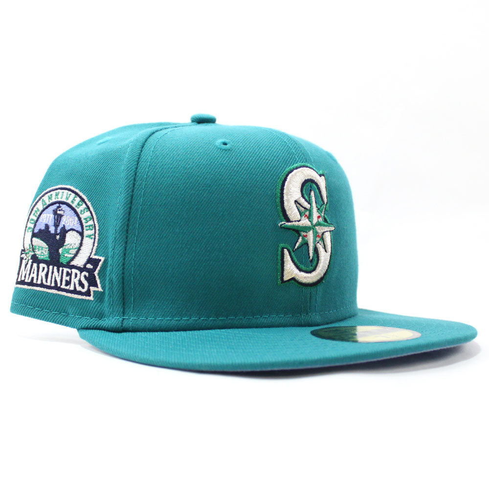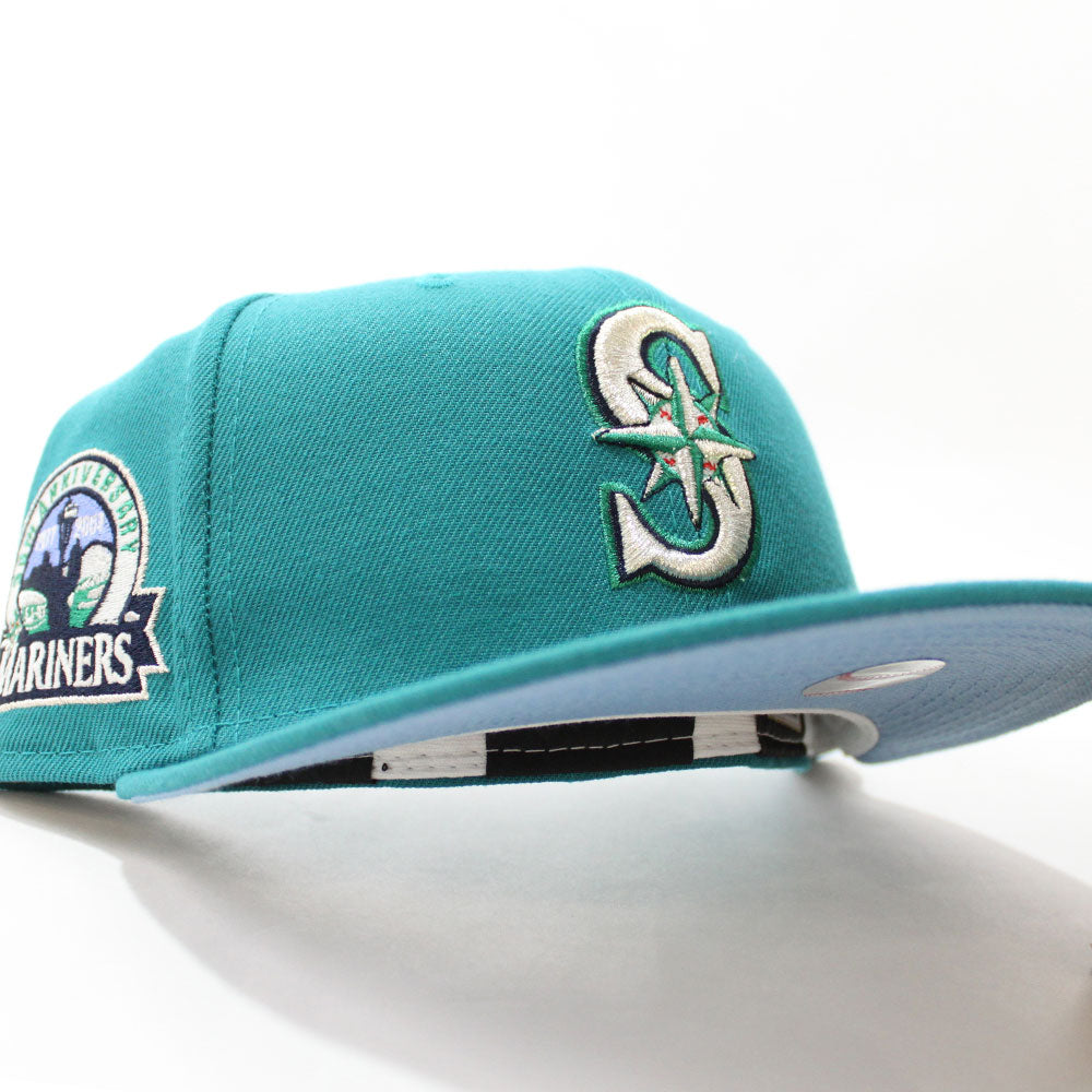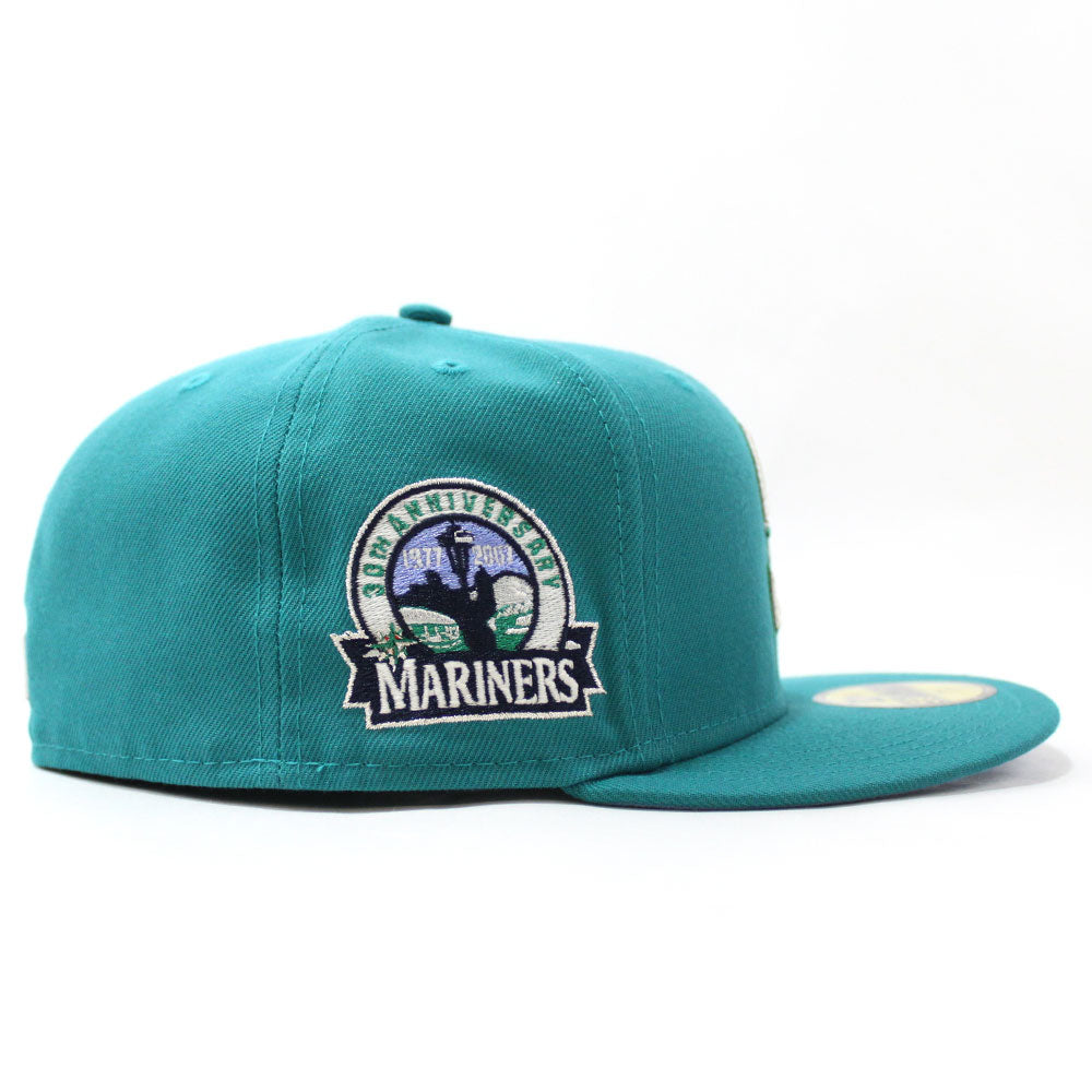 Seattle Mariners 30th Anniversary New Era 59Fifty Fitted Hat is Aqua with Sky Blue Under Brim.