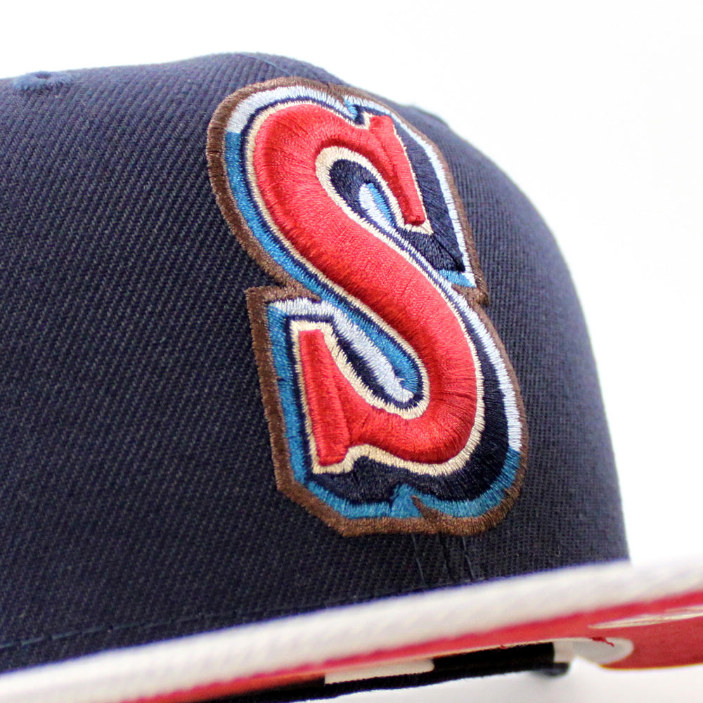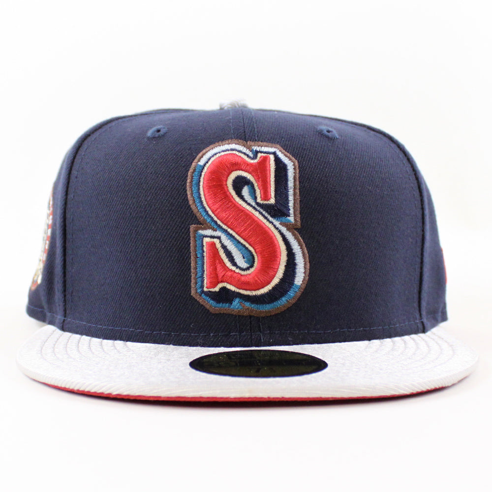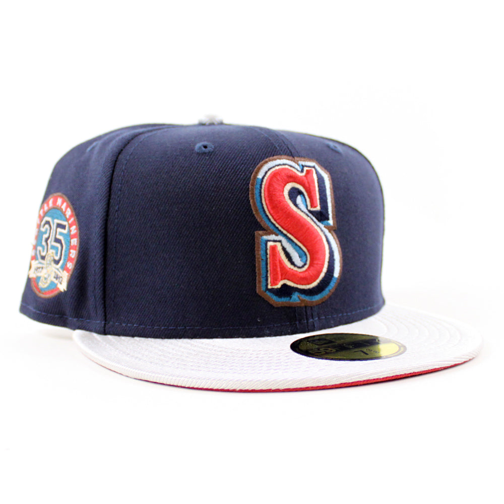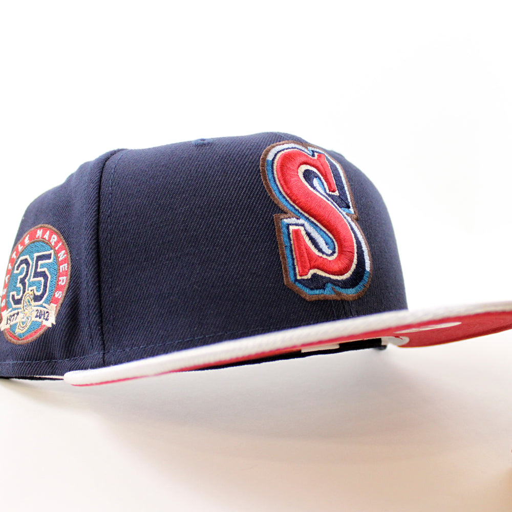Seattle Mariners 35th Anniversary New Era 59Fifty Fitted Hat in Night Shift Navy, Metallic Silver and Pinot Red Under Brim.