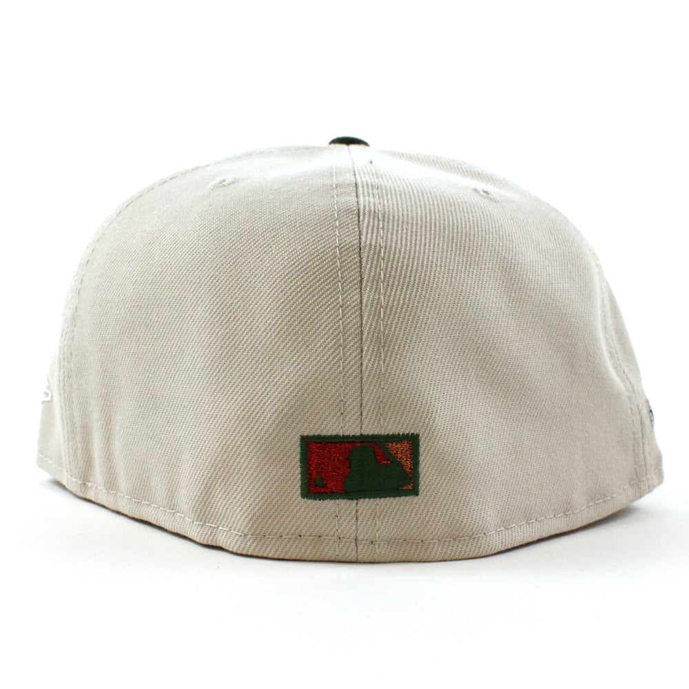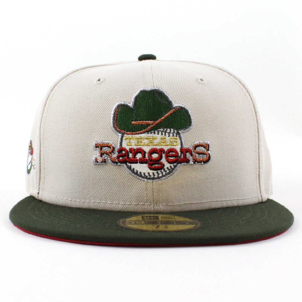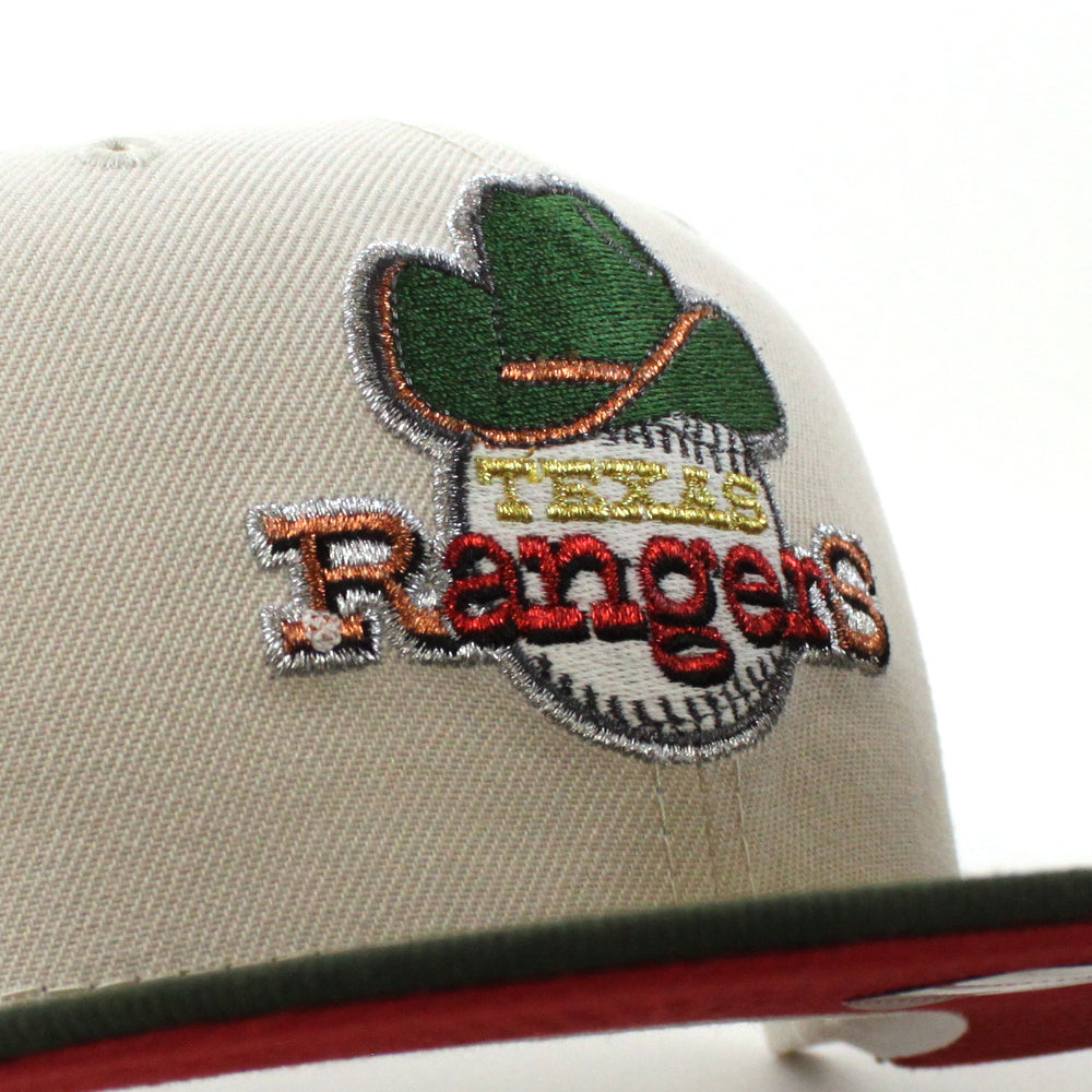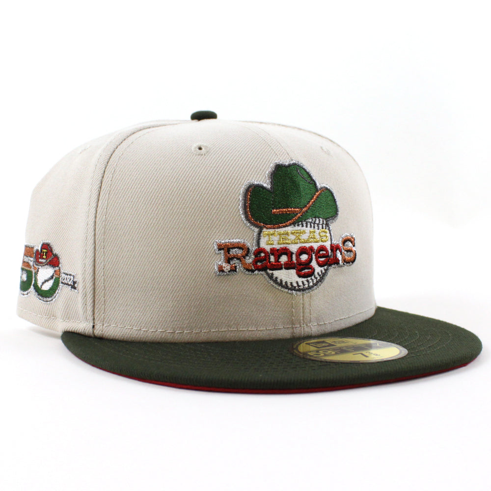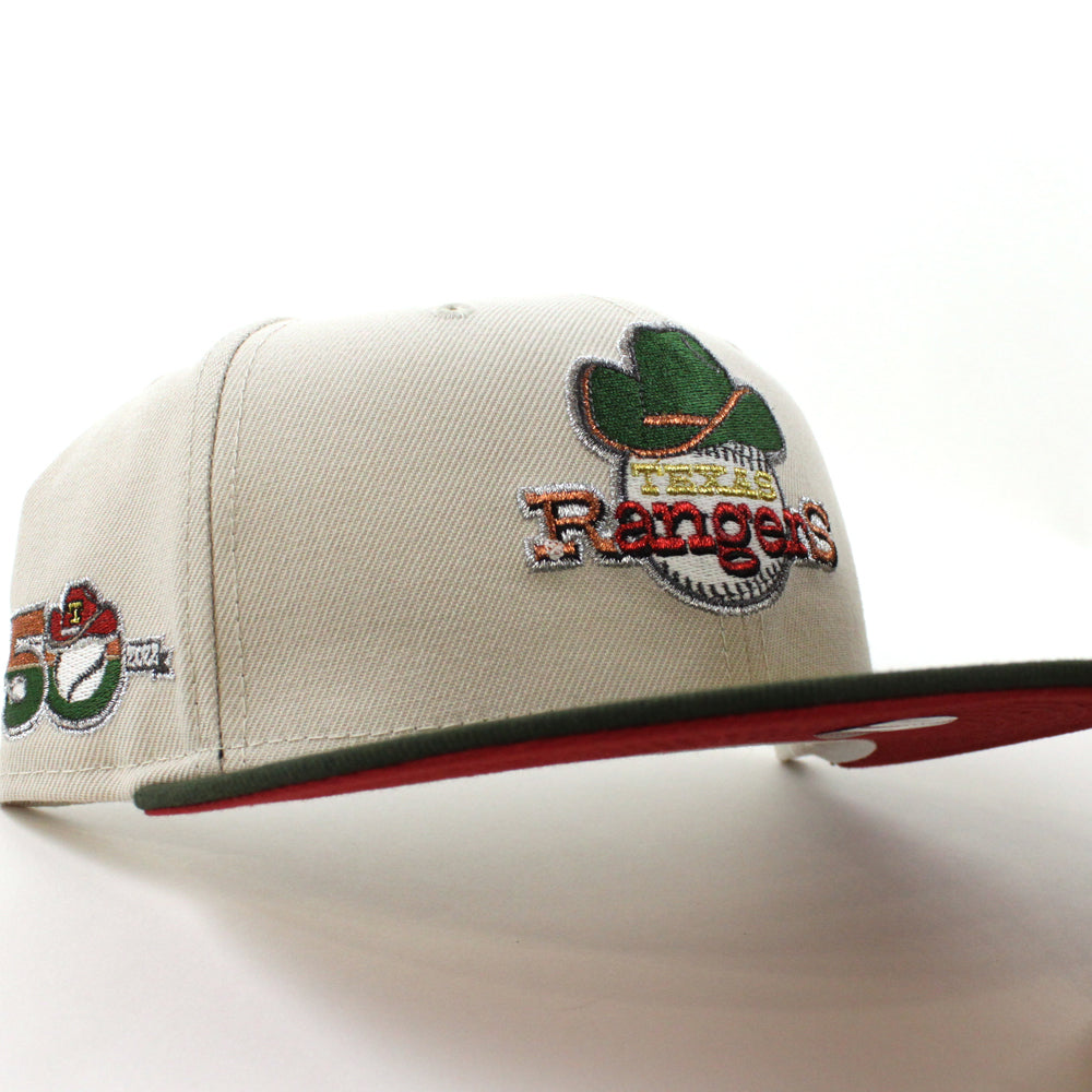 Texas Rangers 50th Anniversary New Era 59Fifty Fitted Cap in Stone, SeaWeed and Pinot under brim.