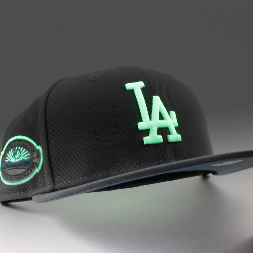 Los Angeles Dodger Stadium 50th Anniversary New Era 59Fifty Fitted Hat (GITD Storm Gray Sky Blue Under Brim)
