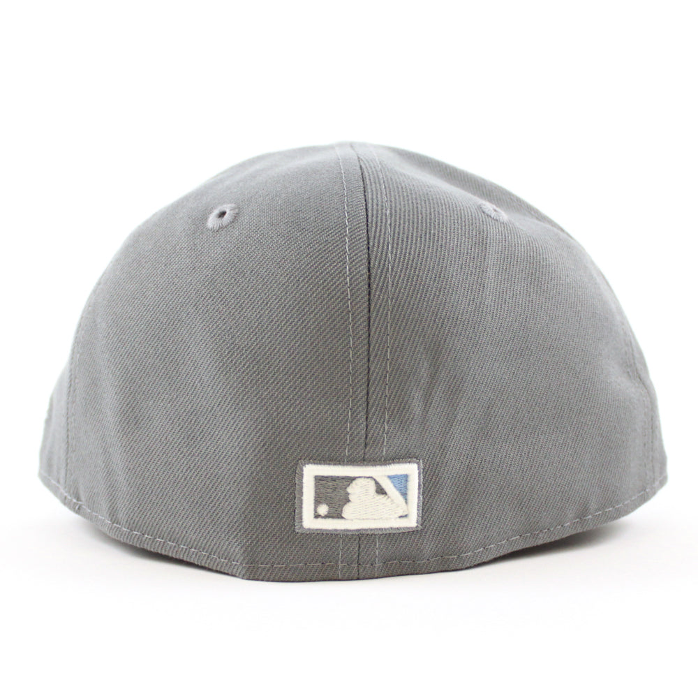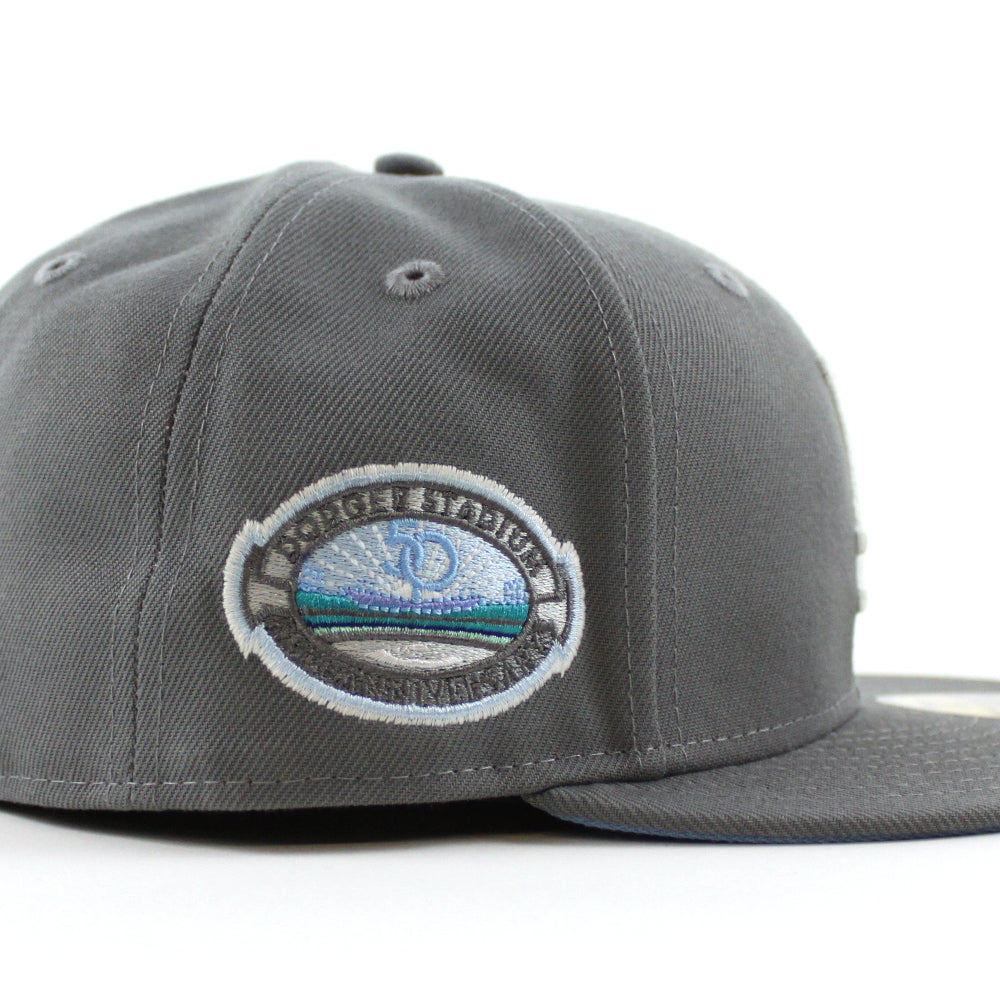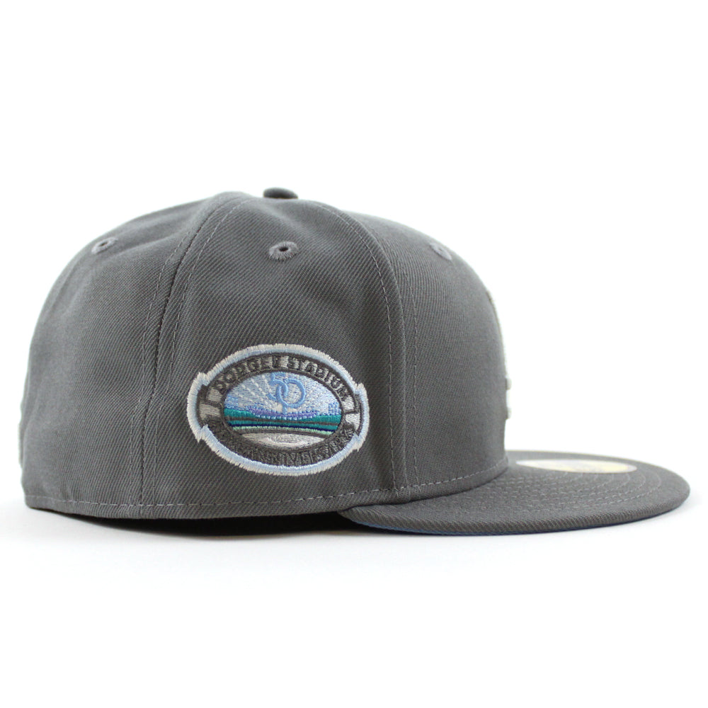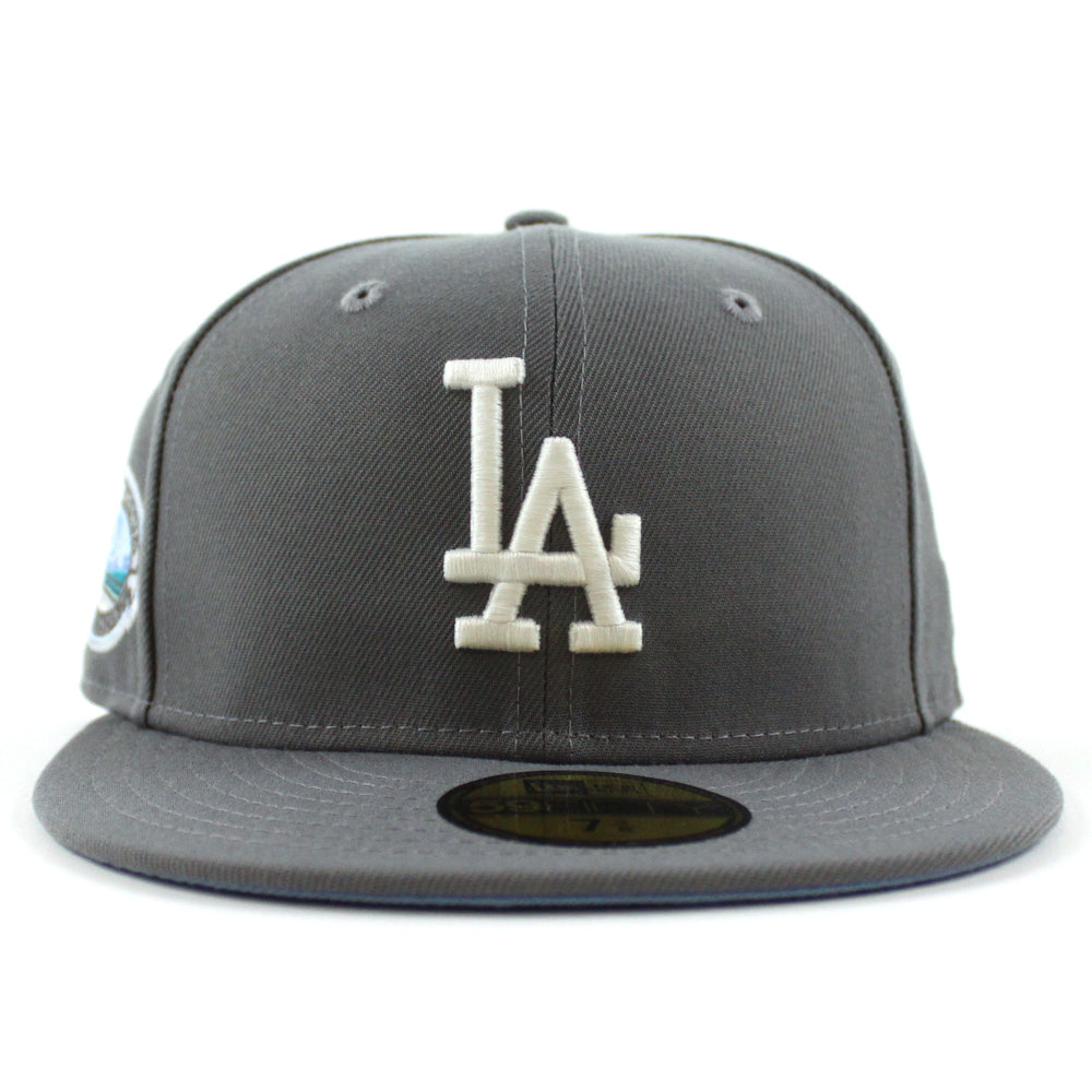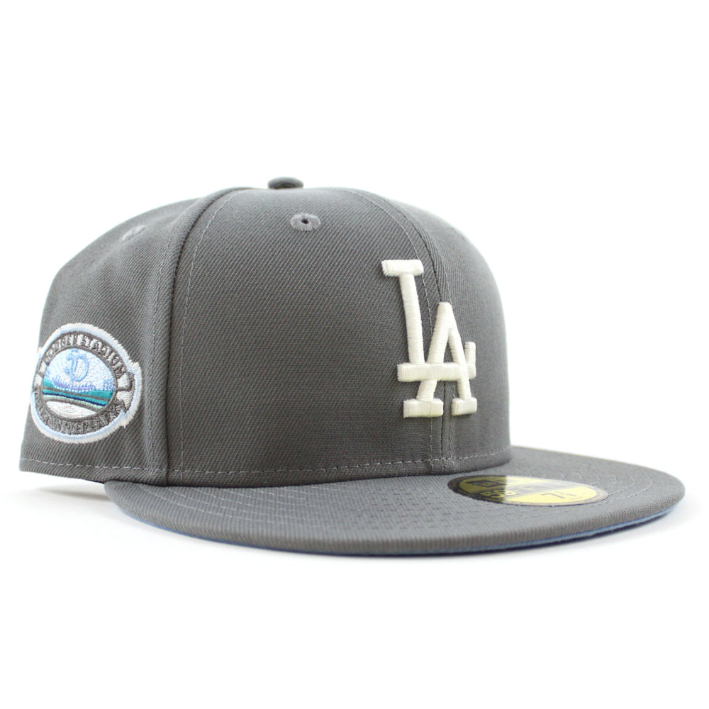 Los Angeles Dodger Stadium 50th Anniversary New Era 59Fifty Fitted Hat in Storm Gray with Sky Blue Under Brim.