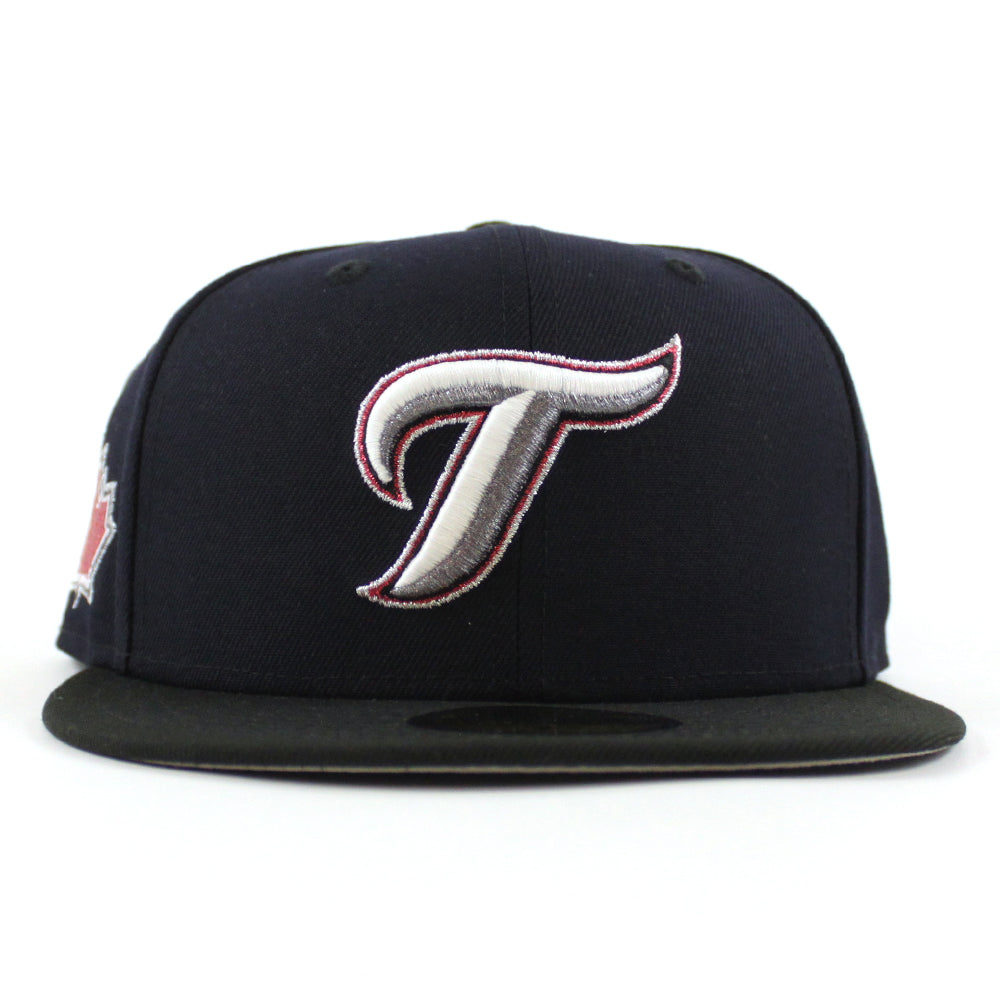 Toronto Blue Jays Maple Leaf Patch New Era 59Fifty Fitted Cap in Navy, Black and Gray Under Brim.