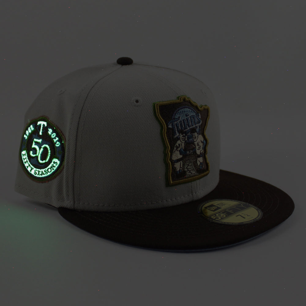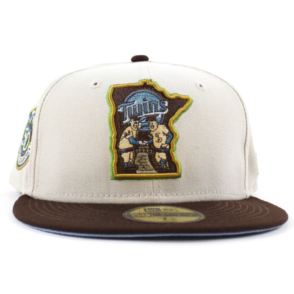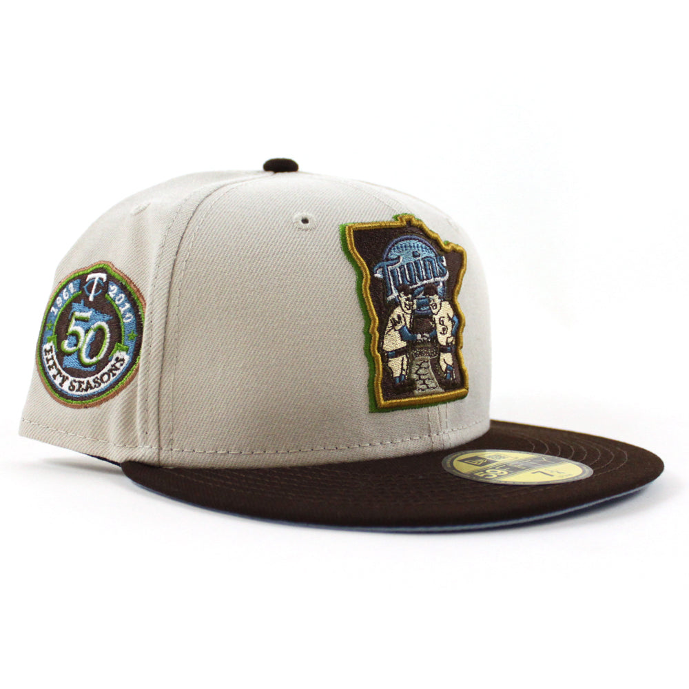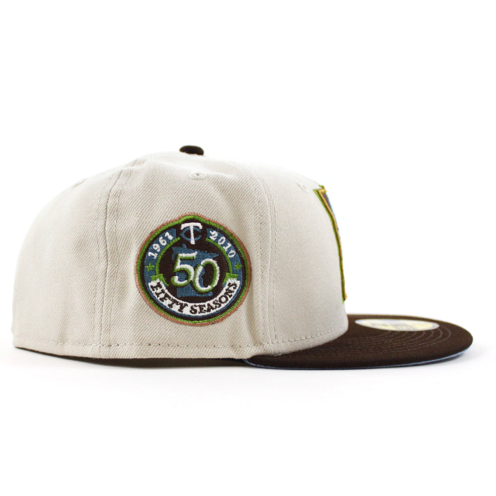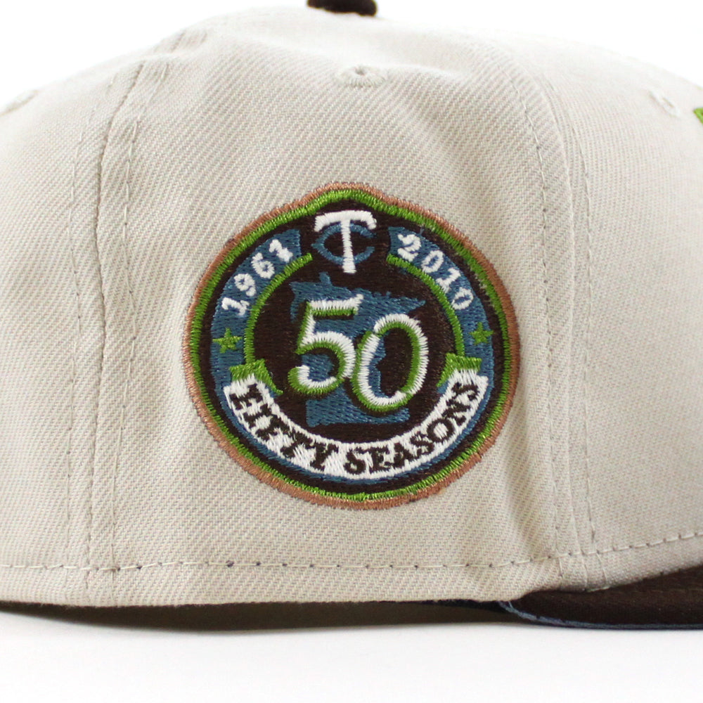 Minnesota Twins Fifty Seasons New Era Fitted Hat in Stone, Burnt Wood and Birdseye Blue Under Brim. 16