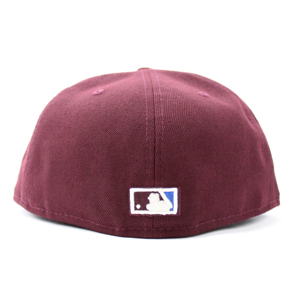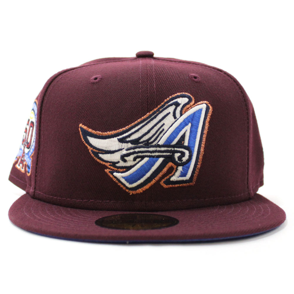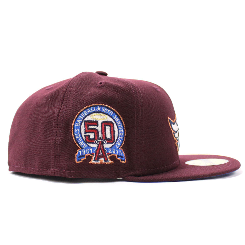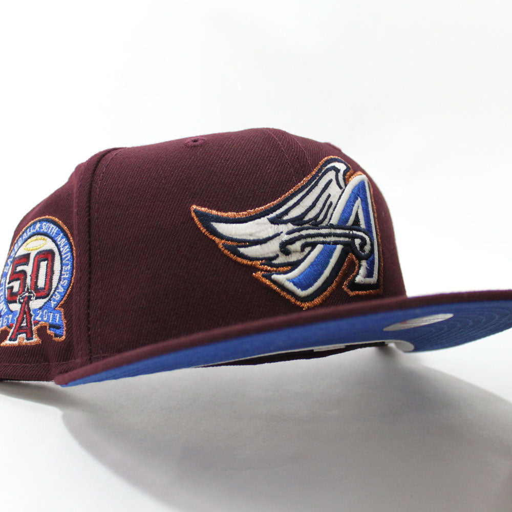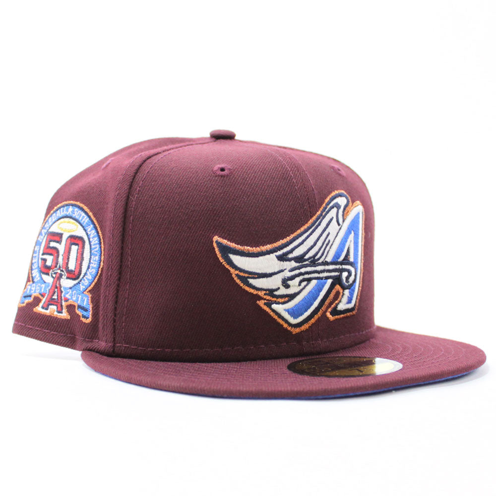 Anaheim Angels 50th Anniversary New Era 59Fifty Fitted Hat is Maroon & Blue Under Brim.