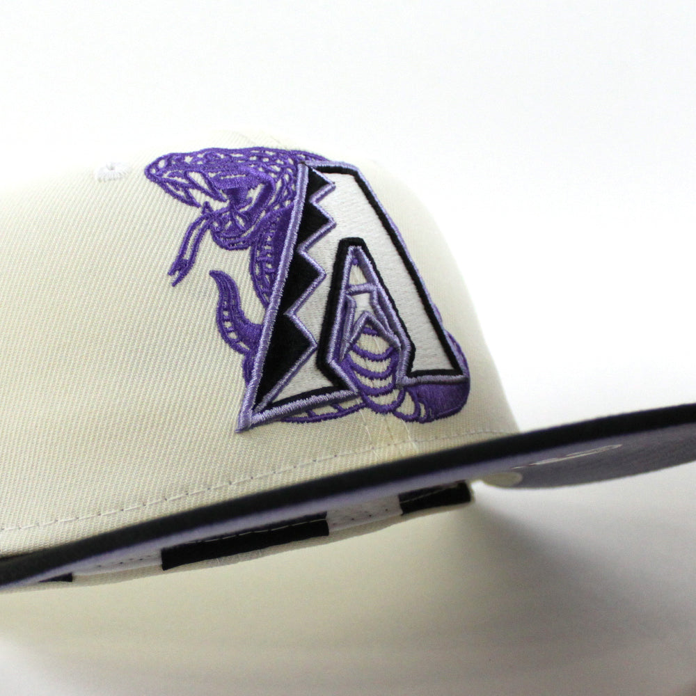 Arizona Diamondbacks 2001 World Series New Era 59Fifty Fitted Hat in Chrome White, Black & Lavender Under Brim.