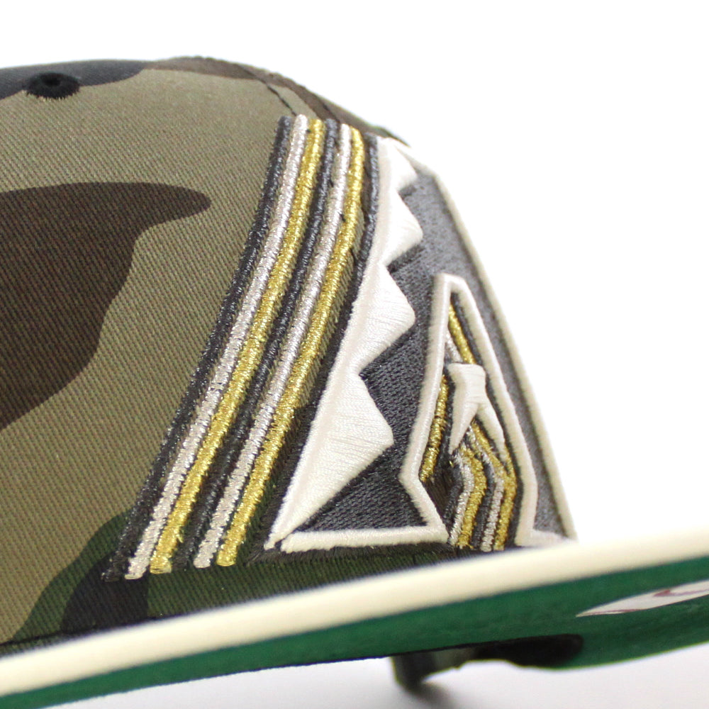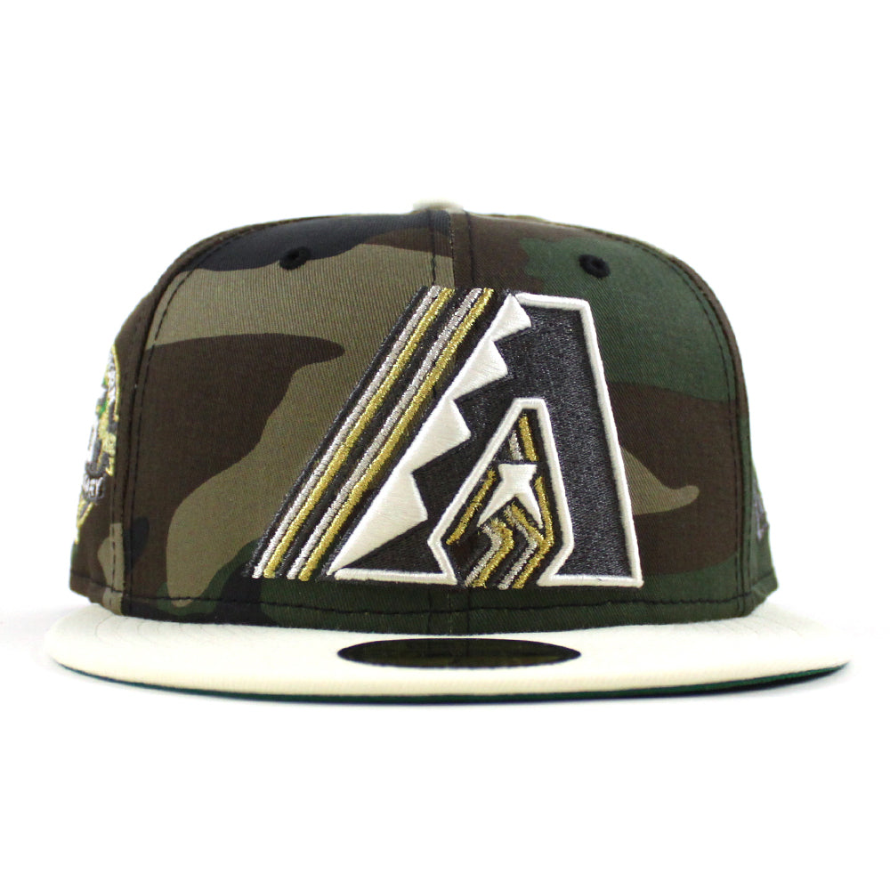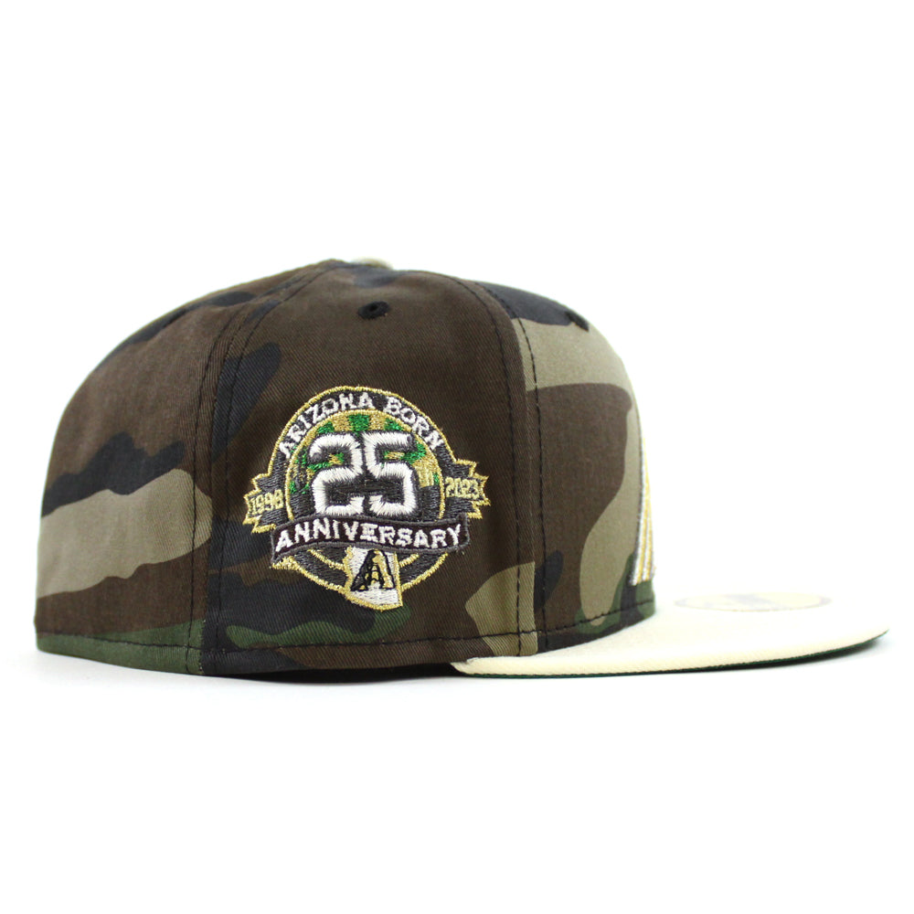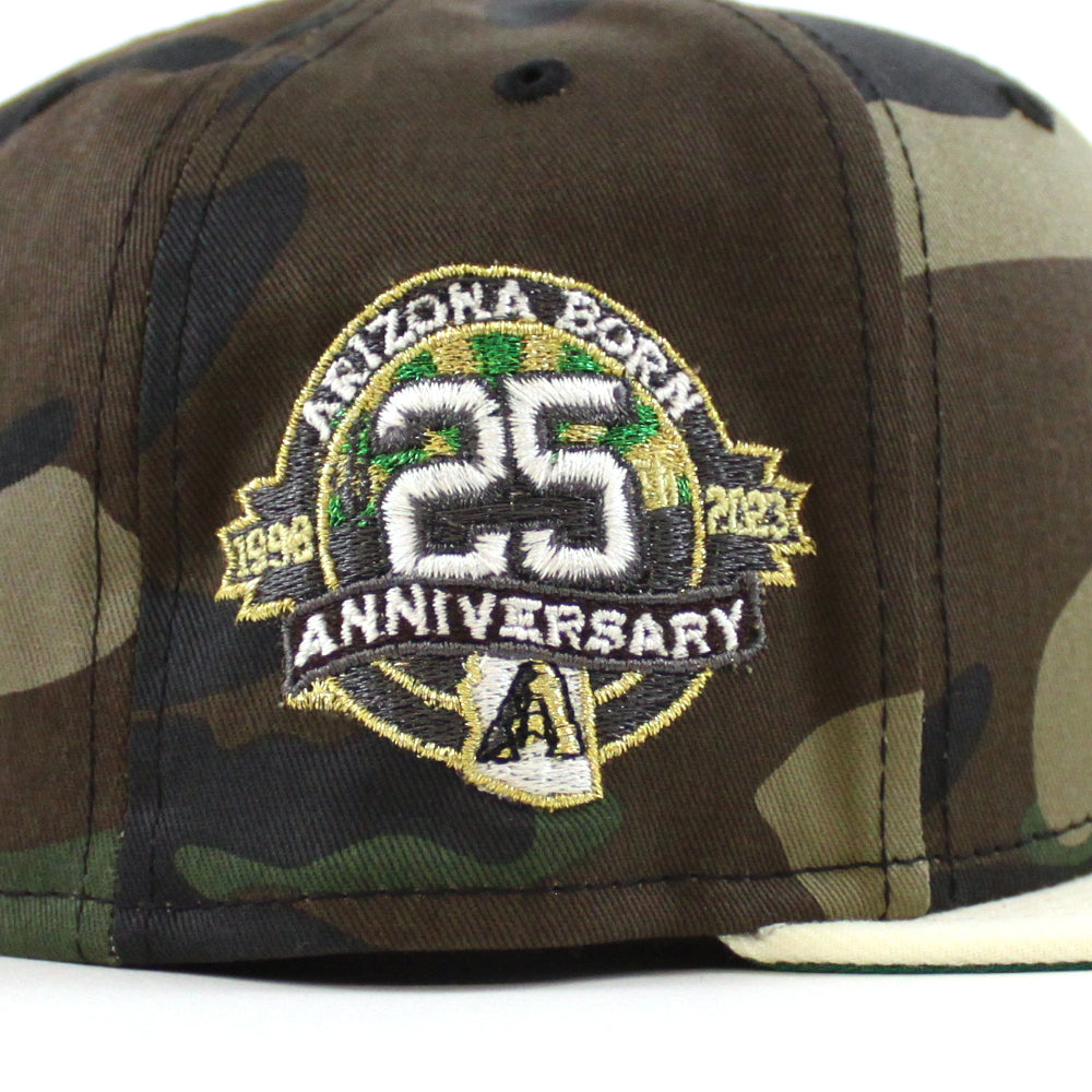 Arizona Diamondbacks 25th Anniversary New Era 59Fifty Fitted Hat in WoodLand Camo, Chrome White and Green Under Brim. 26