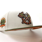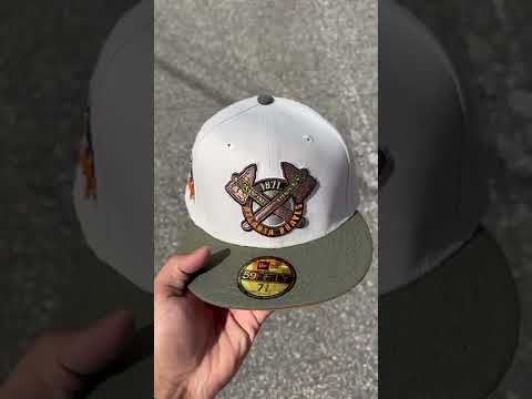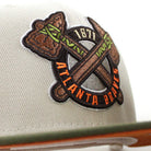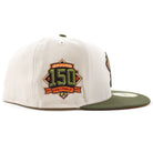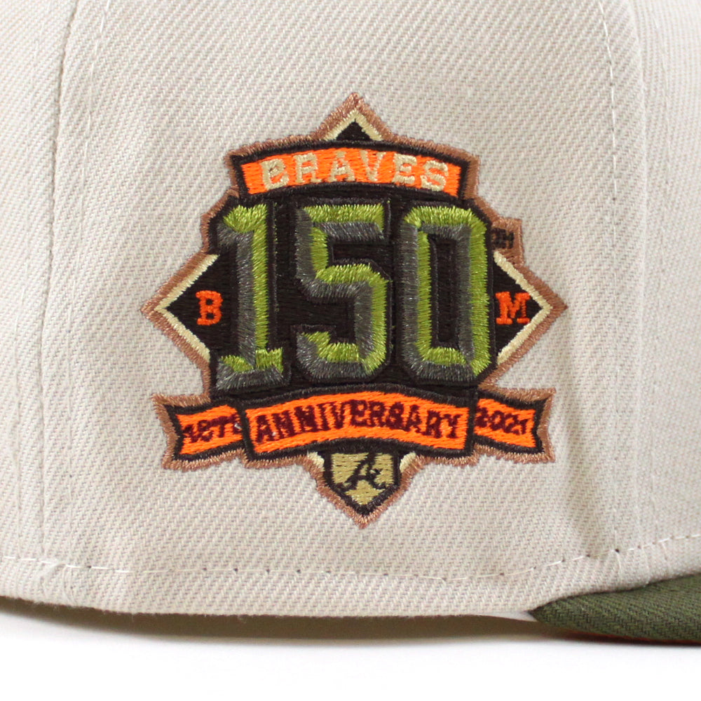 Atlanta Braves 150th Anniversary New Era 59Fifty Fitted Cap in Stone, New Olive and Fight Orange Under Brim.