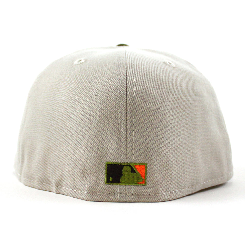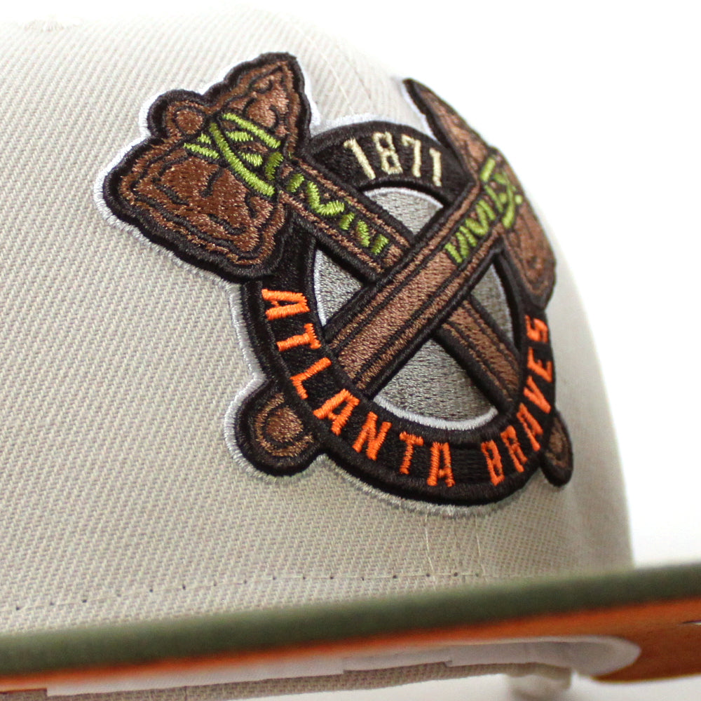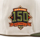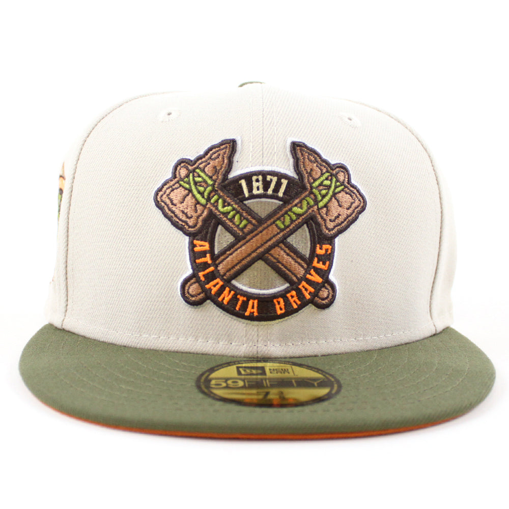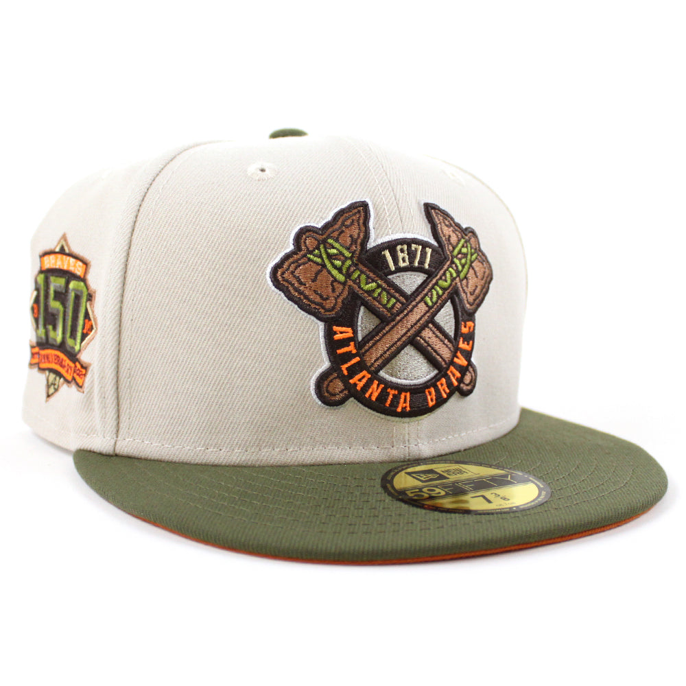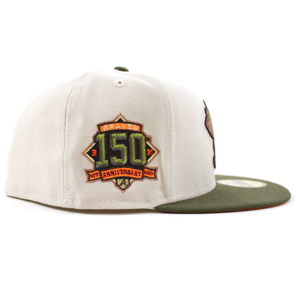 Atlanta Braves 150TH ANNIVERSARY New Era 59Fifty Fitted Hat (STONE NEW OLIVE Fight Orange Under Brim)